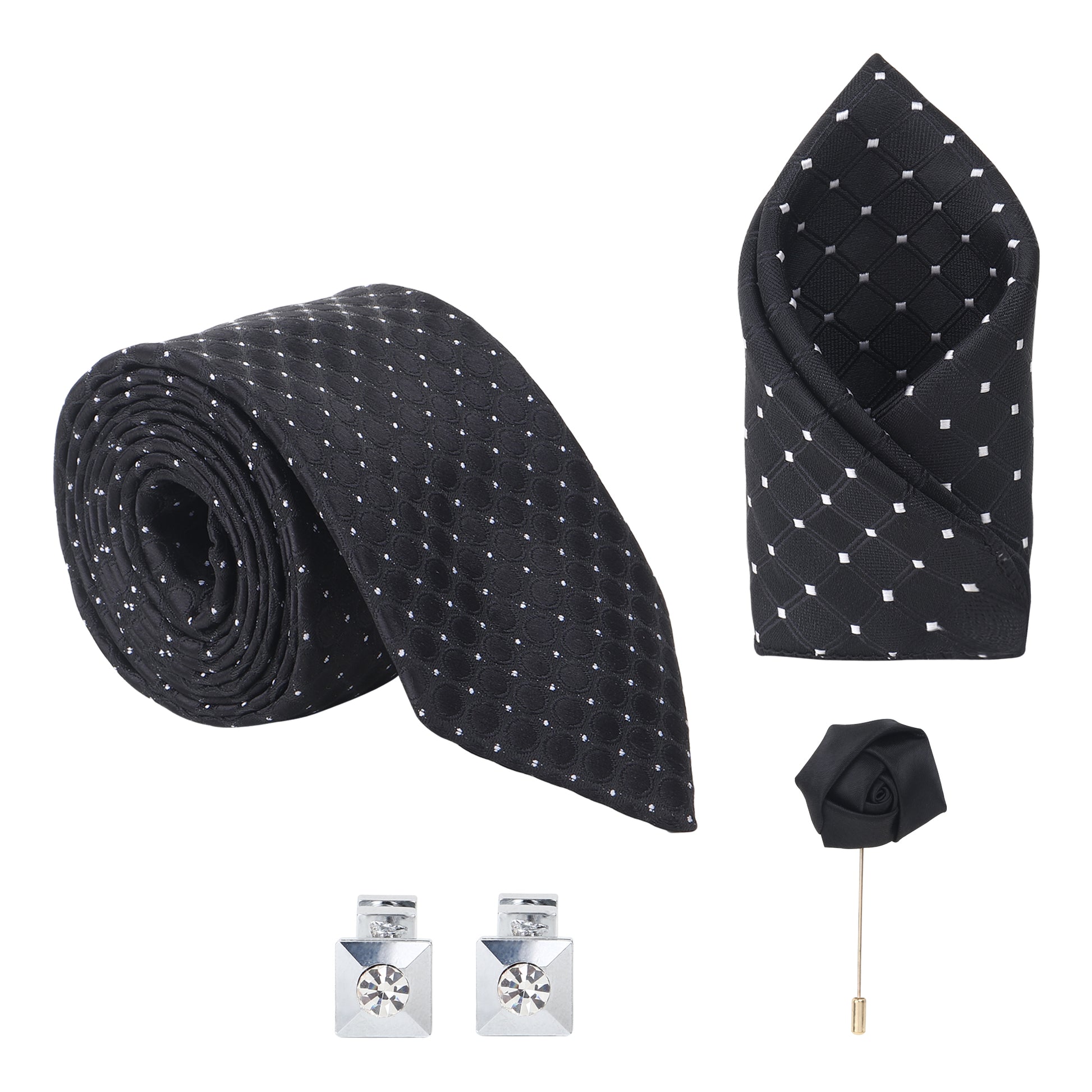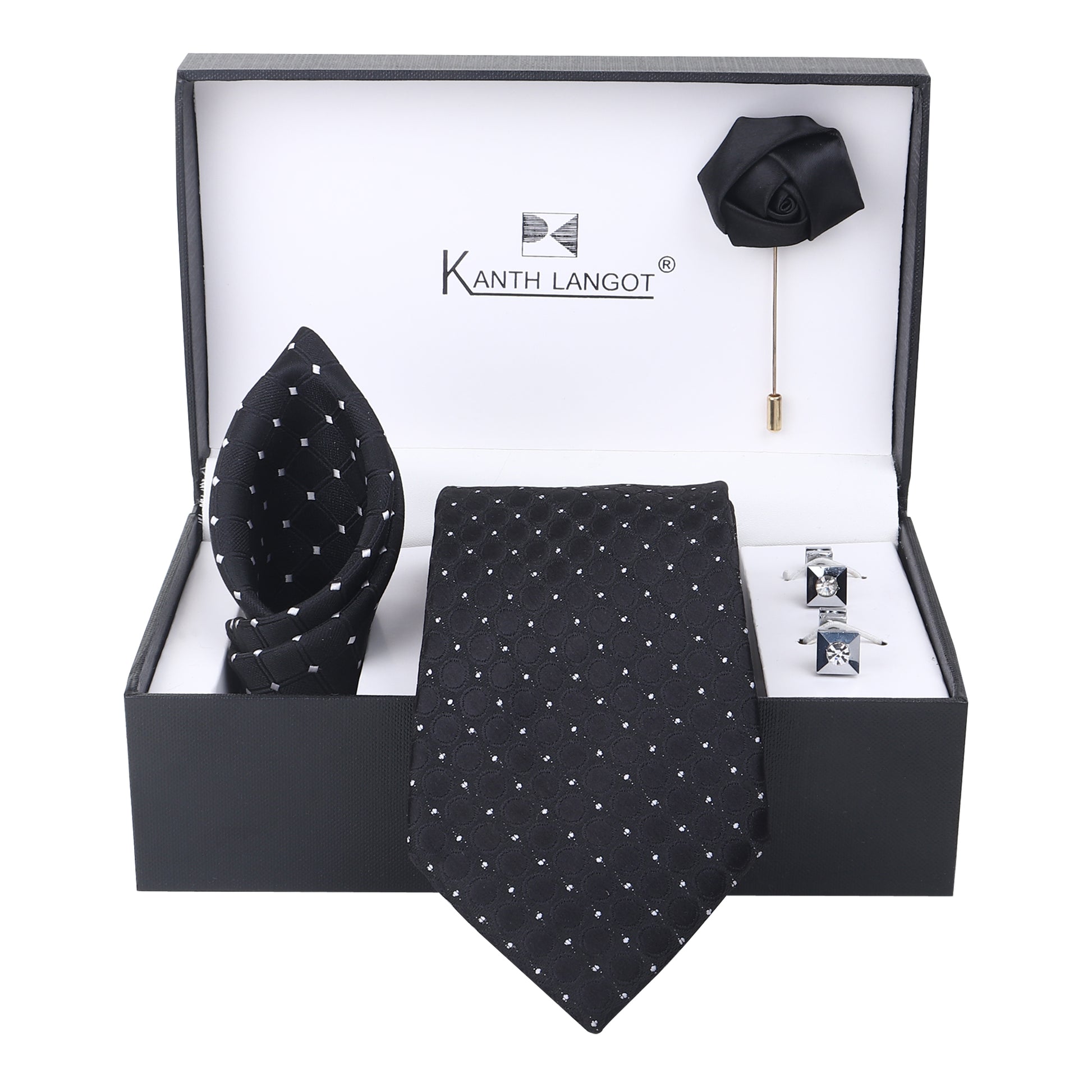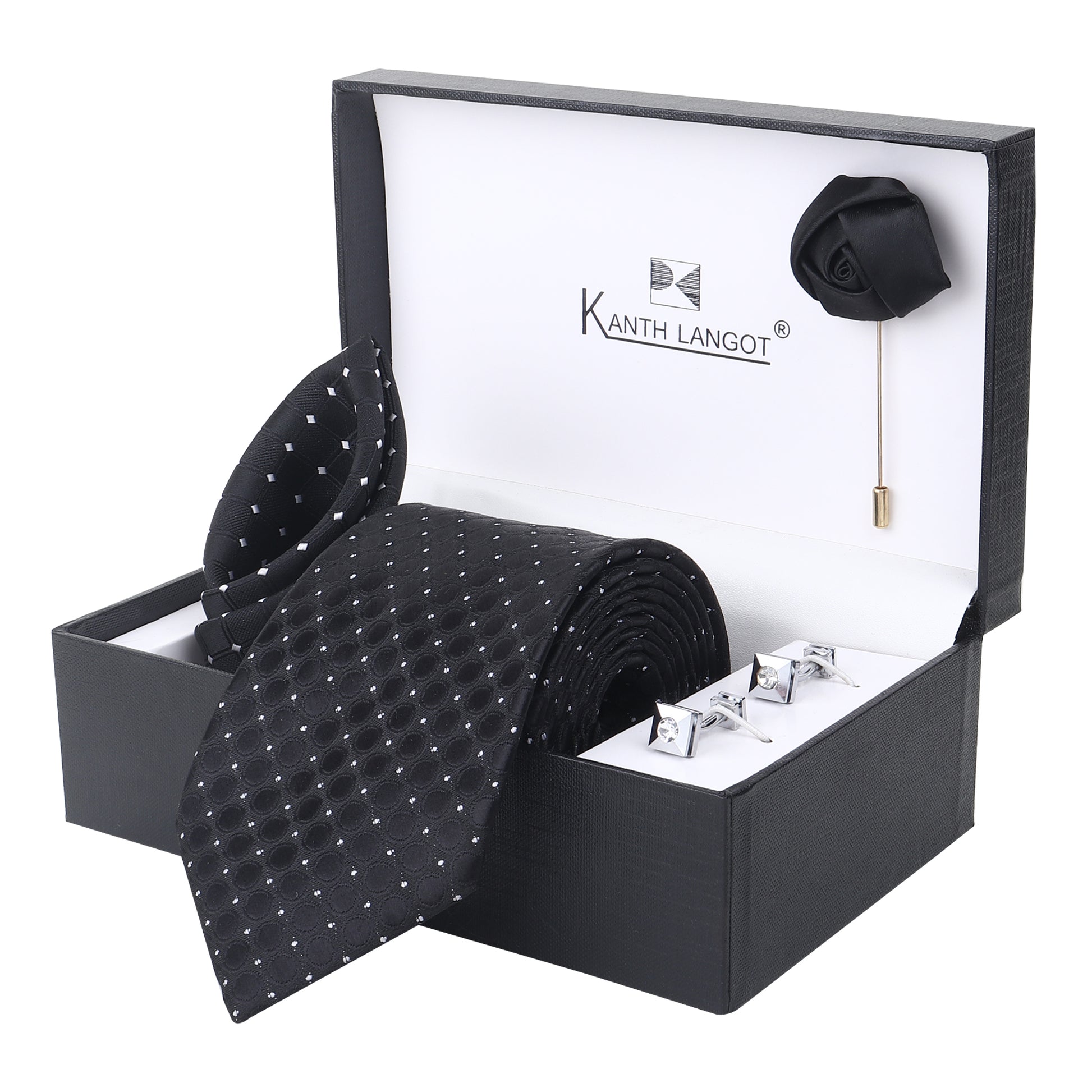 Kanthlangot Black Circle-Texture Tie Set with Silver Cufflinks, Pocket Square & Lapel Pin – Premium Gift Box