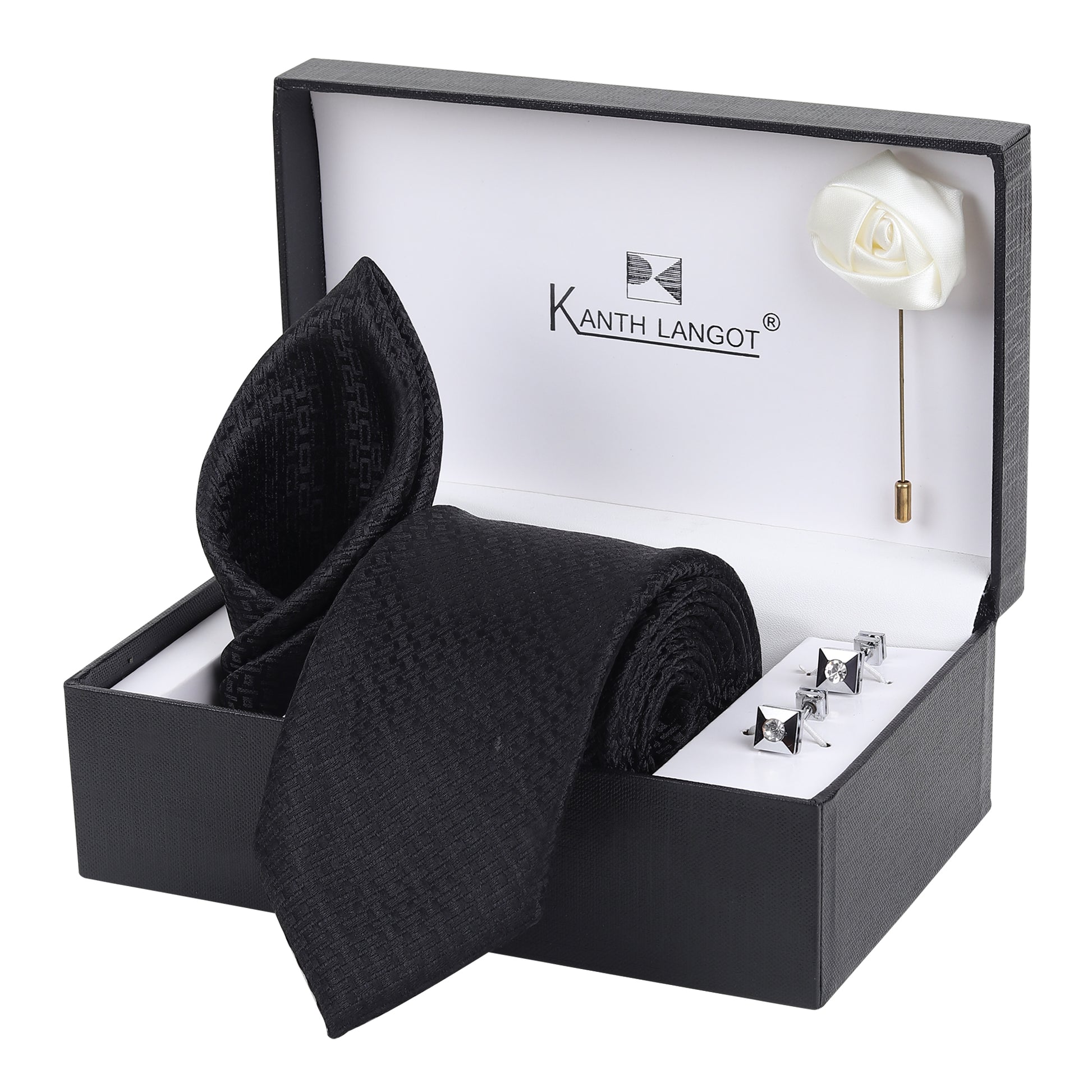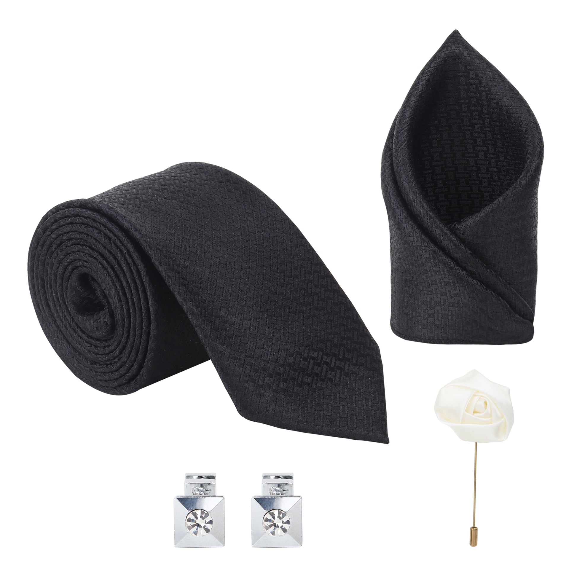 Kanthlangot Black Textured Tie, Pocket Square, Cufflinks & White Flower Lapel Pin Set (4-Piece Gift Box)