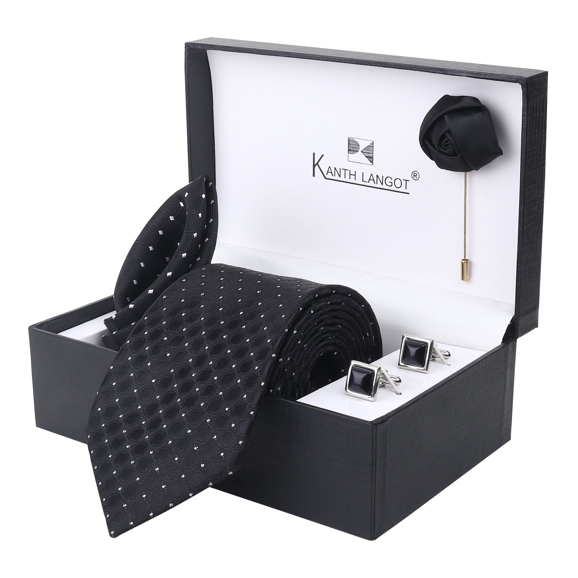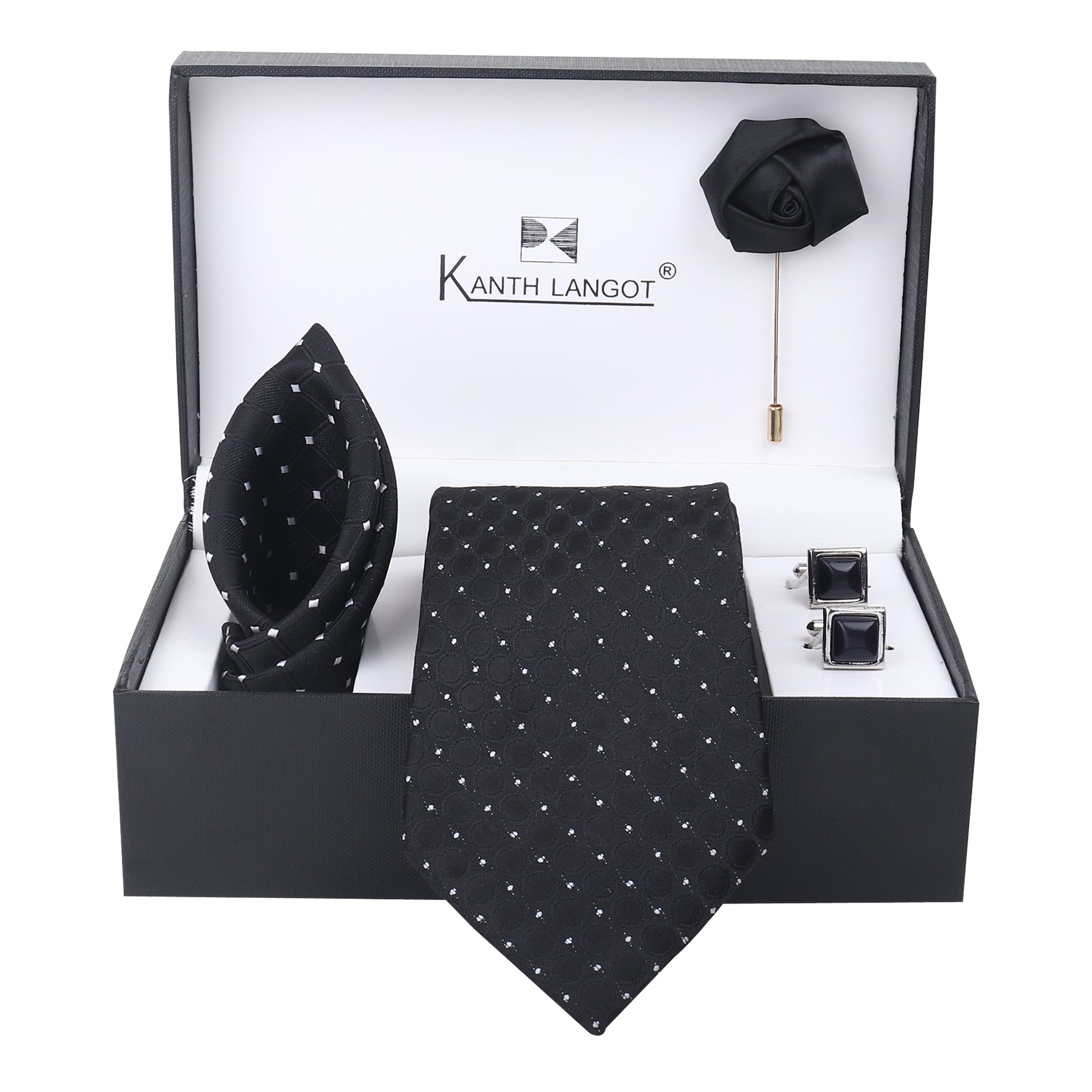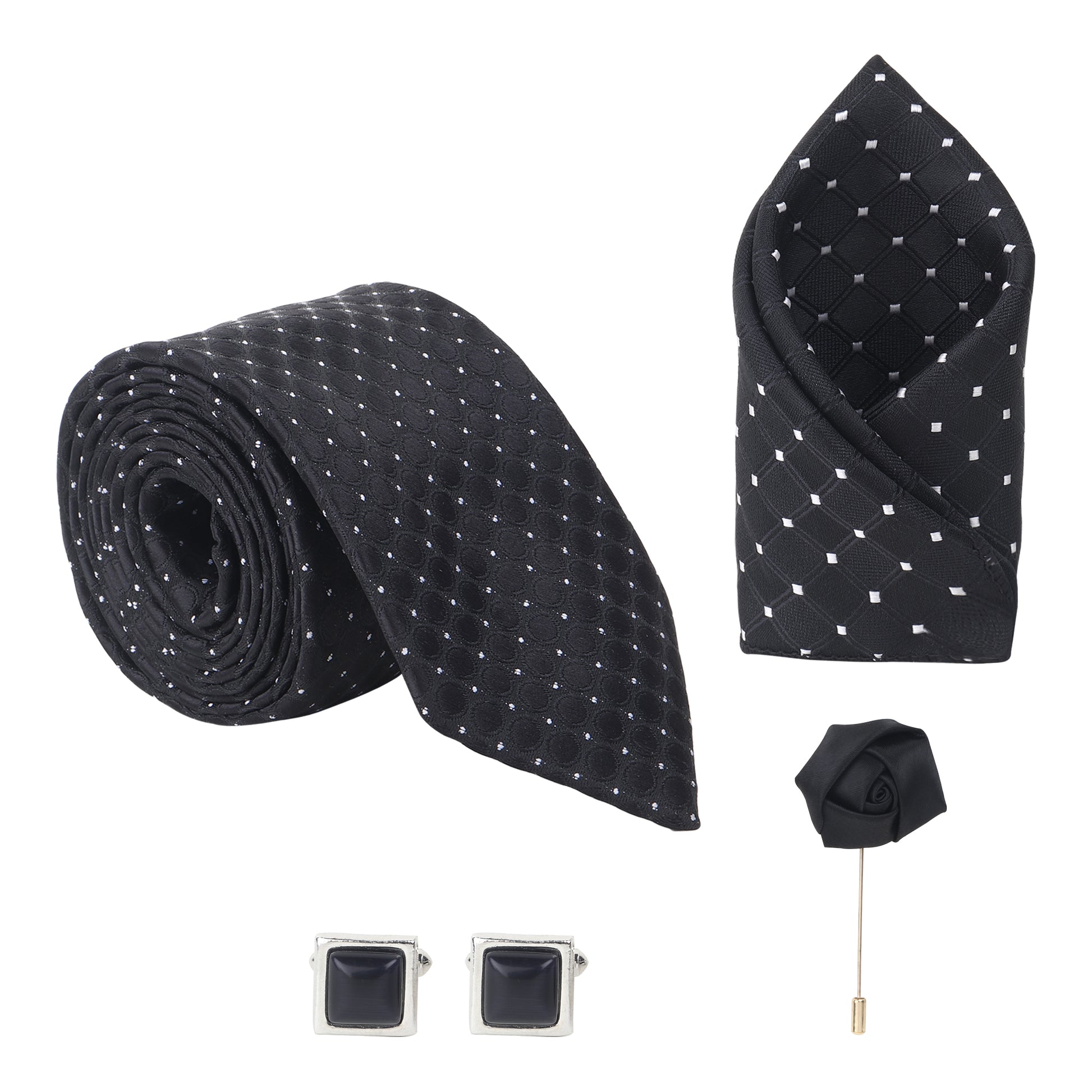Kanthlangot Black Diamond Dot Tie Set with Rounded Cufflinks, Pocket Square & Lapel Pin