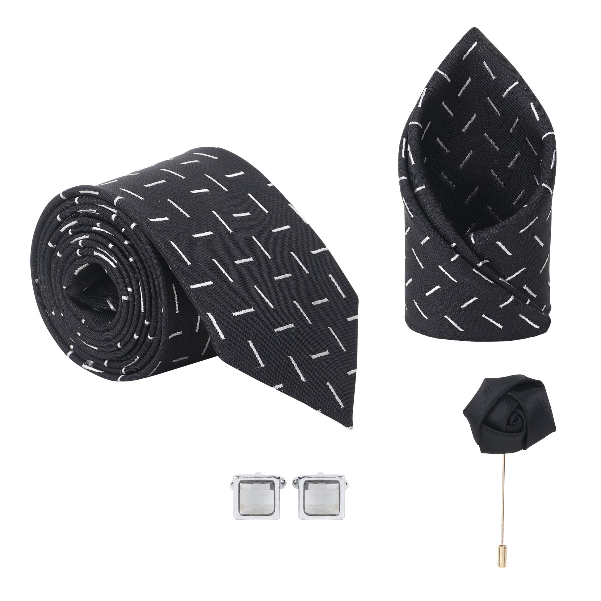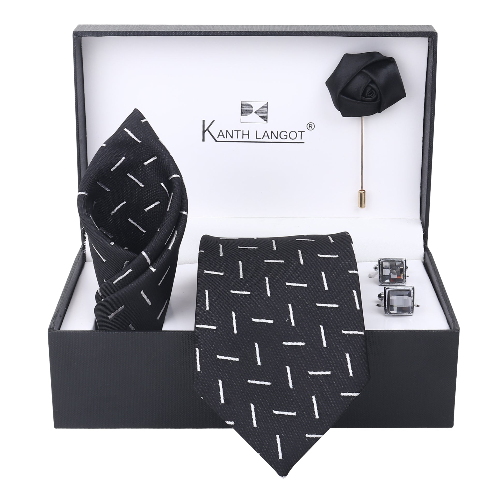 Elevate your formalwear with the Kanthlangot Bold Black Tie Set, where confident styling meets refined detail. The jet-black tie is patterned with elegant white bars for a modern contrast that balances tradition and edge.