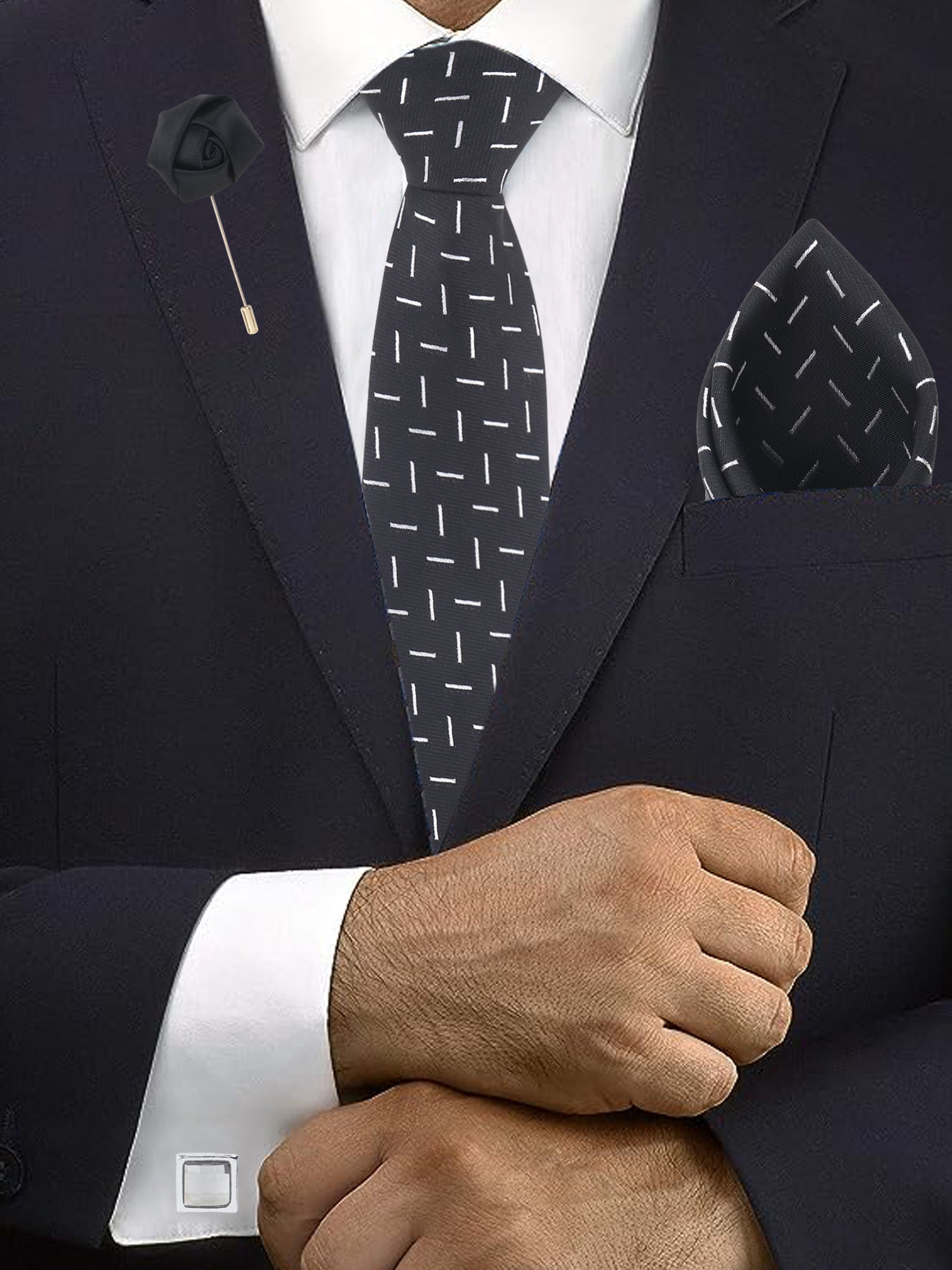 Matching pocket square with the same bold white-bar design