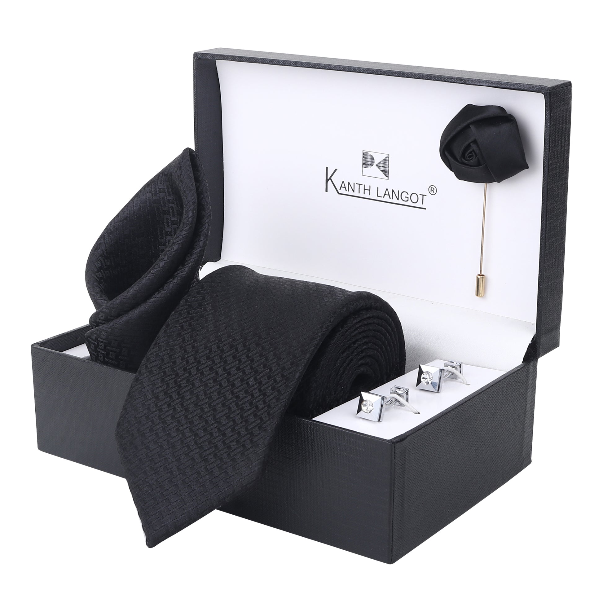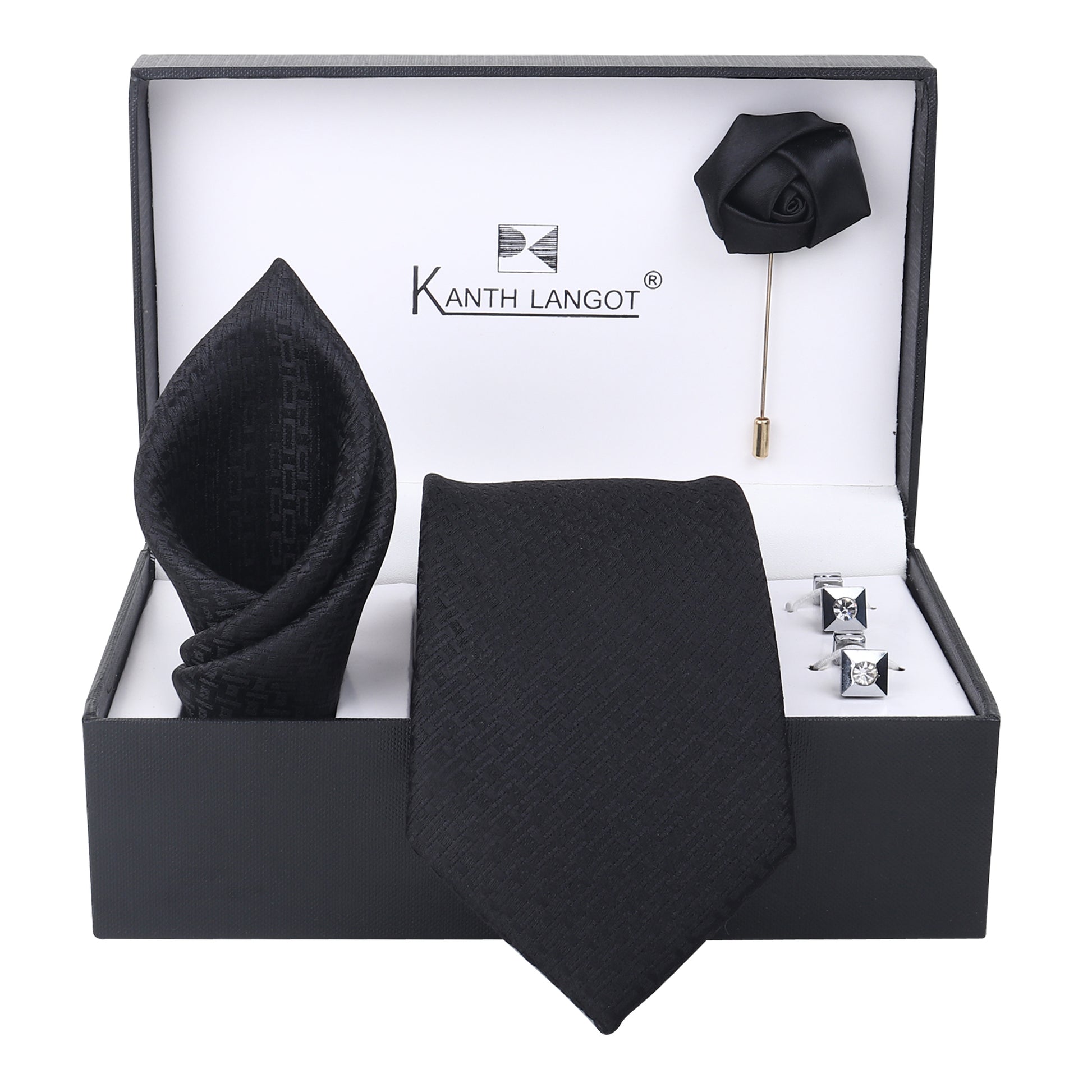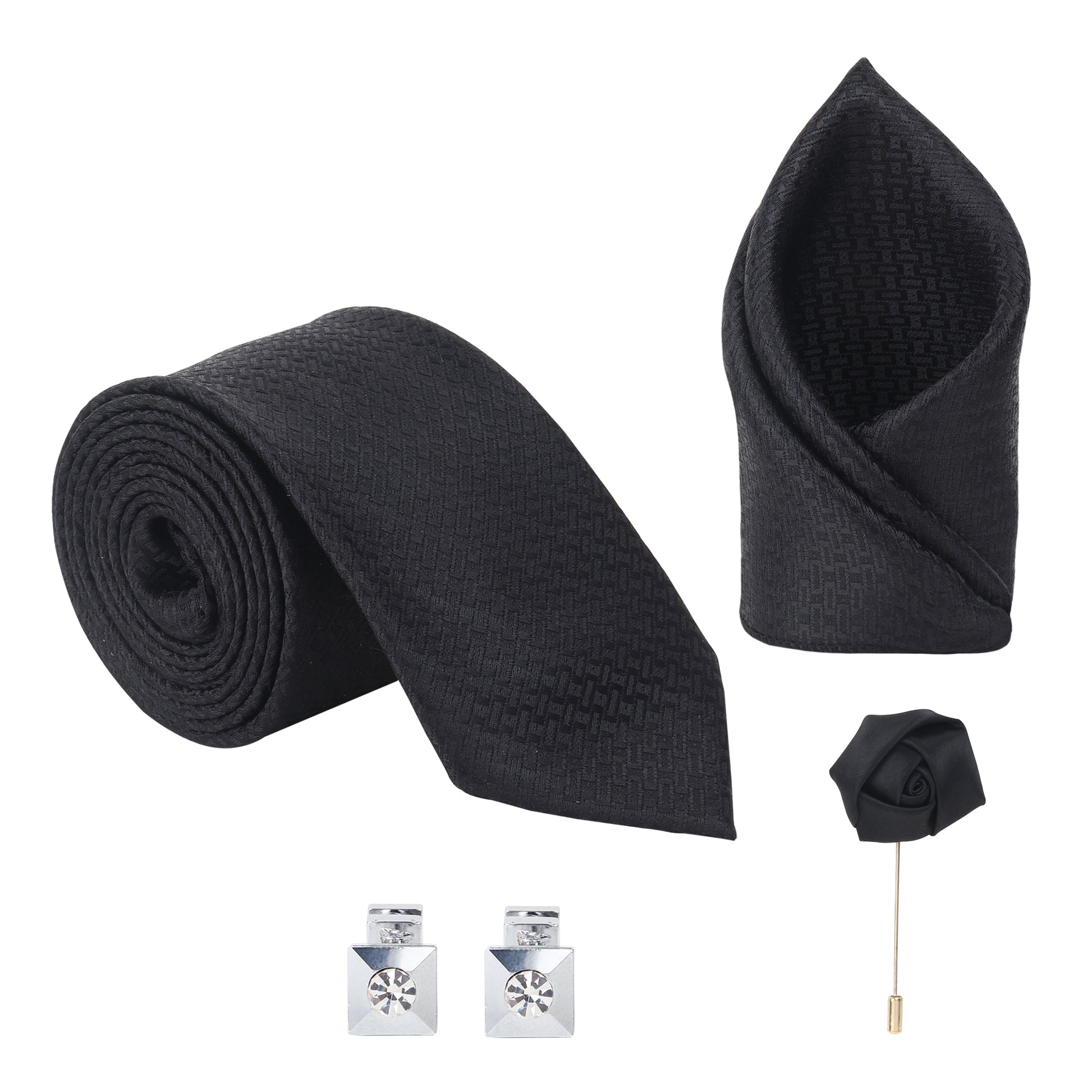 Kanthlangot Black Textured Tie, Pocket Square, Rose Lapel Pin & Crystal Cufflinks Set (4-Piece Gift Box)