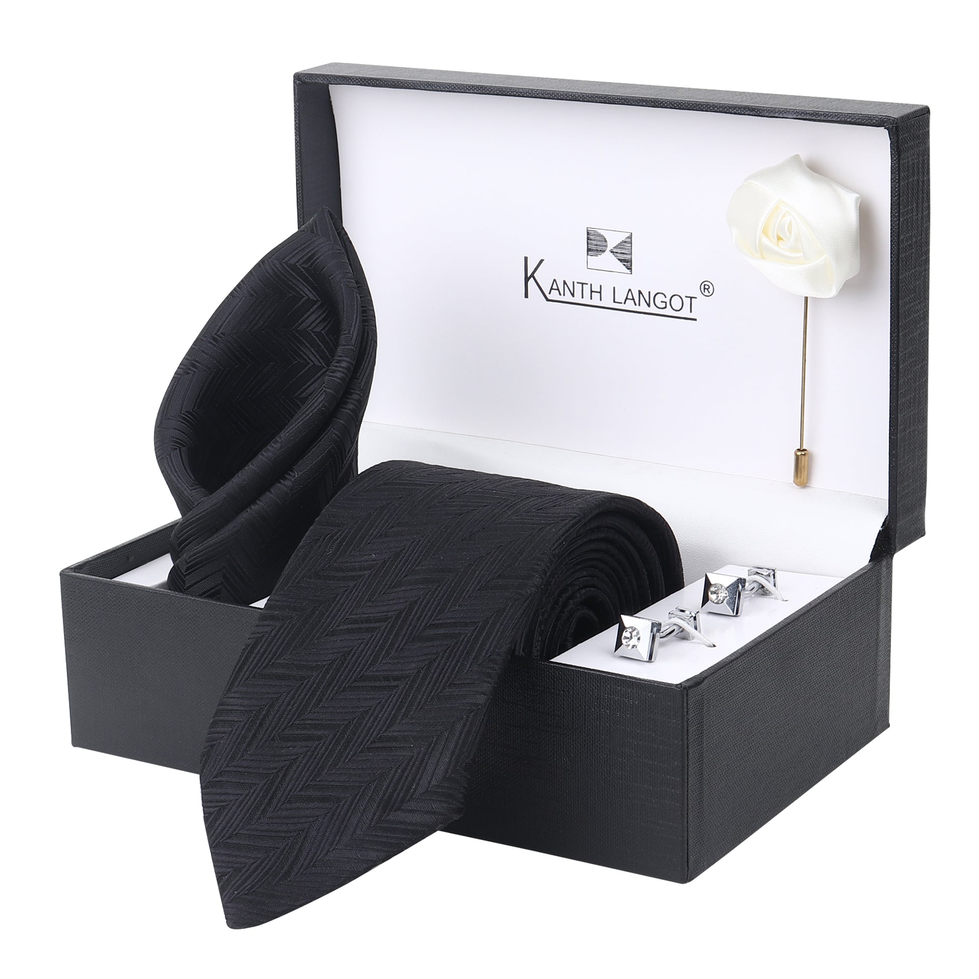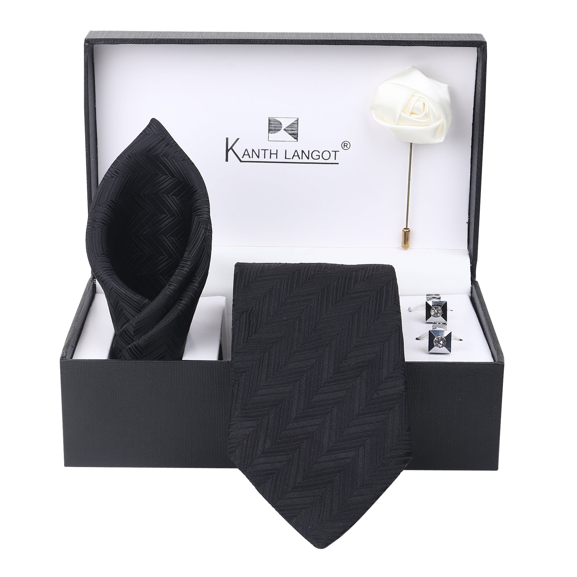 Sophistication refined — this Kanthlangot Set of 4 features a timeless black chevron necktie, coordinating pocket square, brilliant crystal-studded cufflinks, and a white rose lapel pin, all elegantly presented in a signature Kanthlangot premium box. Designed to make statements — be it for black-tie events, formal occasions, or elite gifting.