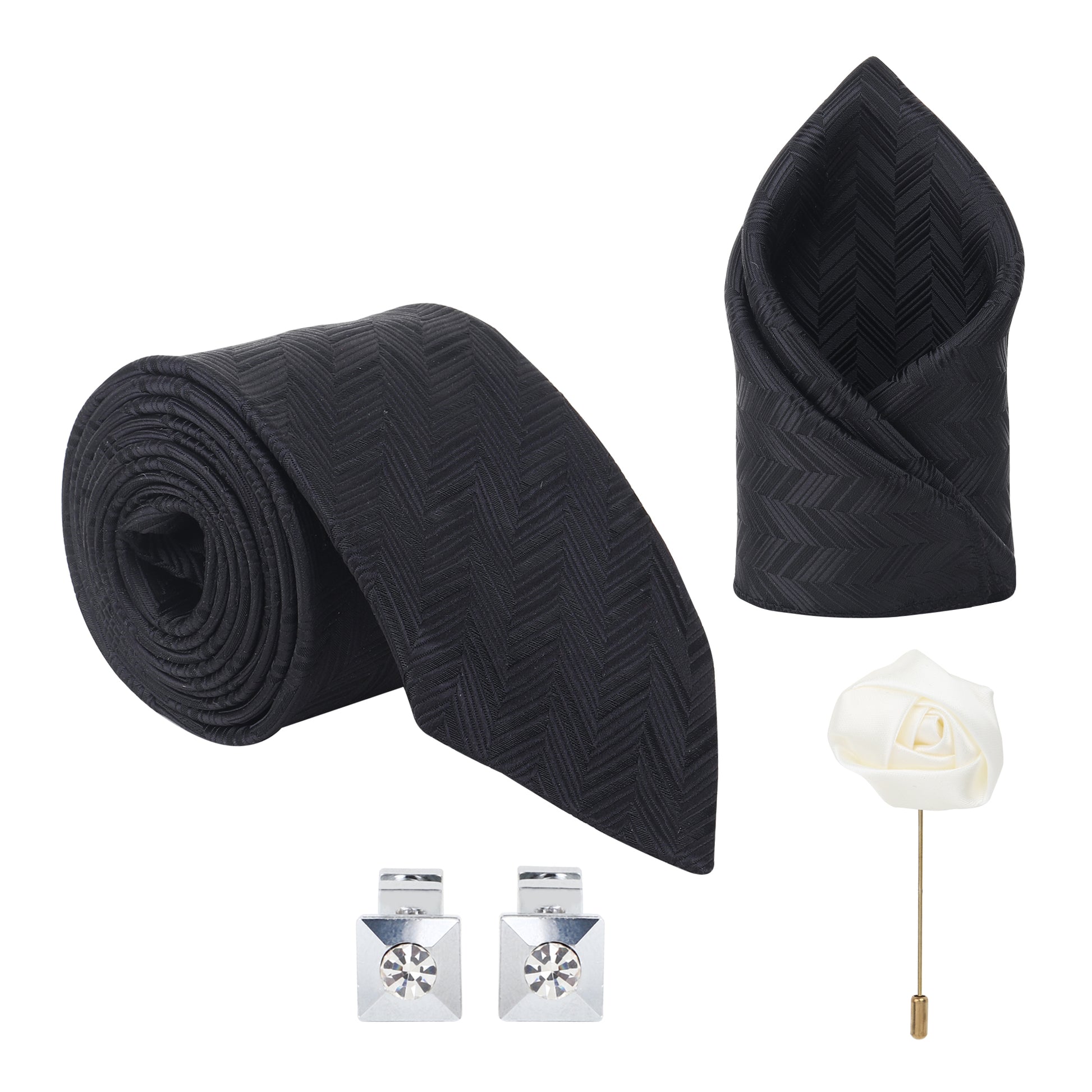 Kanthlangot Set of 4: Black Chevron Tie, Pocket Square, Crystal Cufflinks & White Lapel Pin in Gift Box