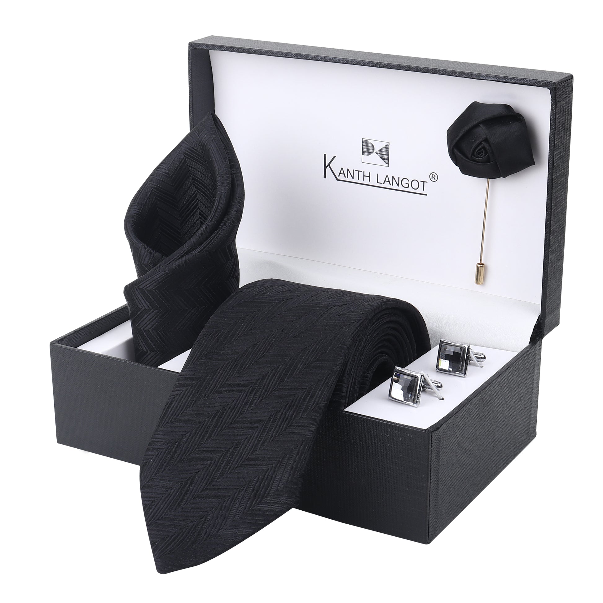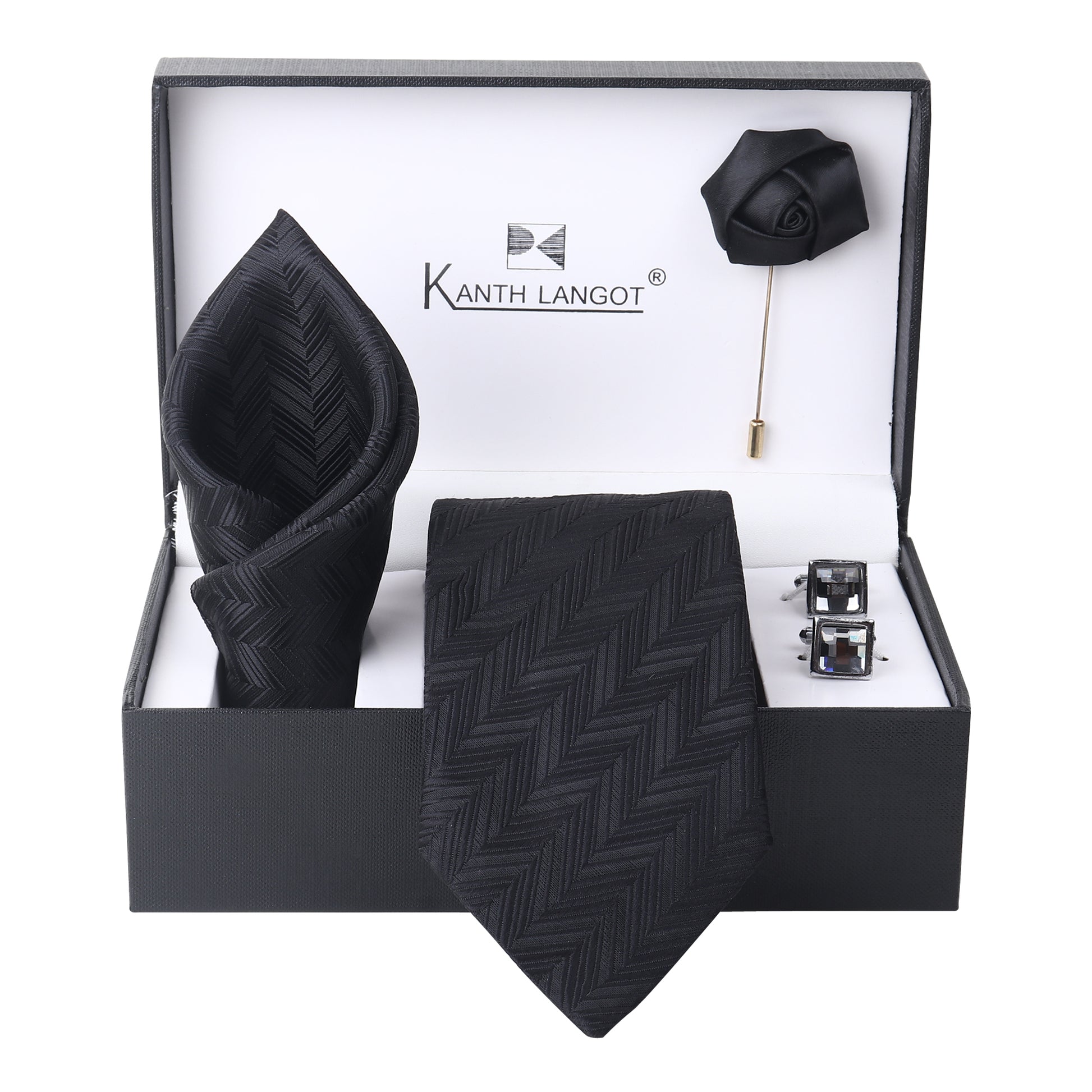 Unleash timeless class with this set of 4 from Kanthlangot, featuring a bold black chevron-textured necktie, a sleek matching pocket square, elegant black crystal cufflinks, and a striking black satin lapel pin. All thoughtfully encased in a luxury gift box — this is the epitome of formal excellence and refined gifting.