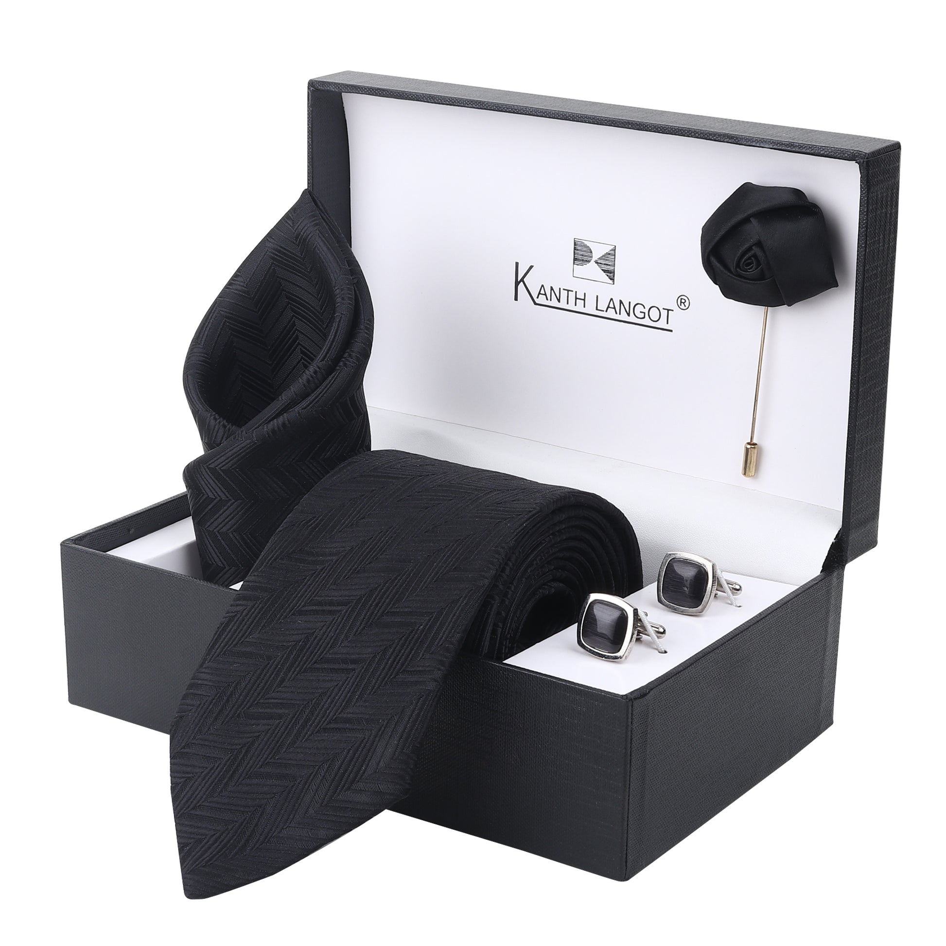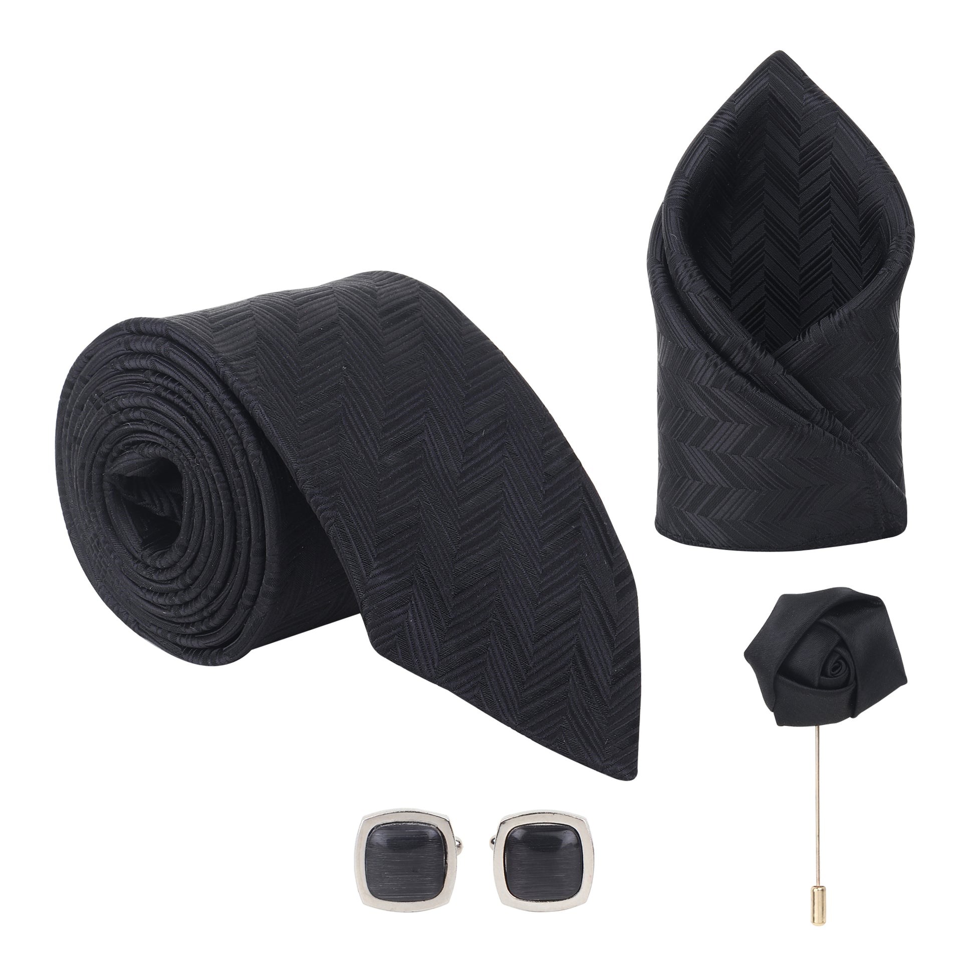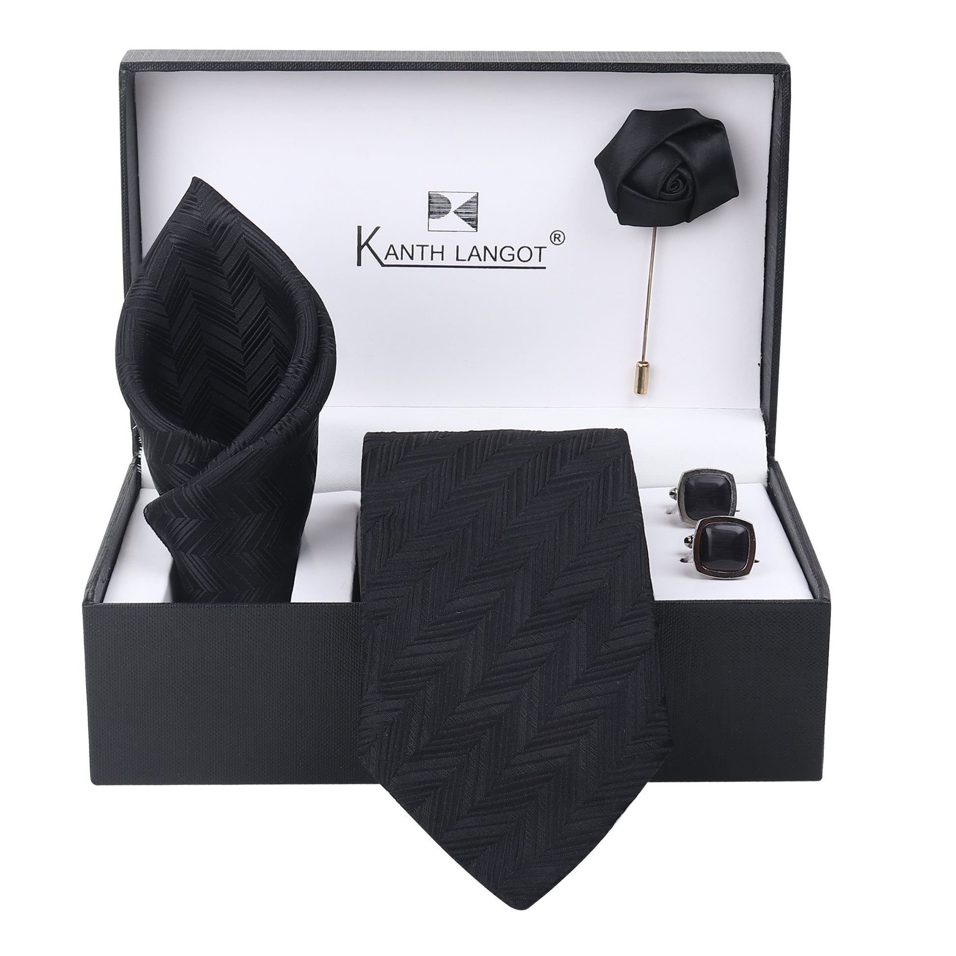 Kanthlangot Set of 4: Black Chevron Necktie, Pocket Square, Glossy Cufflinks & Lapel Pin in Gift Box