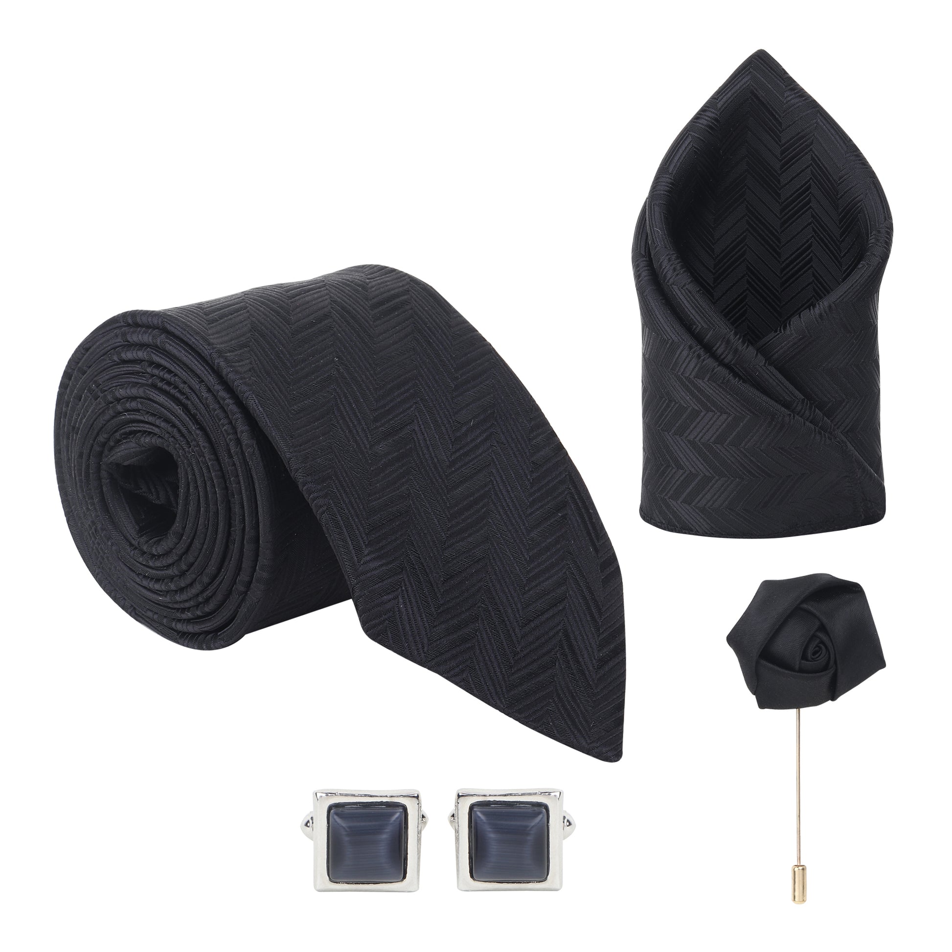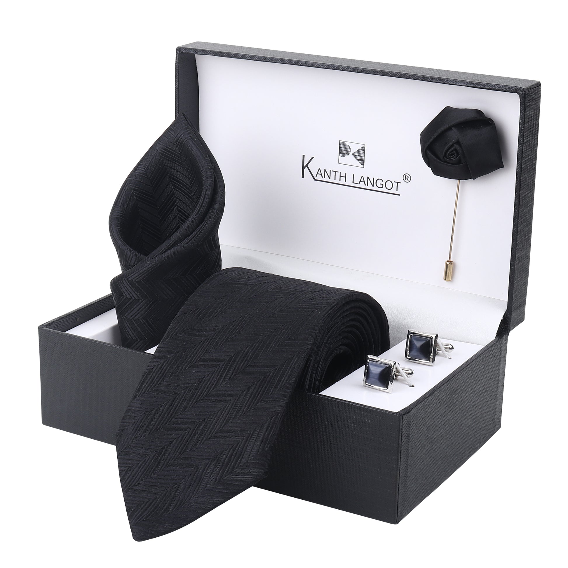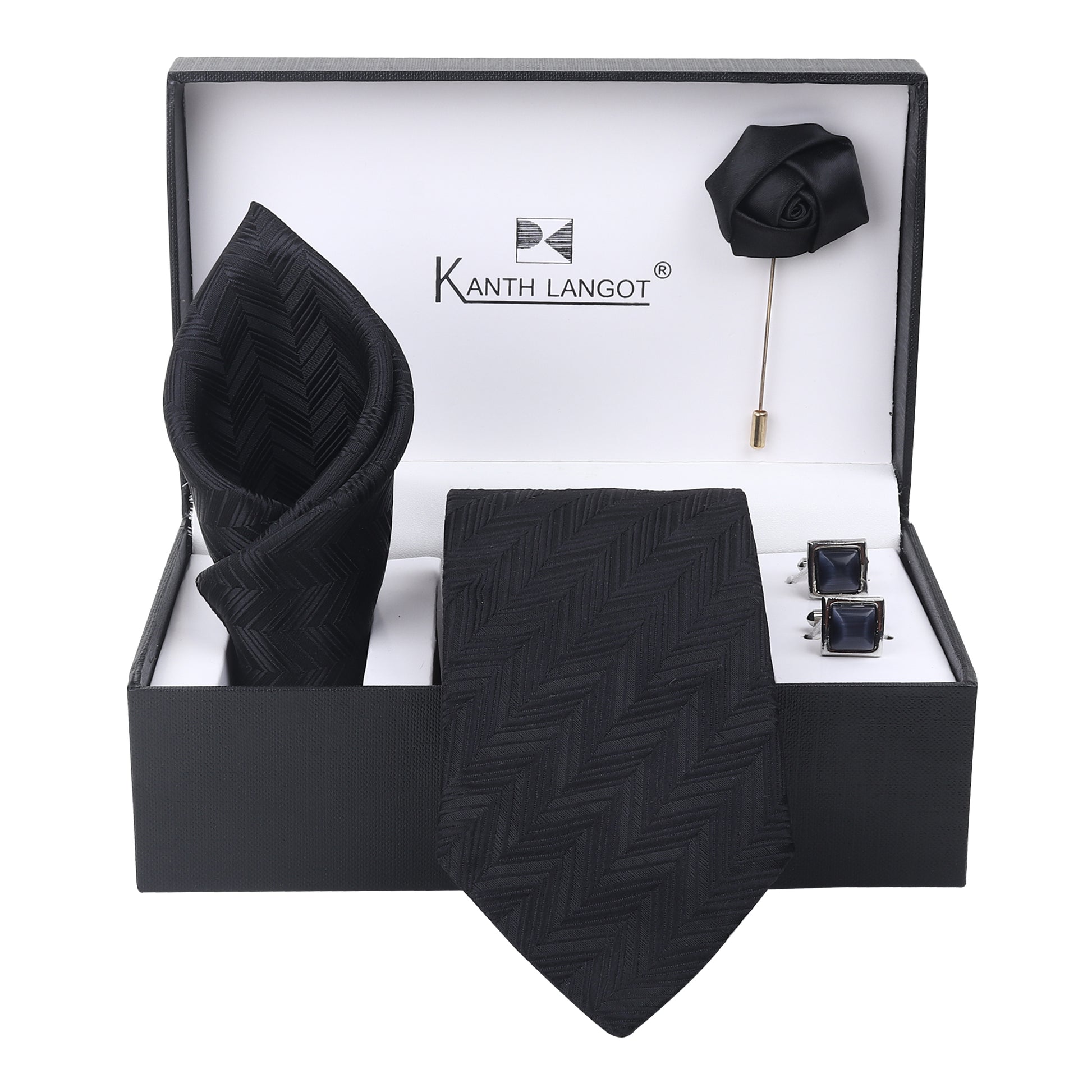 Kanthlangot Set of 4 for Men: Black Chevron Tie, Pocket Square, Onyx Cufflinks & Lapel Pin in Premium Gift Box