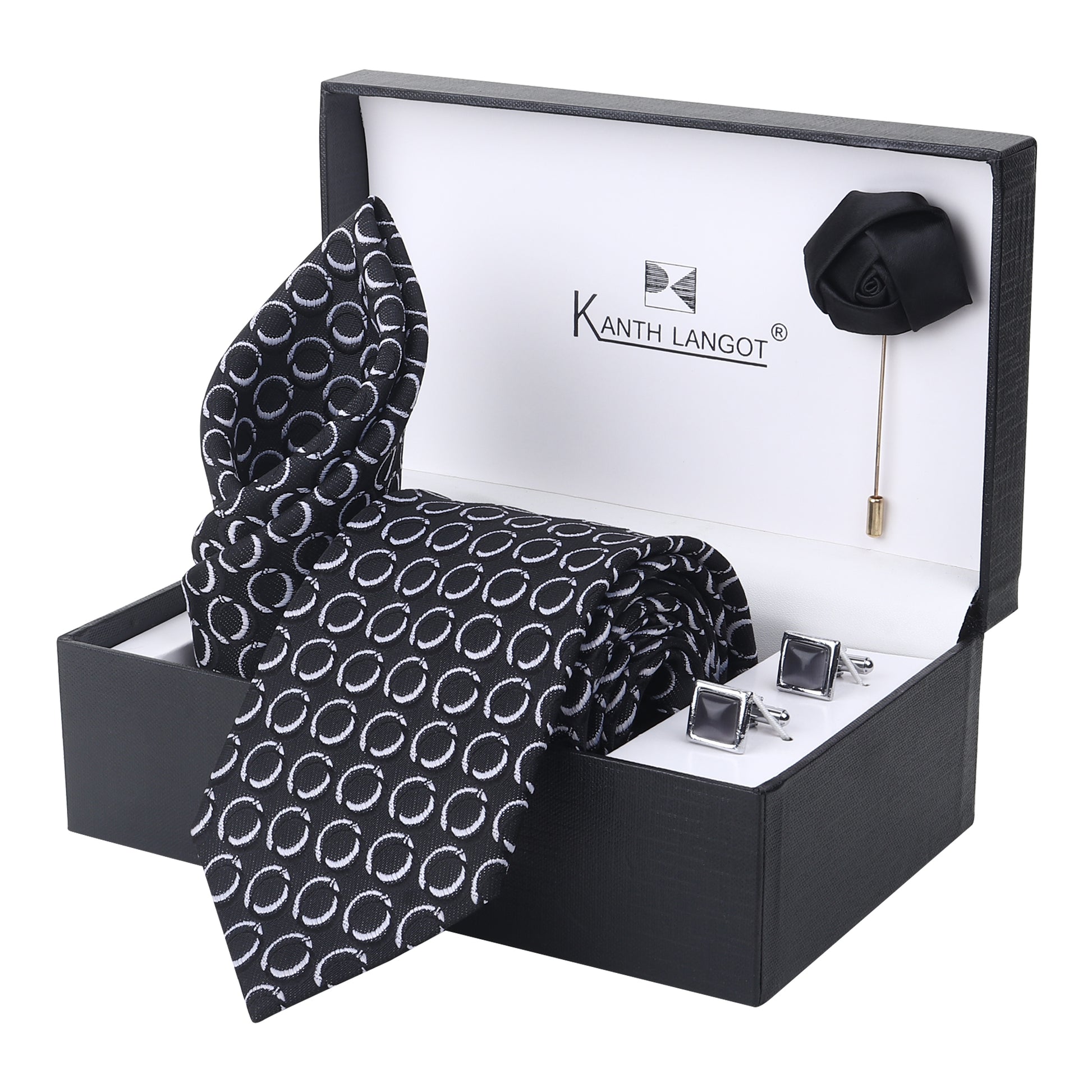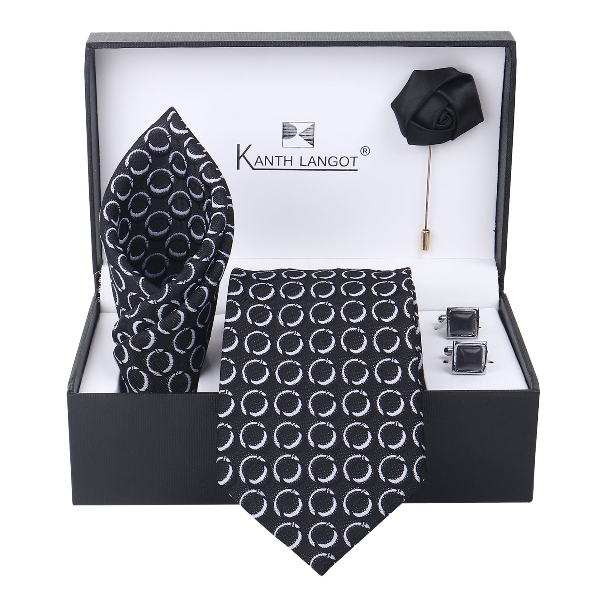 Kanthlangot Set of 4: Black Circular Pattern Tie, Pocket Square, Black Stone Cufflinks & Lapel Pin in Premium Gift Box