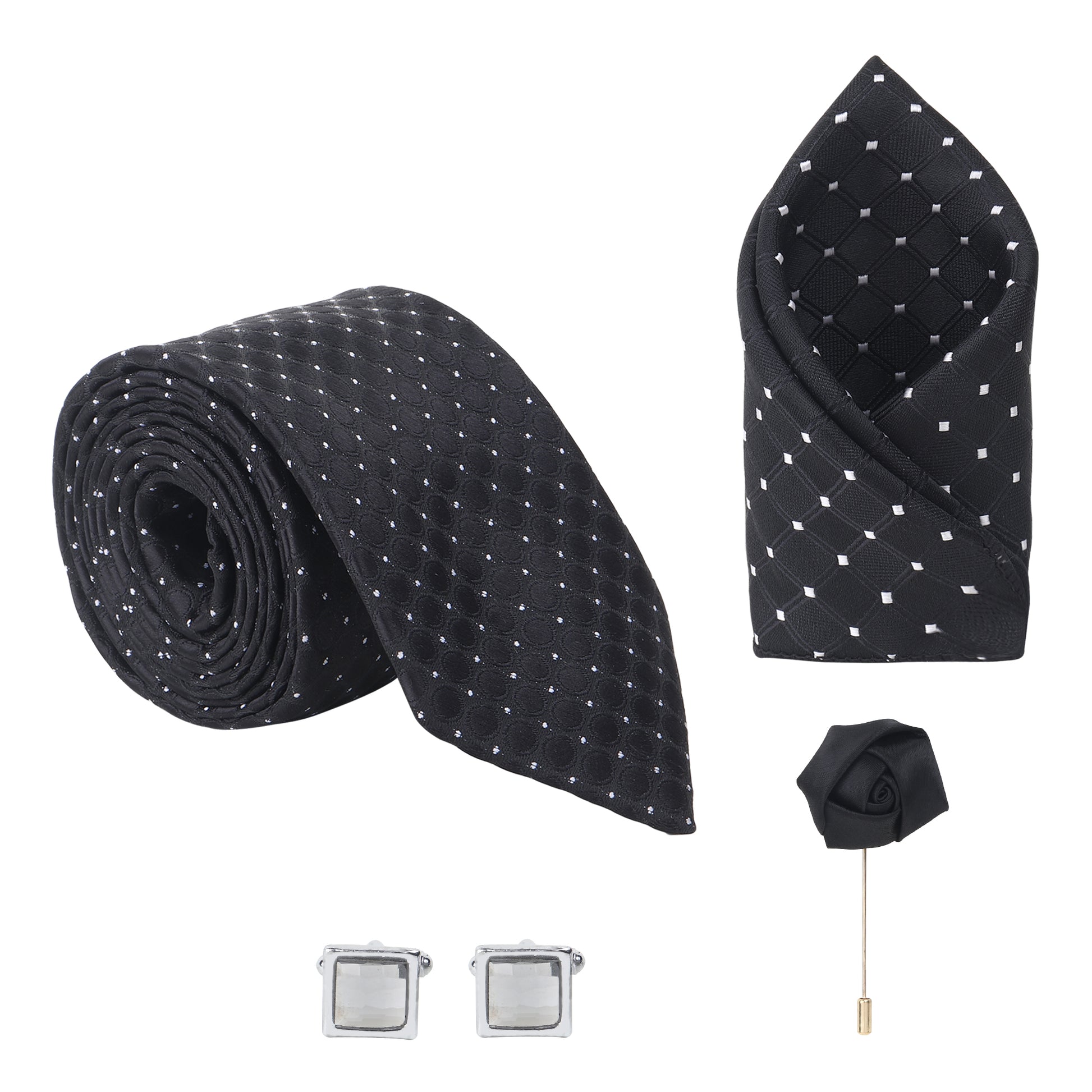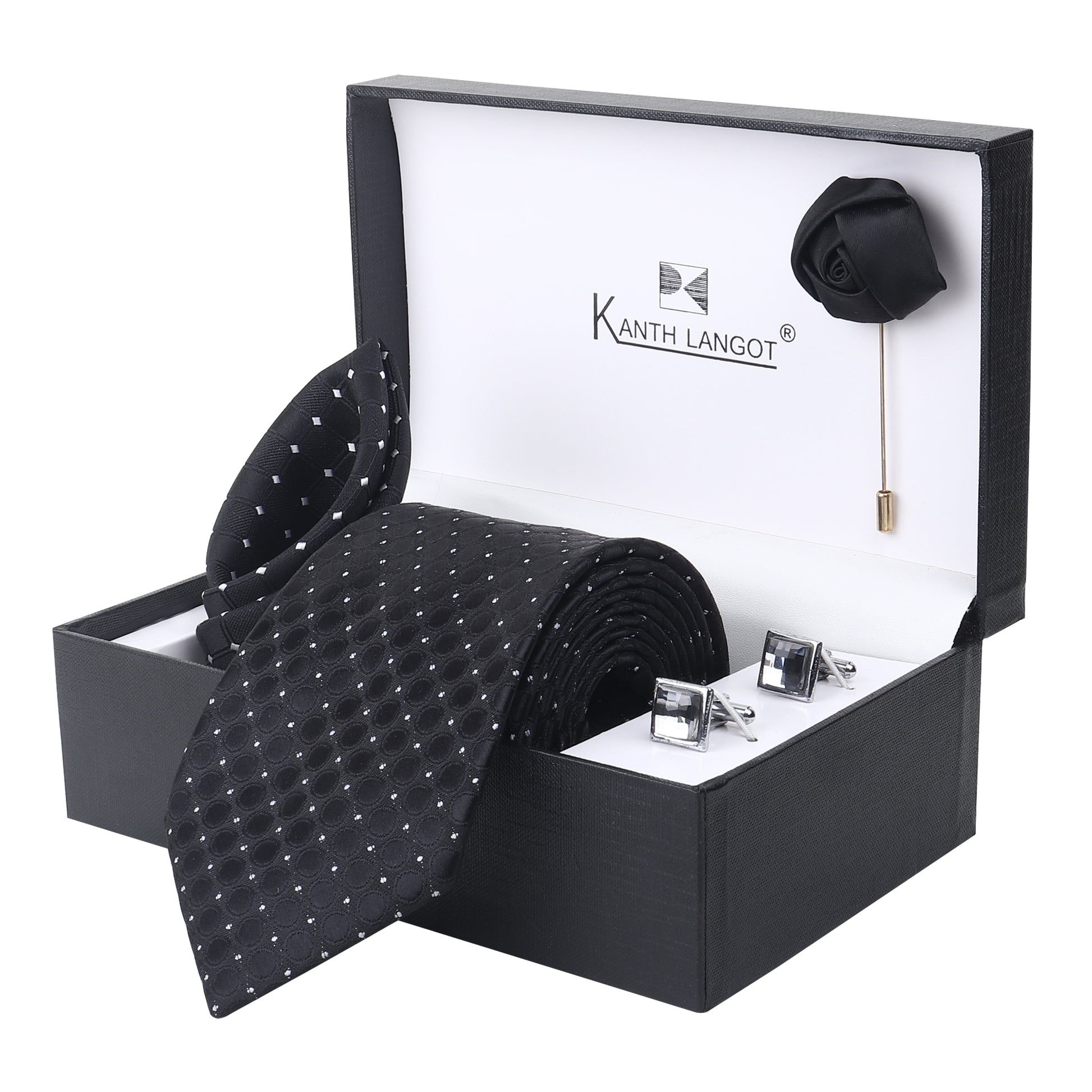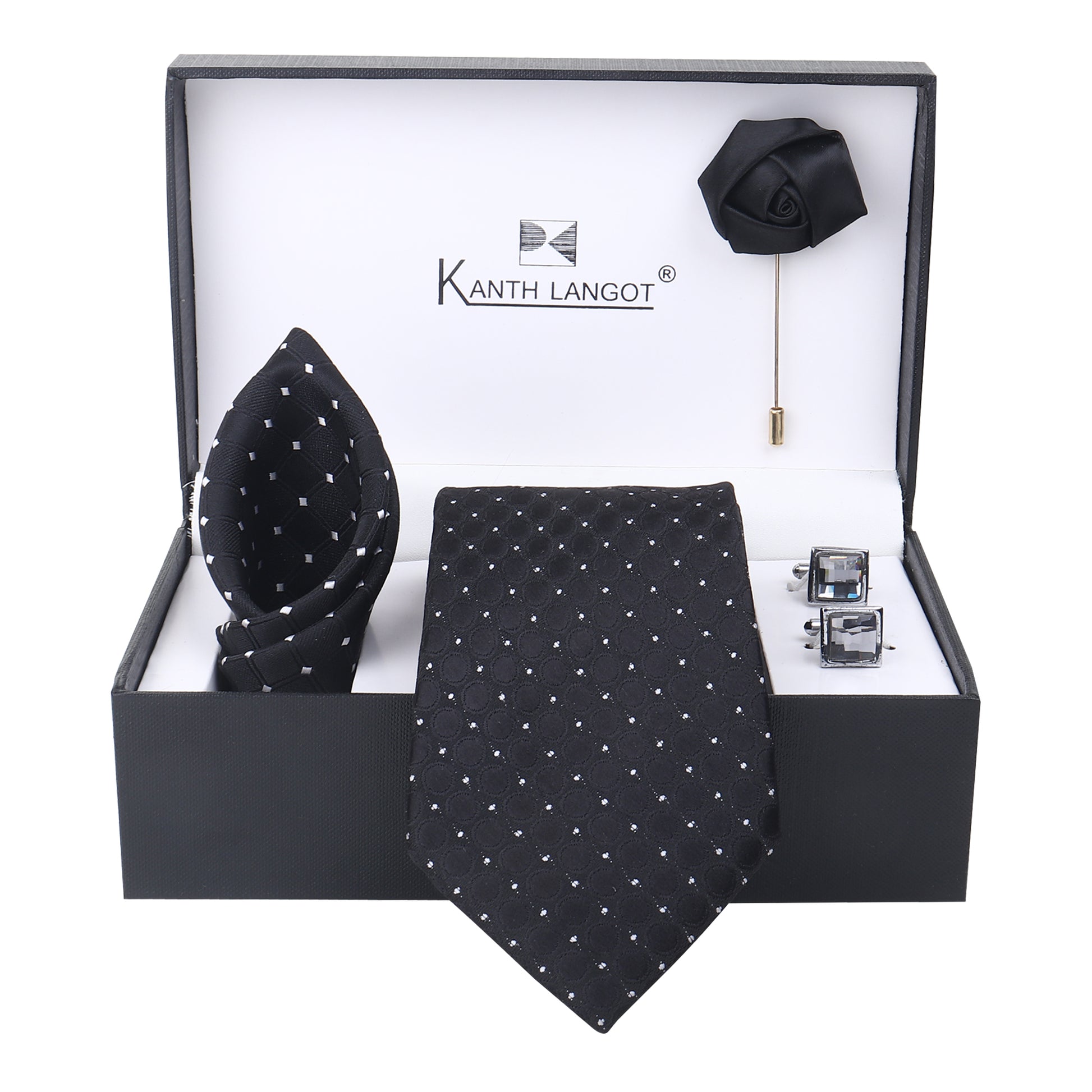 Discover refinement in every thread with this striking Kanthlangot black dotted necktie set, a true expression of quiet luxury. Designed for those who appreciate elegant detailing, this set of 4 includes a precisely coordinated ensemble — a necktie, pocket square, cufflinks, and a rose lapel pin — making it an exceptional gift or personal wardrobe upgrade.