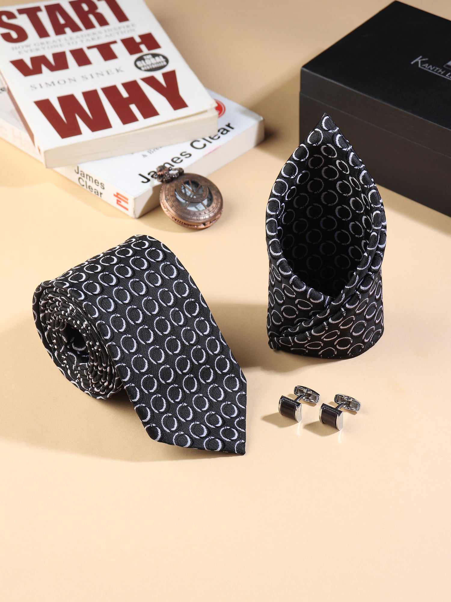 This elegant set includes a 3-inch wide black tie featuring a modern white circle design, a matching pocket square, and a distinct pair of black-toned cufflinks with a sleek metallic frame. Perfect for weddings, office attire, parties, and thoughtful gifting, this set is crafted for the modern gentleman who appreciates both tradition and contemporary flair.