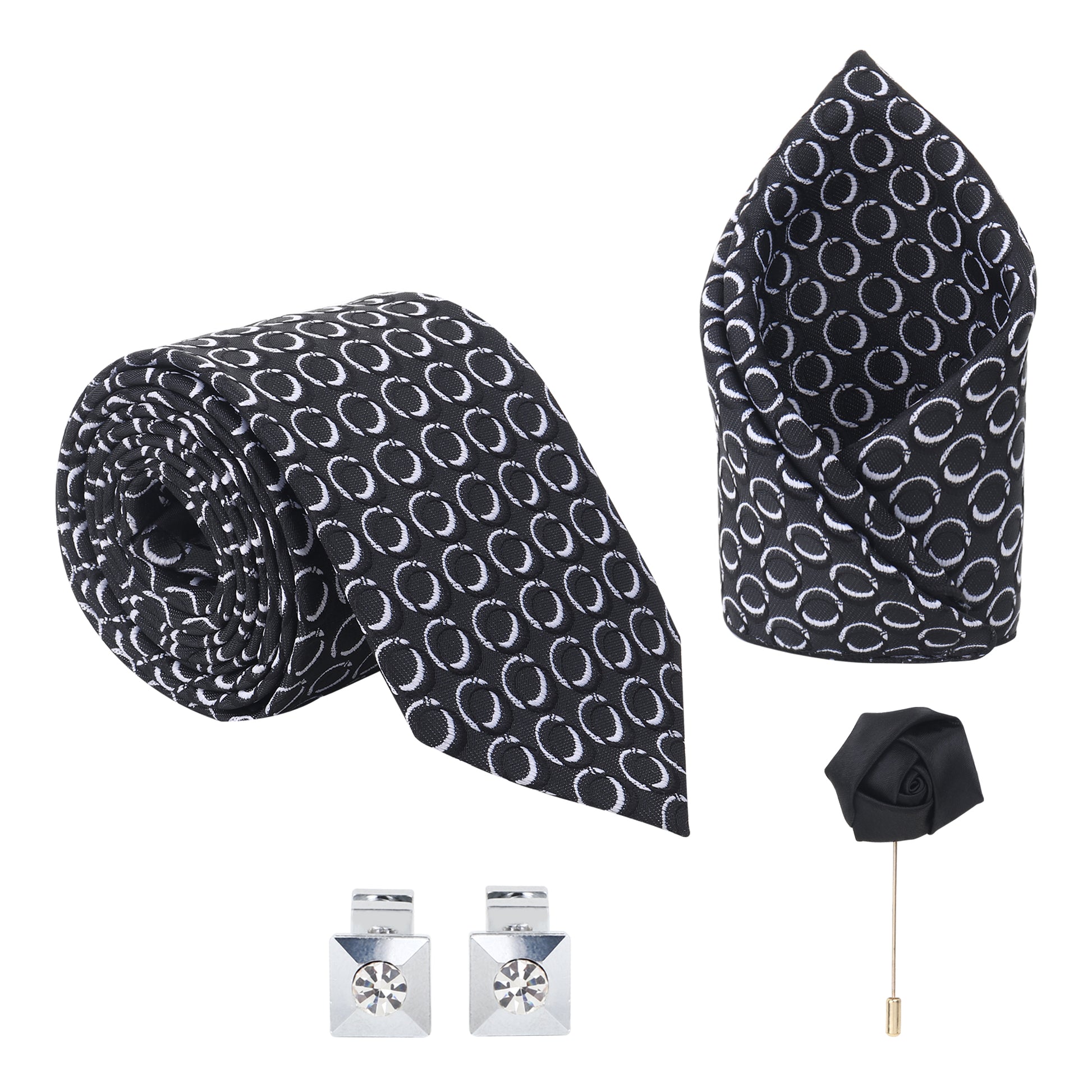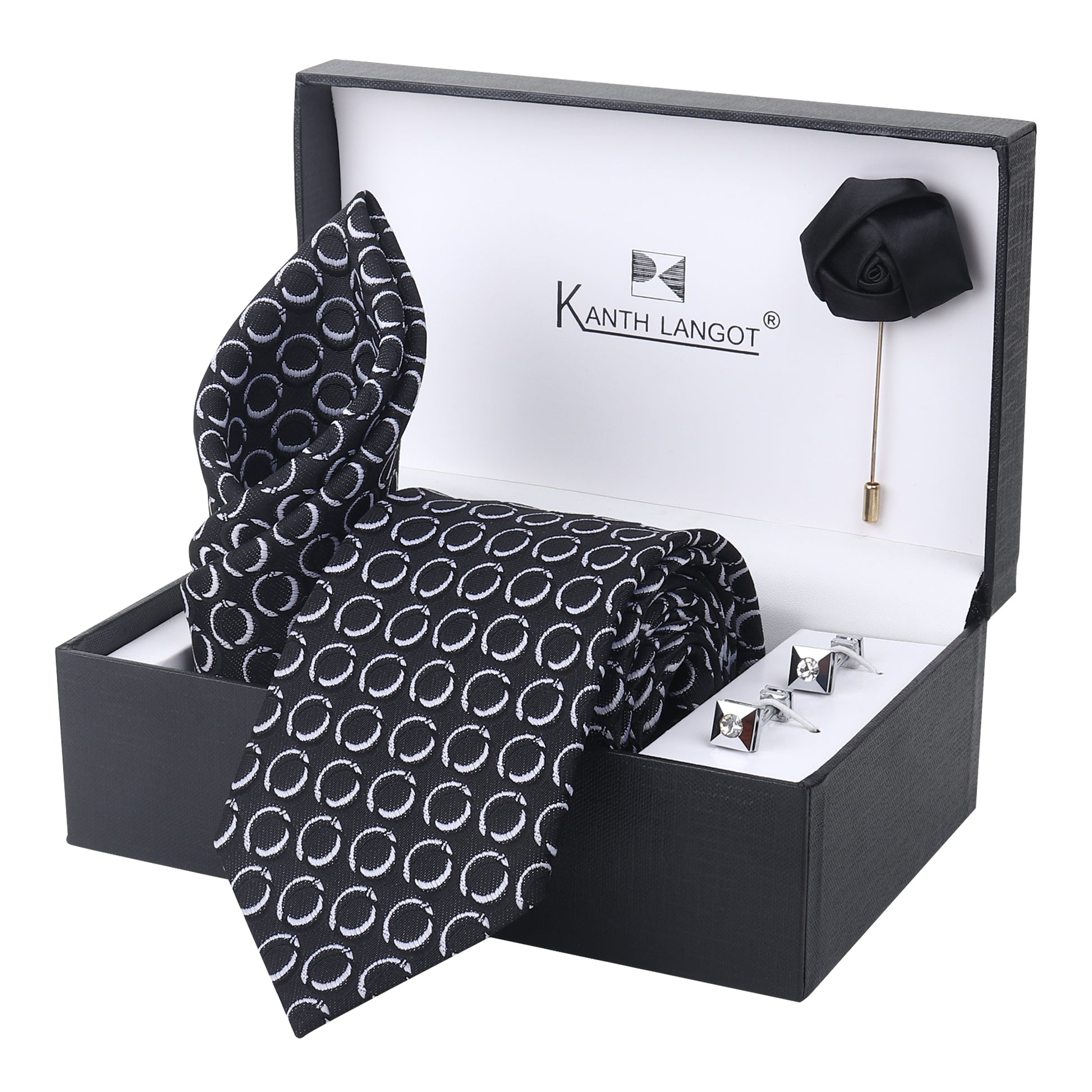 Kanthlangot Set of 4: Black & White Circle Tie with Pocket Square, Crystal Stud Cufflinks & Black Lapel Pin in Premium Gift Box