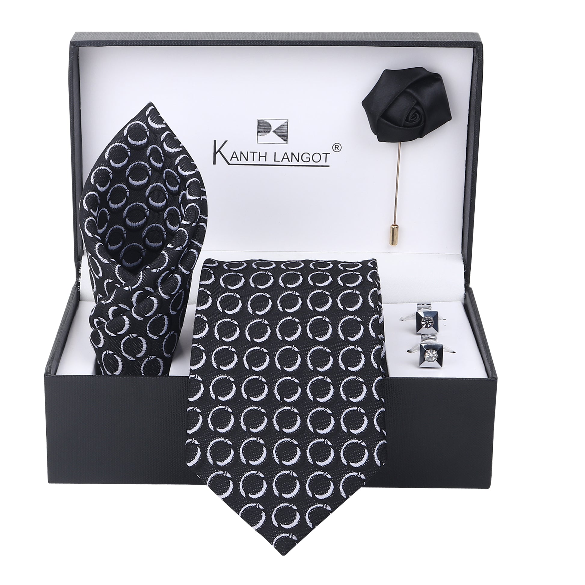 Balance bold patterns with understated elegance in this Kanthlangot Set of 4. Featuring a black necktie with a modern white concentric circle pattern, the set includes a matching pocket square, a pair of silver-tone crystal stud cufflinks, and a black satin rose lapel pin, all elegantly packed in our luxury gift box. A striking gift for those who dare to stand out.