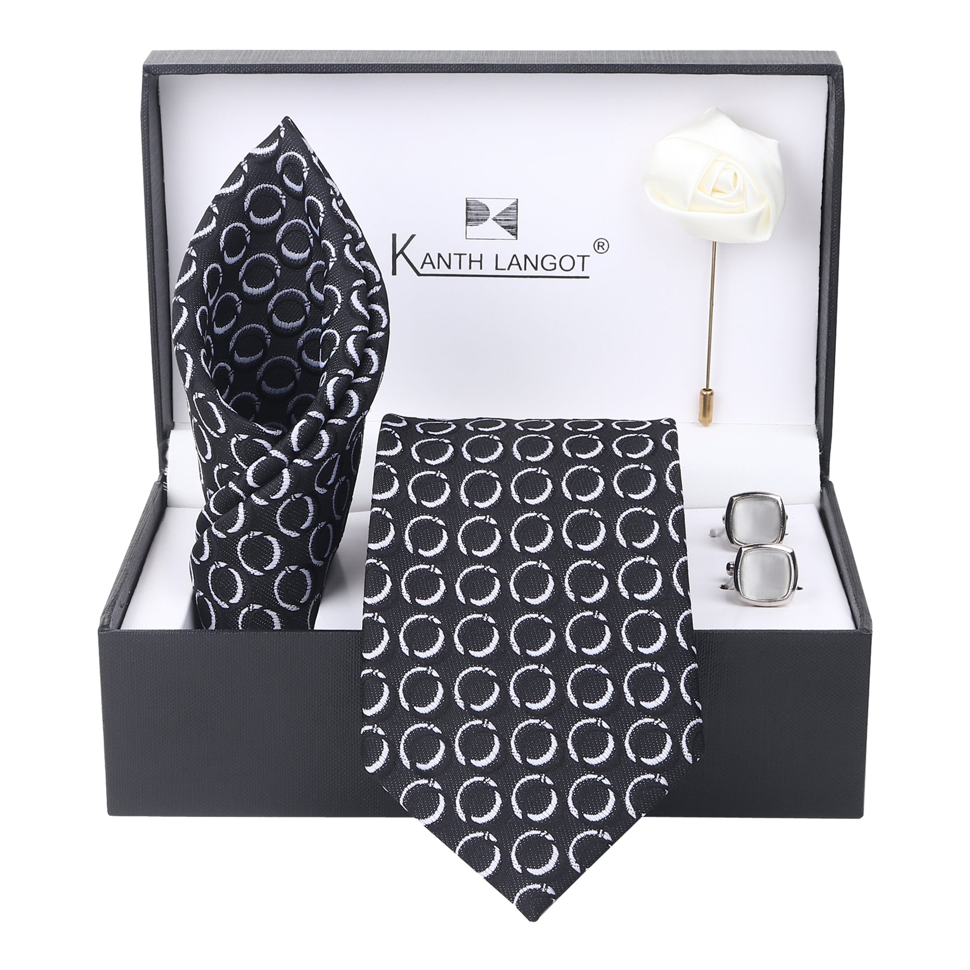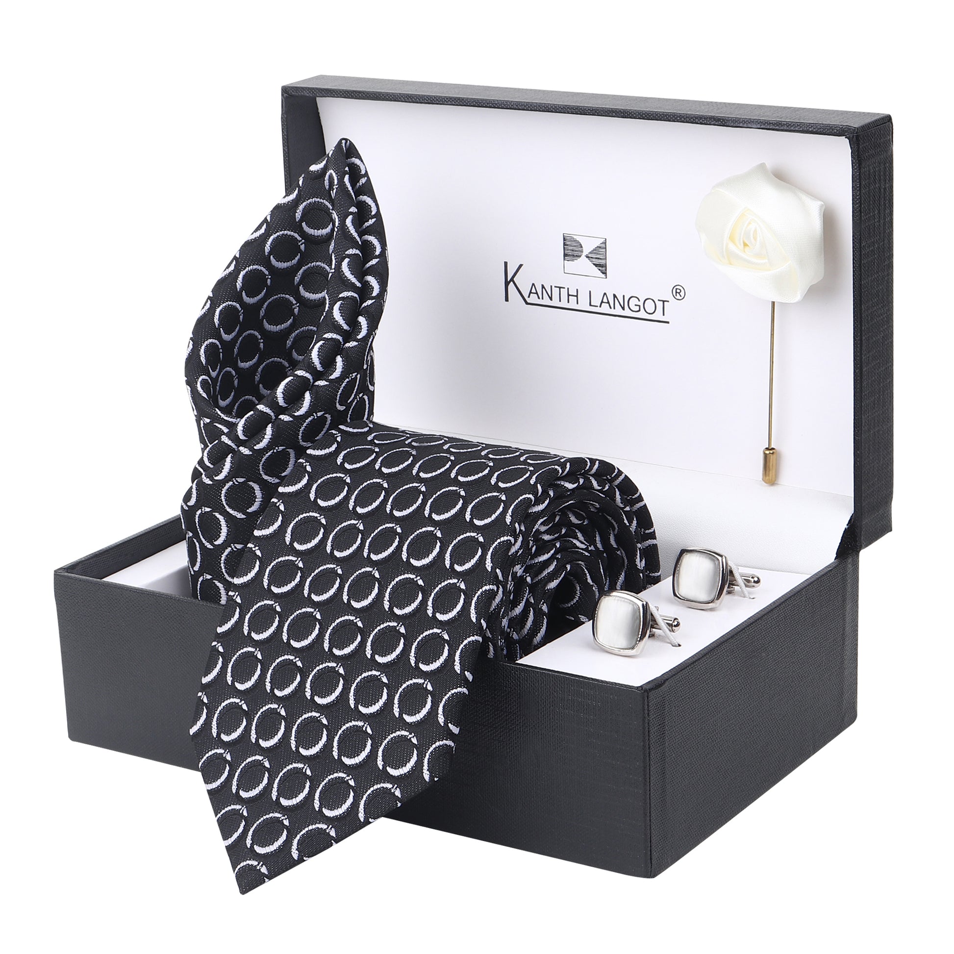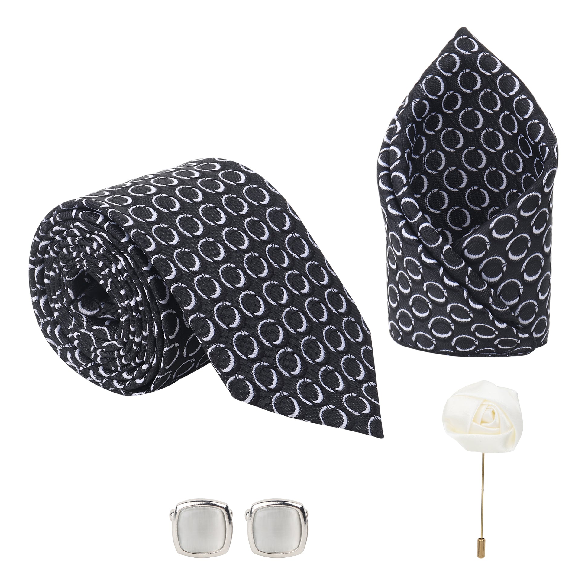 Kanthlangot Set of 4: Black Circle Pattern Tie, Pocket Square, Silver Cufflinks & White Rose Lapel Pin in Gift Box