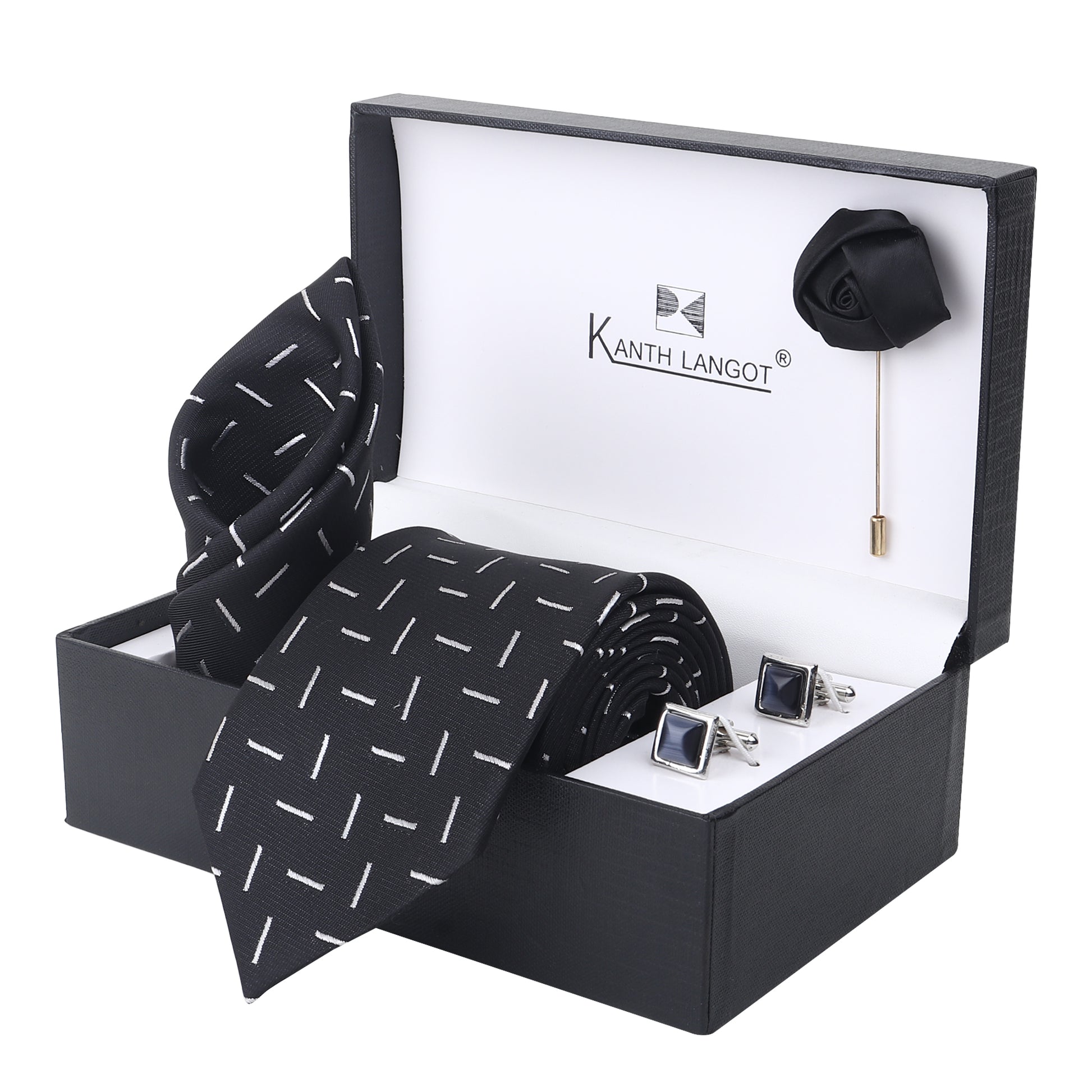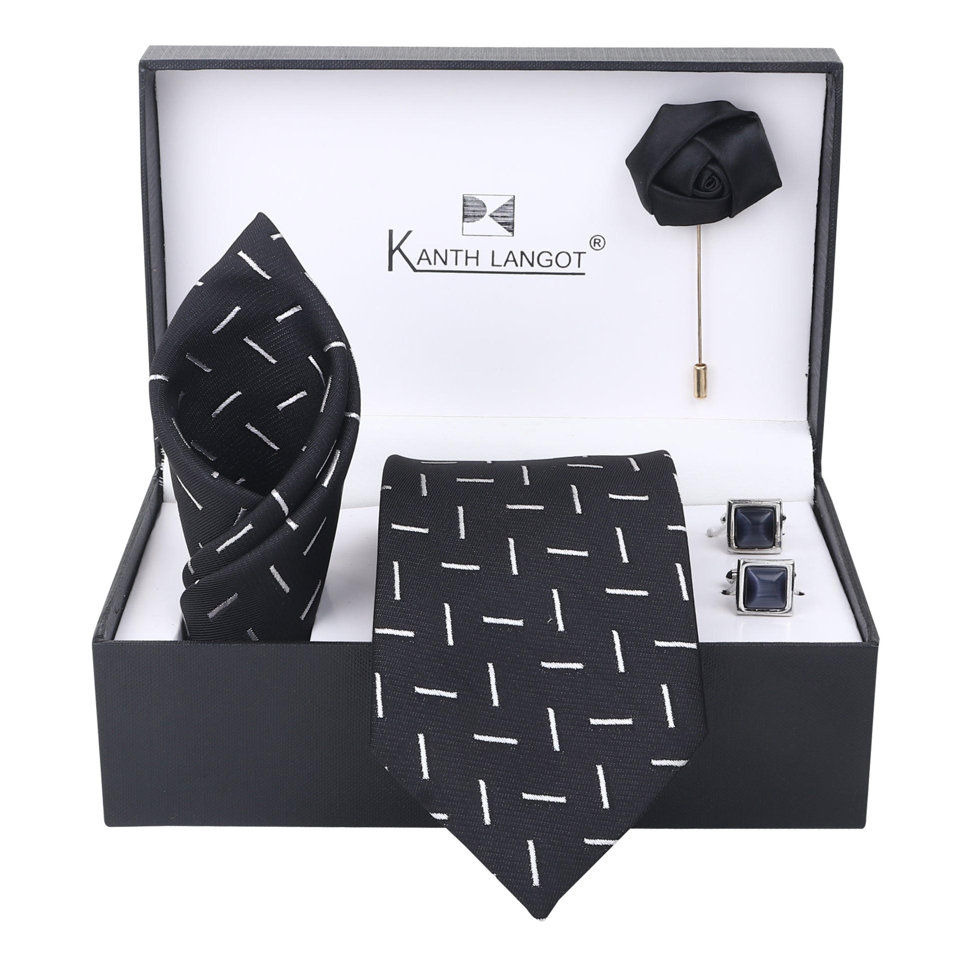 Kanthlangot Black Dash Pattern Tie with Pocket Square, Cufflinks & Lapel Pin – 4-in-1 Gift Set for Men