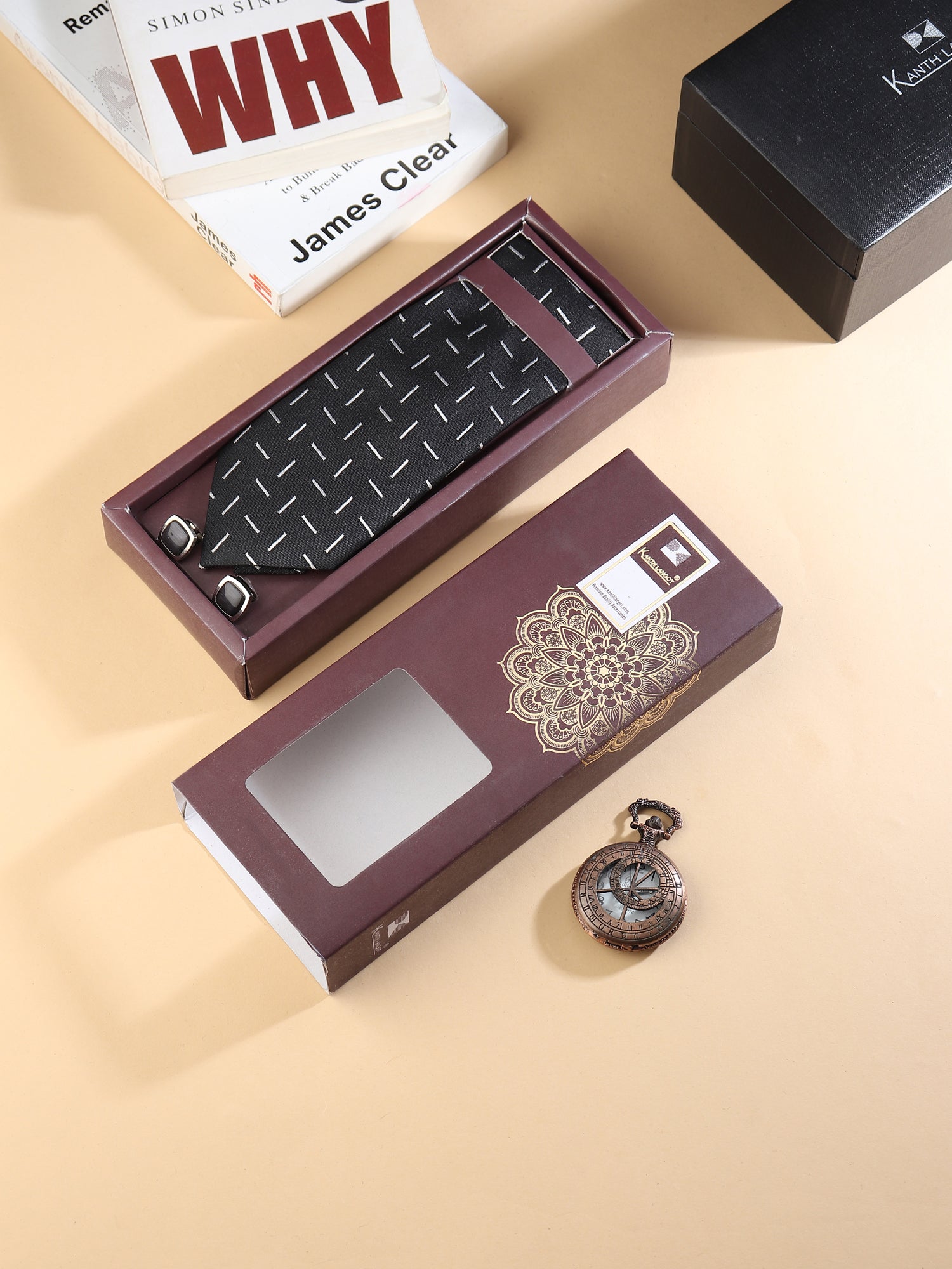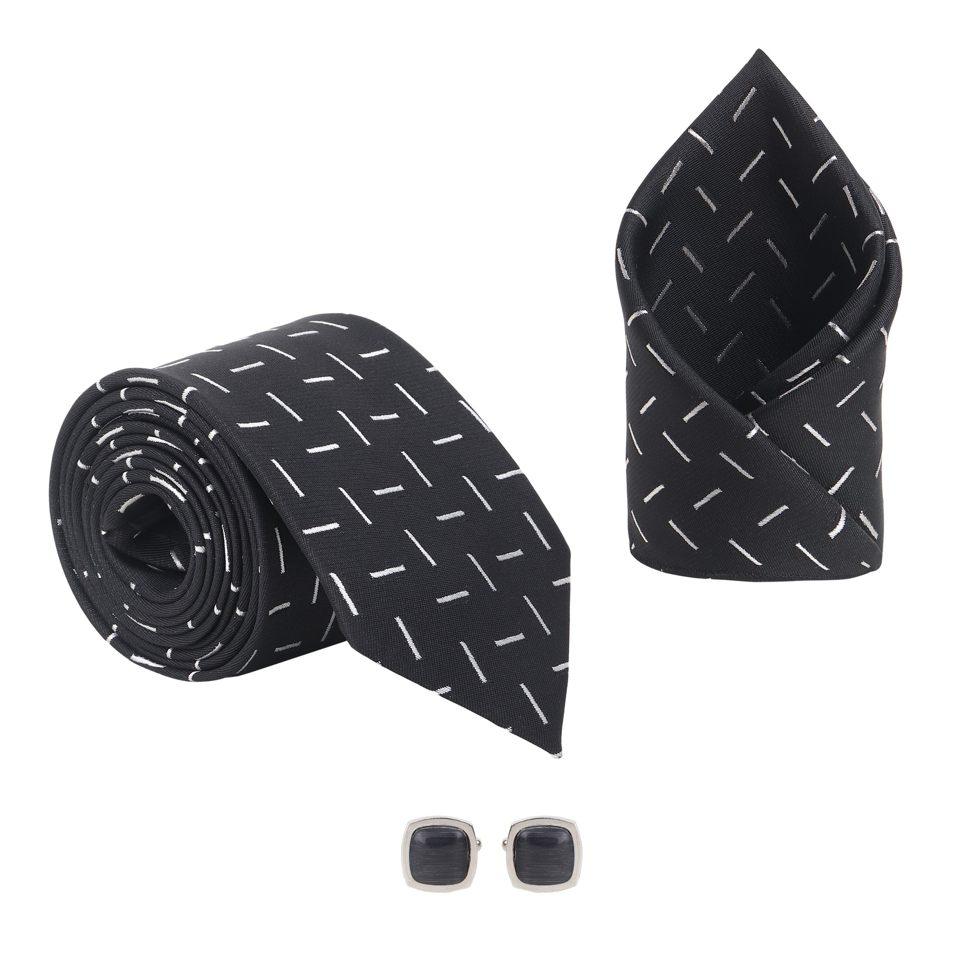 Make a subtle yet powerful statement with the Kanthlangot Men’s 3-Piece Formal Set. This stylish ensemble includes a 3-inch black necktie detailed with a crisp white dash pattern, a matching pocket square, and a pair of rounded silver cufflinks with polished black stone centers.
