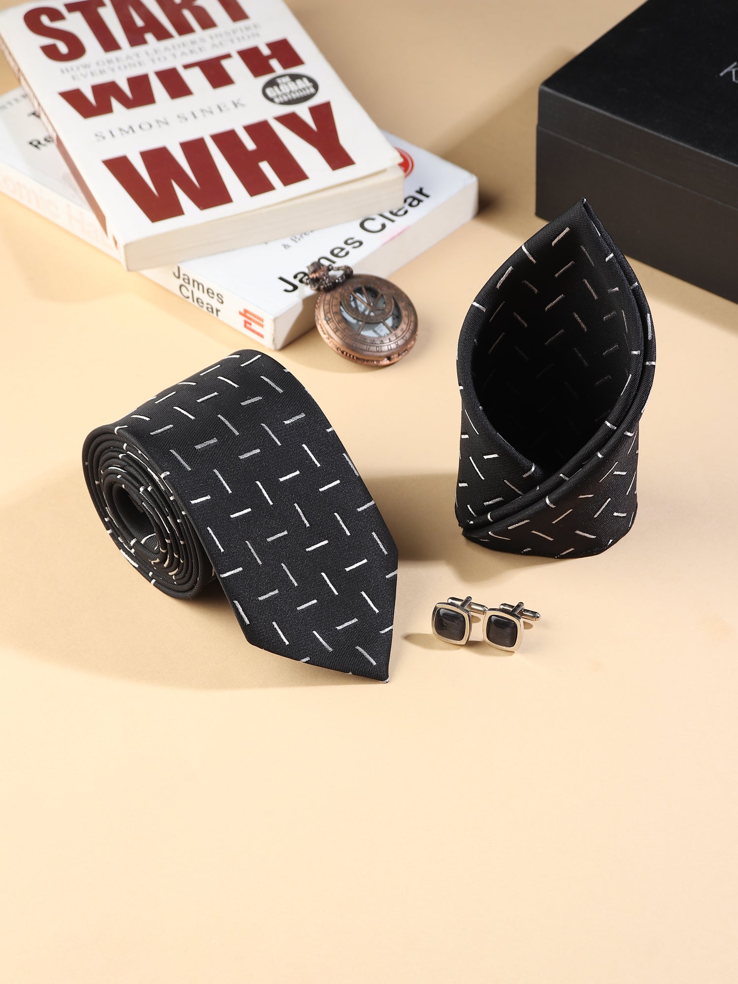 Kanthlangot Men’s 3-Piece Formal Set – Black Dash Tie, Pocket Square & Rounded Black Stone Cufflinks (3-Inch Necktie)