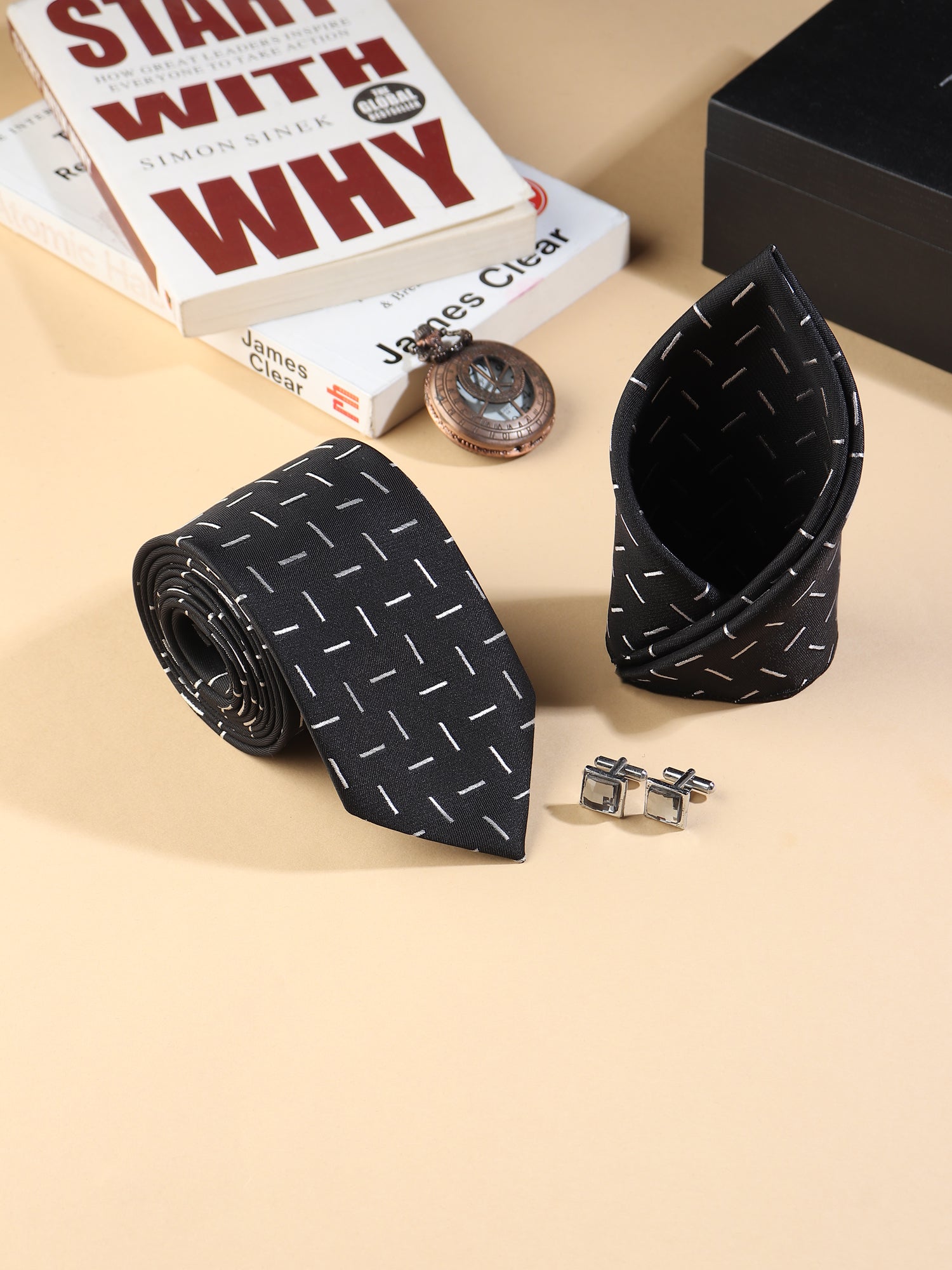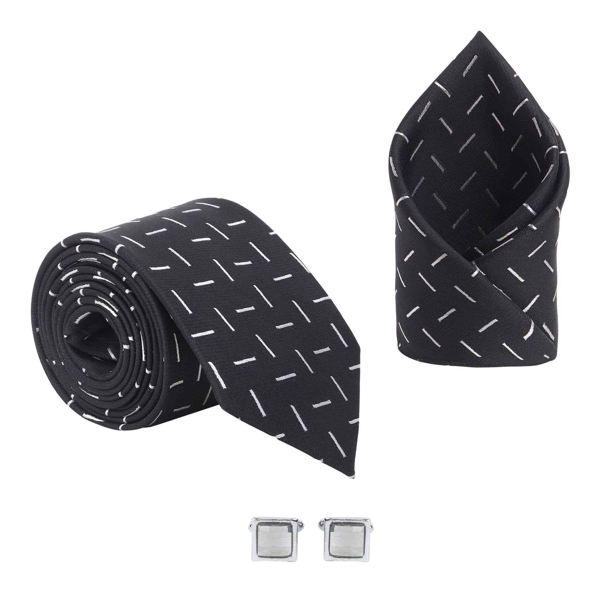 Kanthlangot Men’s 3-Piece Formal Set – Black Dash Tie, Pocket Square & Light Stone Cufflinks (3-Inch Necktie)