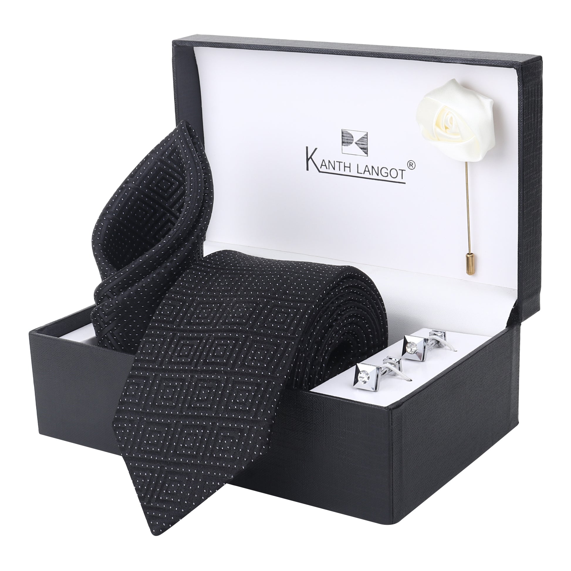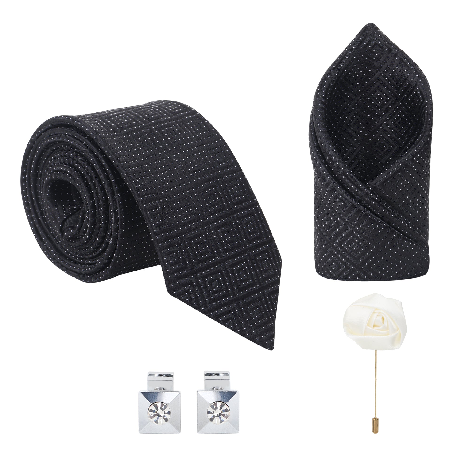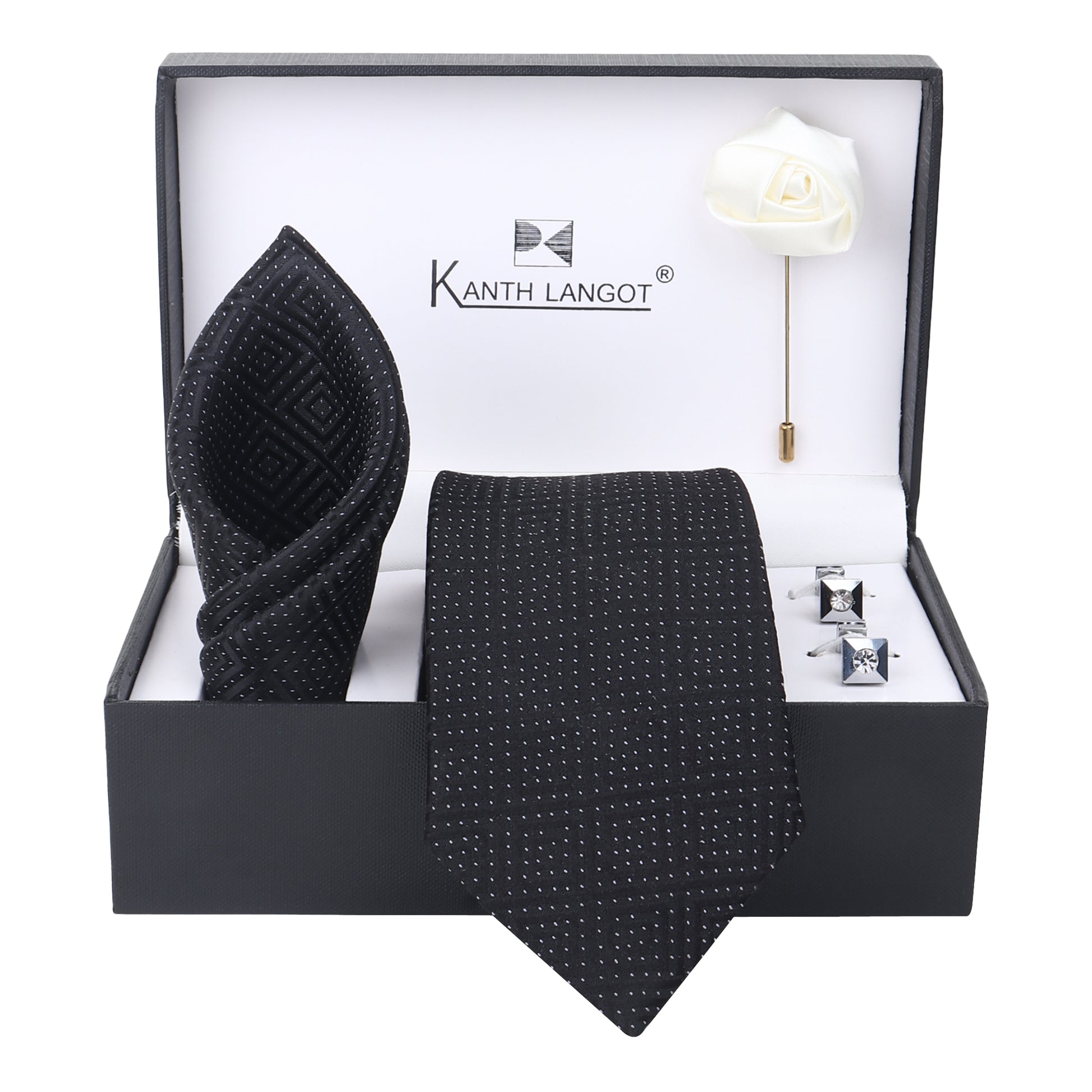 Kanthlangot Black Diamond Dot Tie Set with Pocket Square, Cufflinks & Lapel Pin – Set of 4