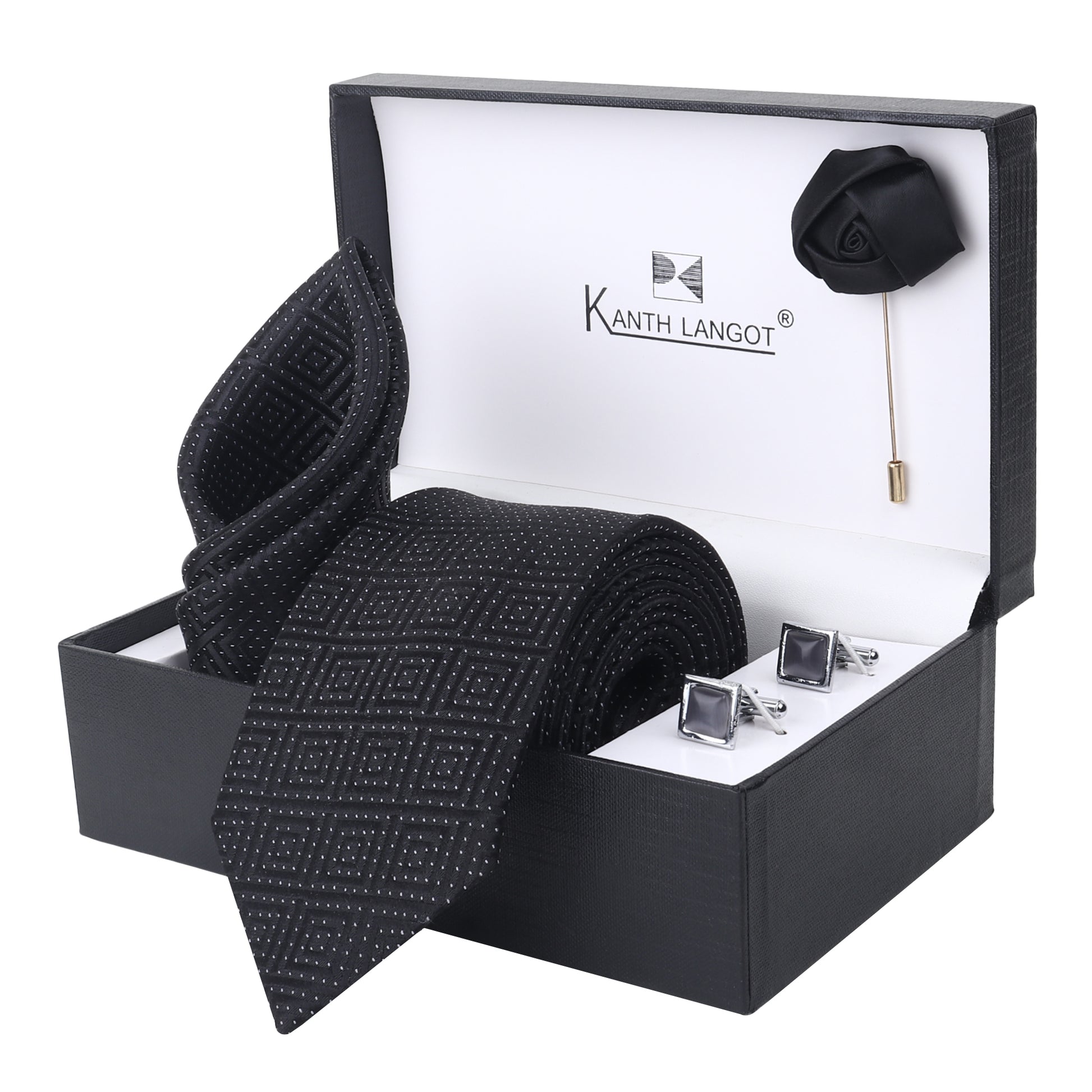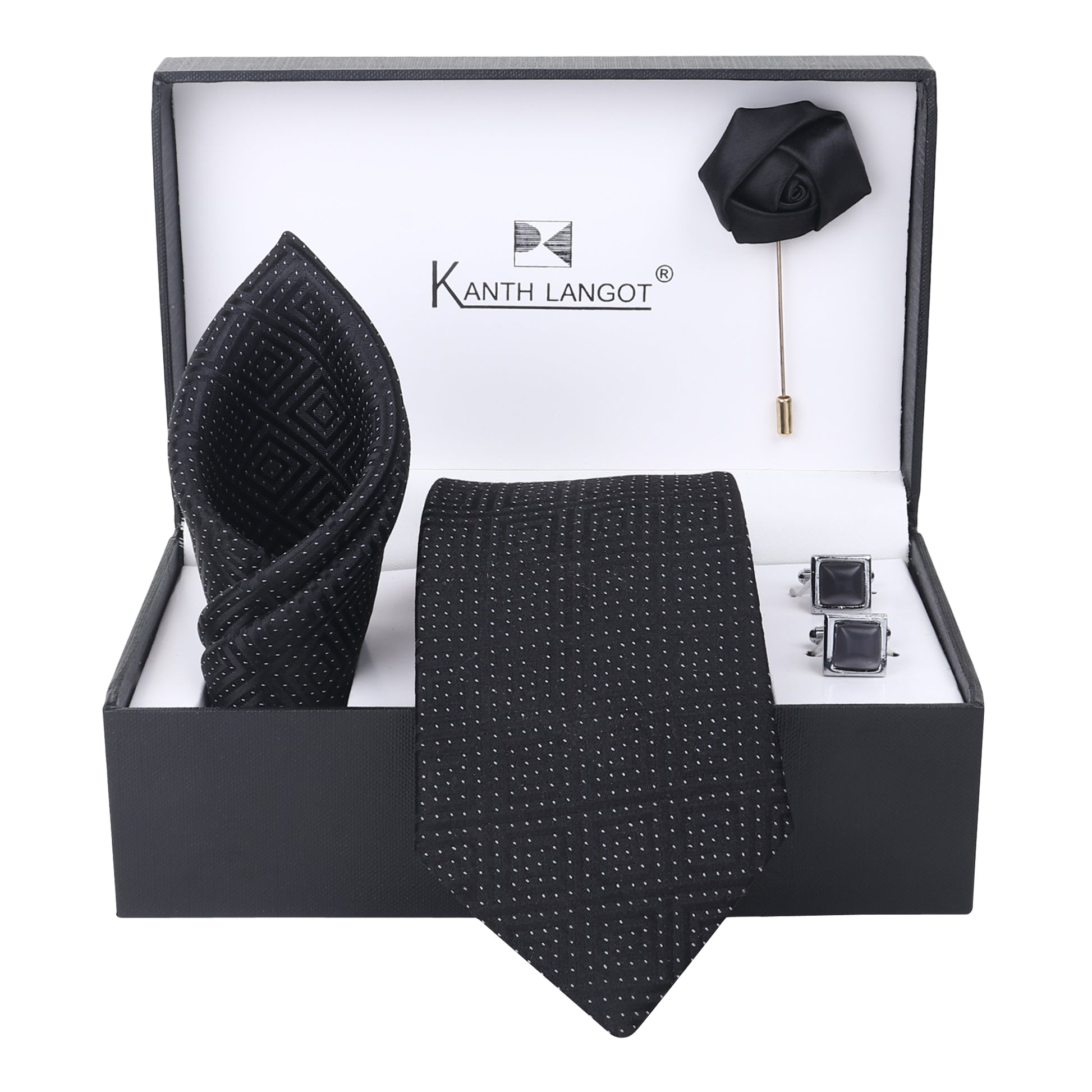 Kanthlangot Black Diamond Dot Tie Set with Pocket Square, Cufflinks & Lapel Pin – Set of 4
