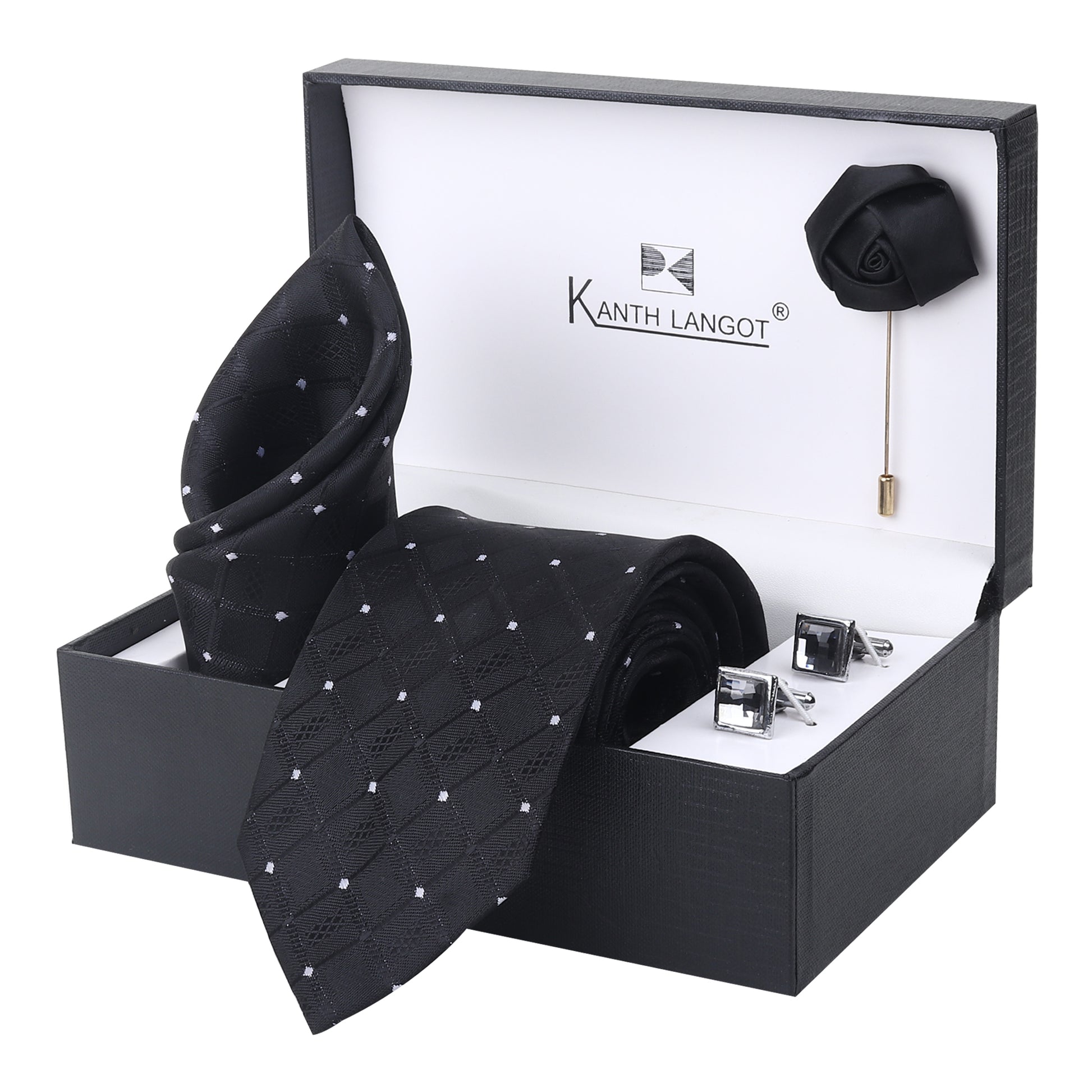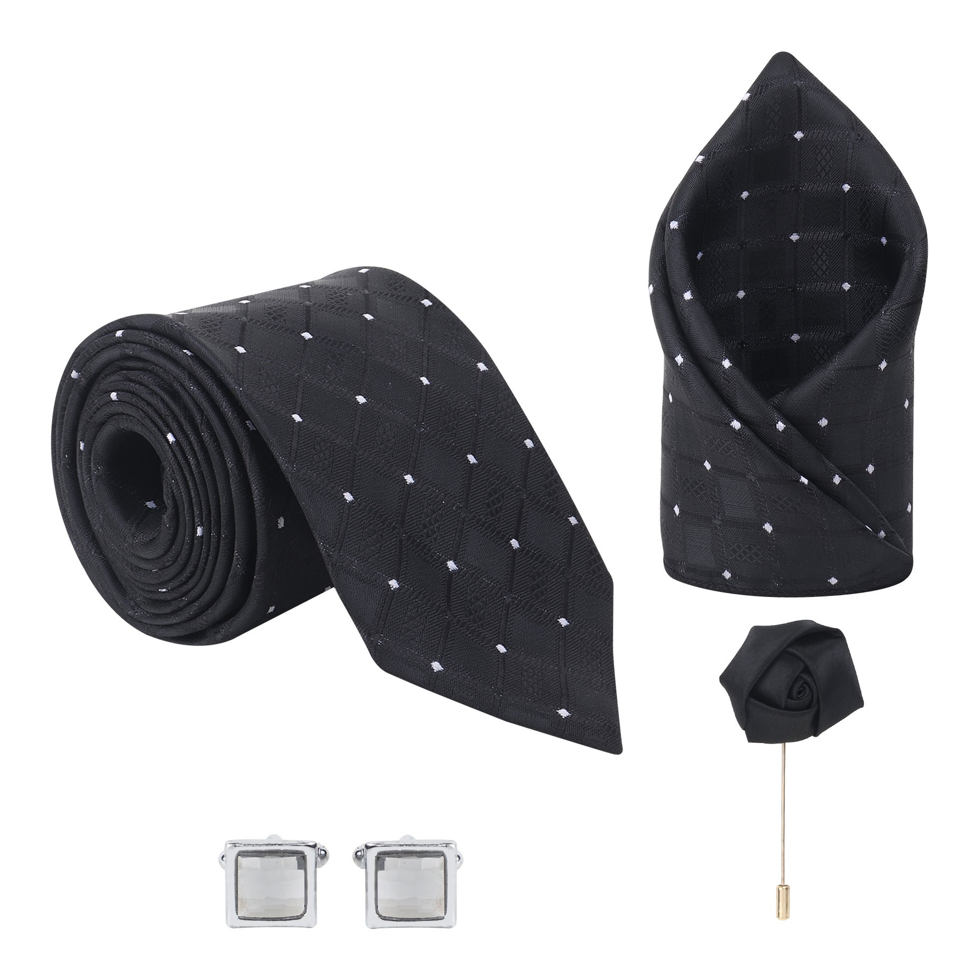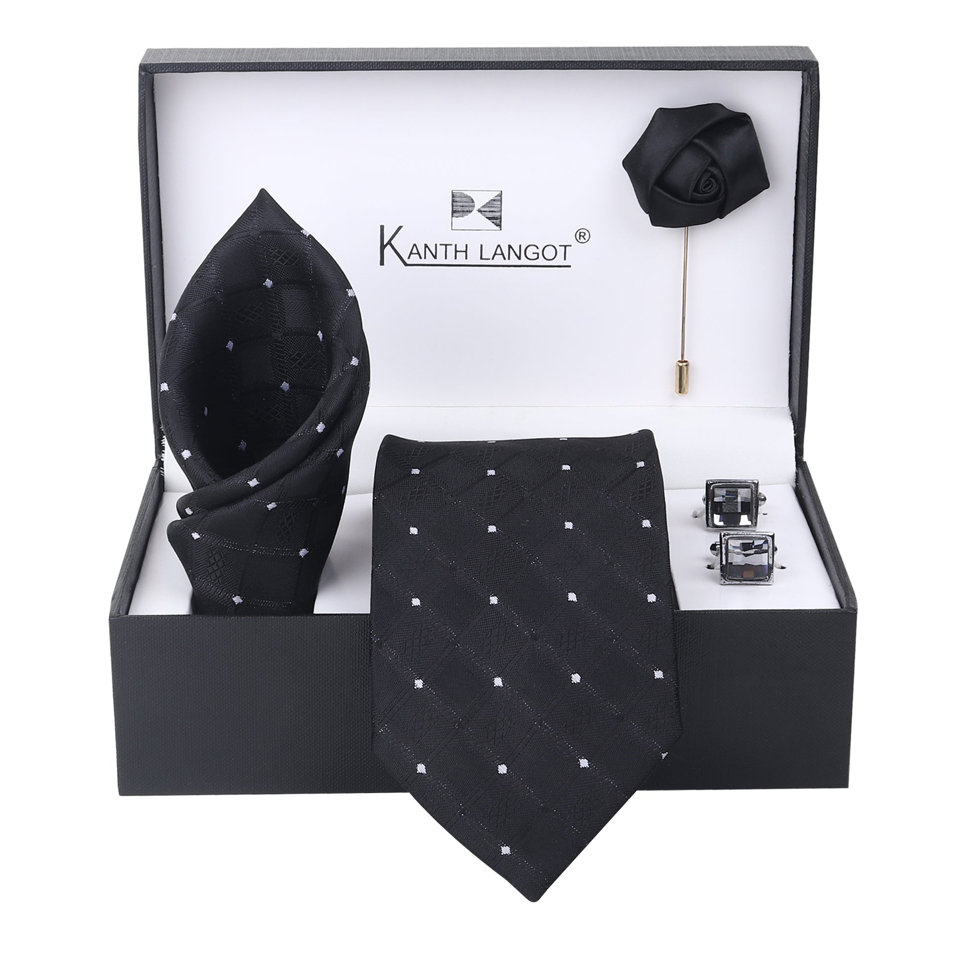 Kanthlangot Set of 4: Black Diamond Necktie, Pocket Square, Crystal Cufflinks & Black Lapel Pin in Gift Box
