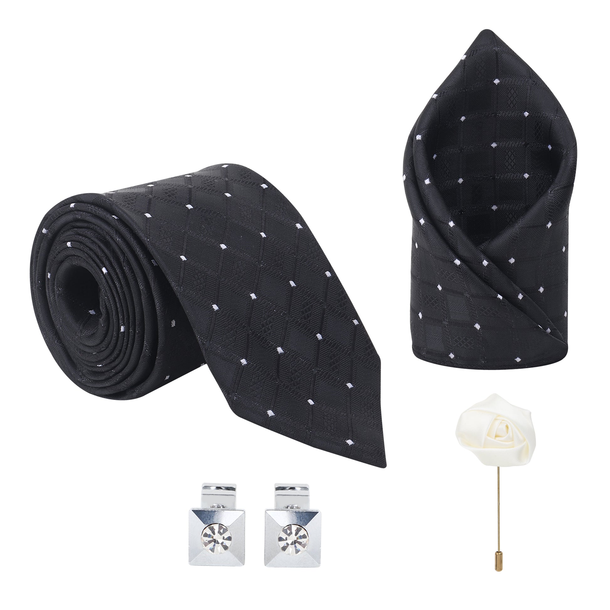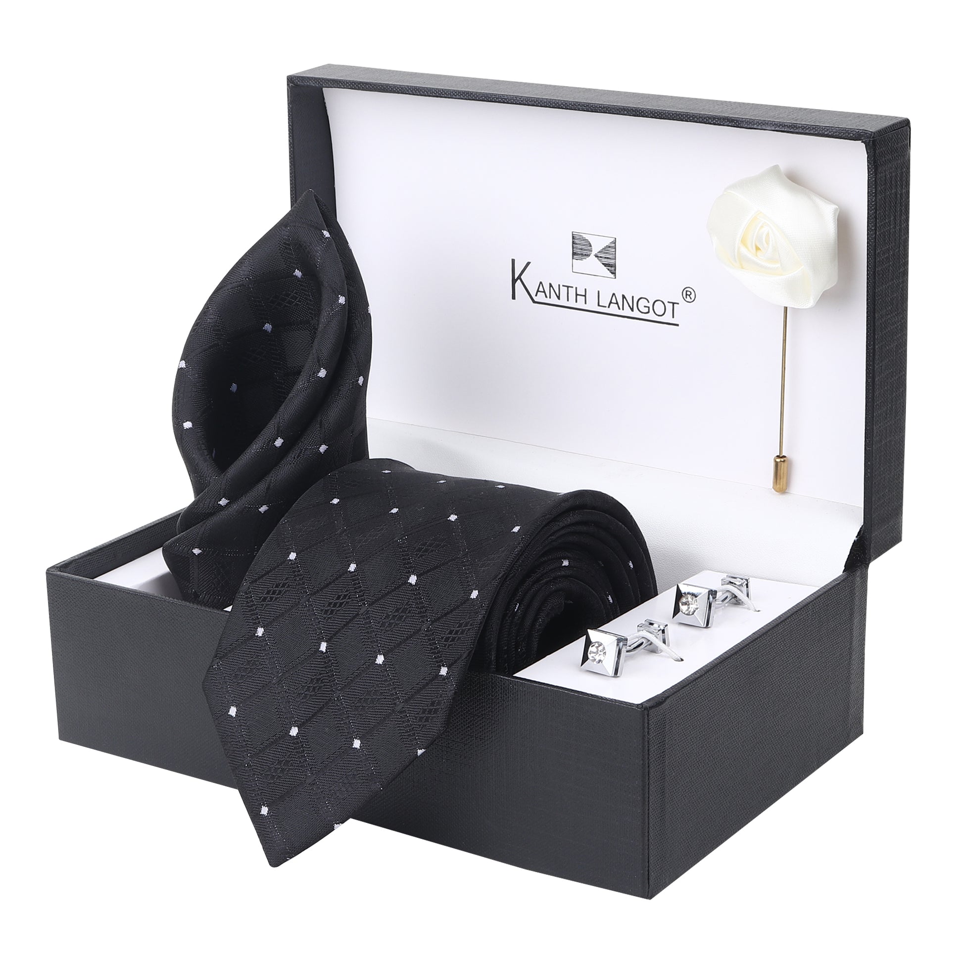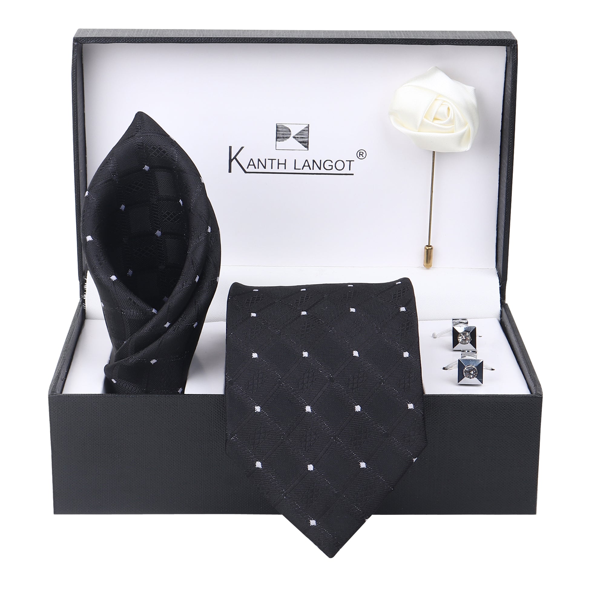 Kanthlangot Set of 4: Black Diamond Texture Tie, Pocket Square, Silver Cufflinks & White Lapel Pin in Premium Gift Box