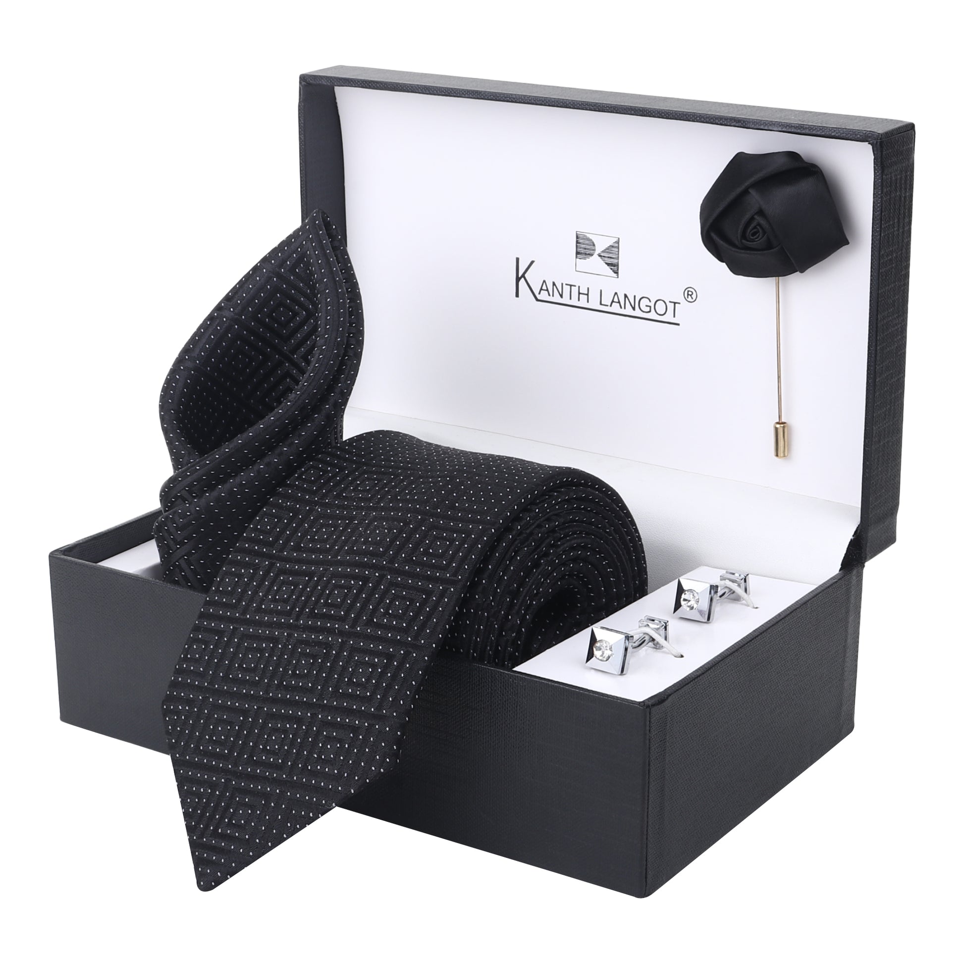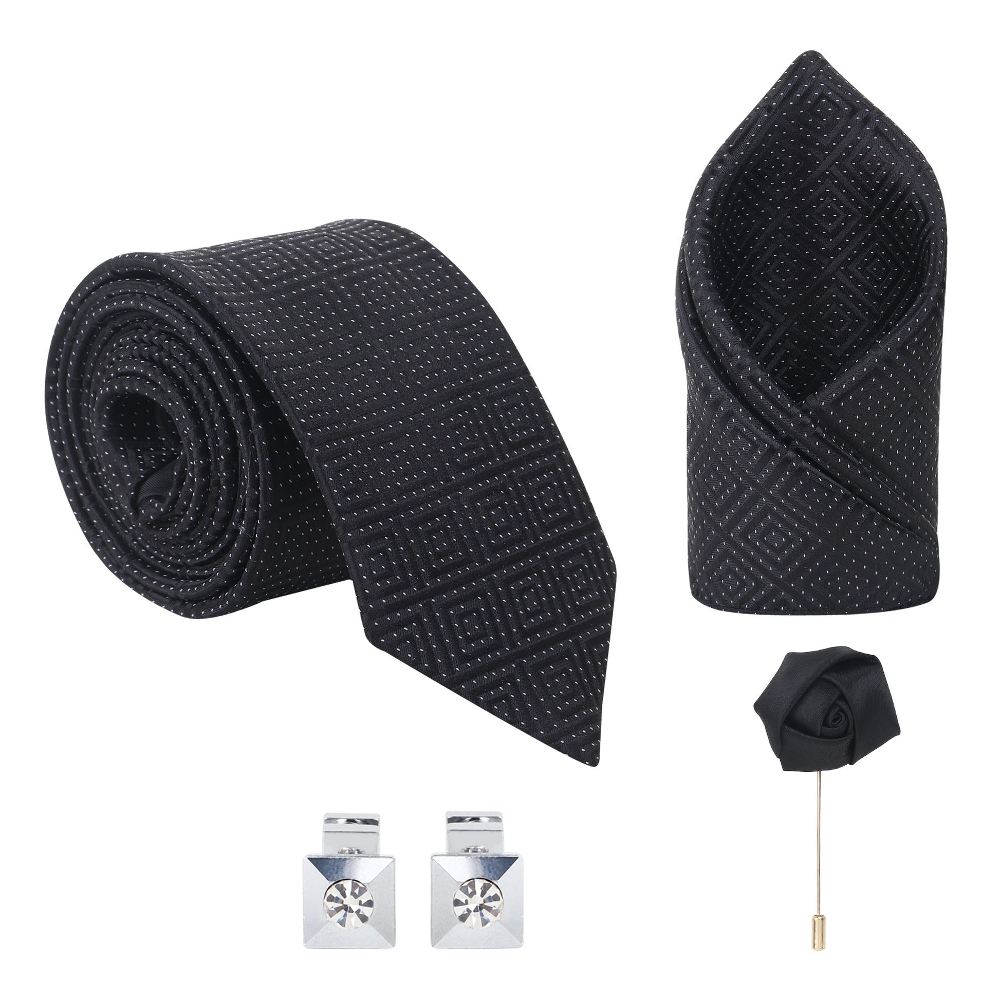 Kanthlangot Diamond Textured Black Tie Set with Pocket Square, Cufflinks & Lapel Pin – Set of 4