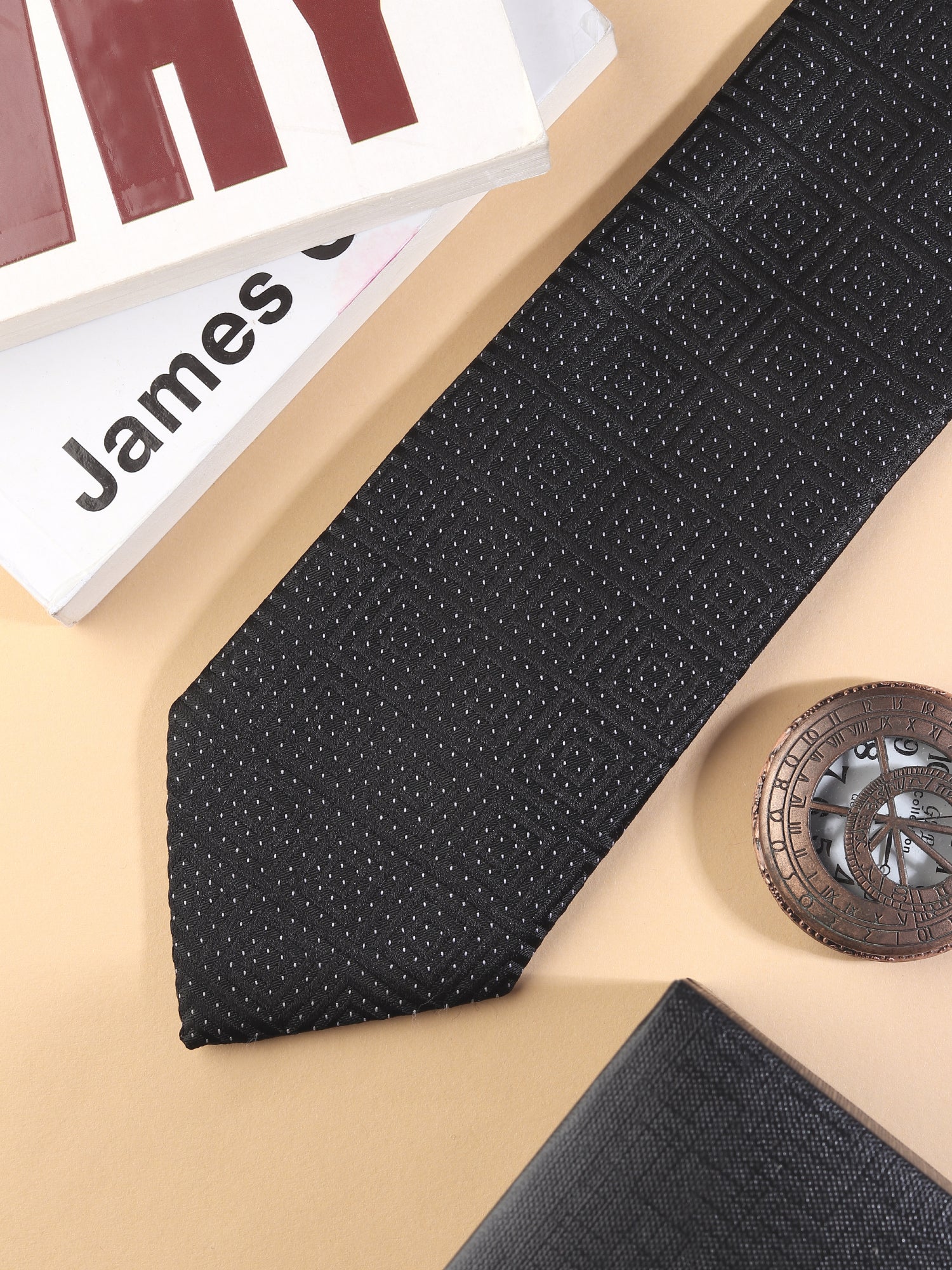 Embrace understated elegance with the Kanthlangot Black Geometric Dot Necktie & Pocket Square Set. This refined set features a deep black base adorned with a sophisticated grid-like geometric pattern and fine white dot detailing. The texture adds depth and character without being loud—perfect for those who appreciate classy, subtle style. Ideal for weddings, office wear, or formal dinners, this combo effortlessly blends tradition with a modern twist.