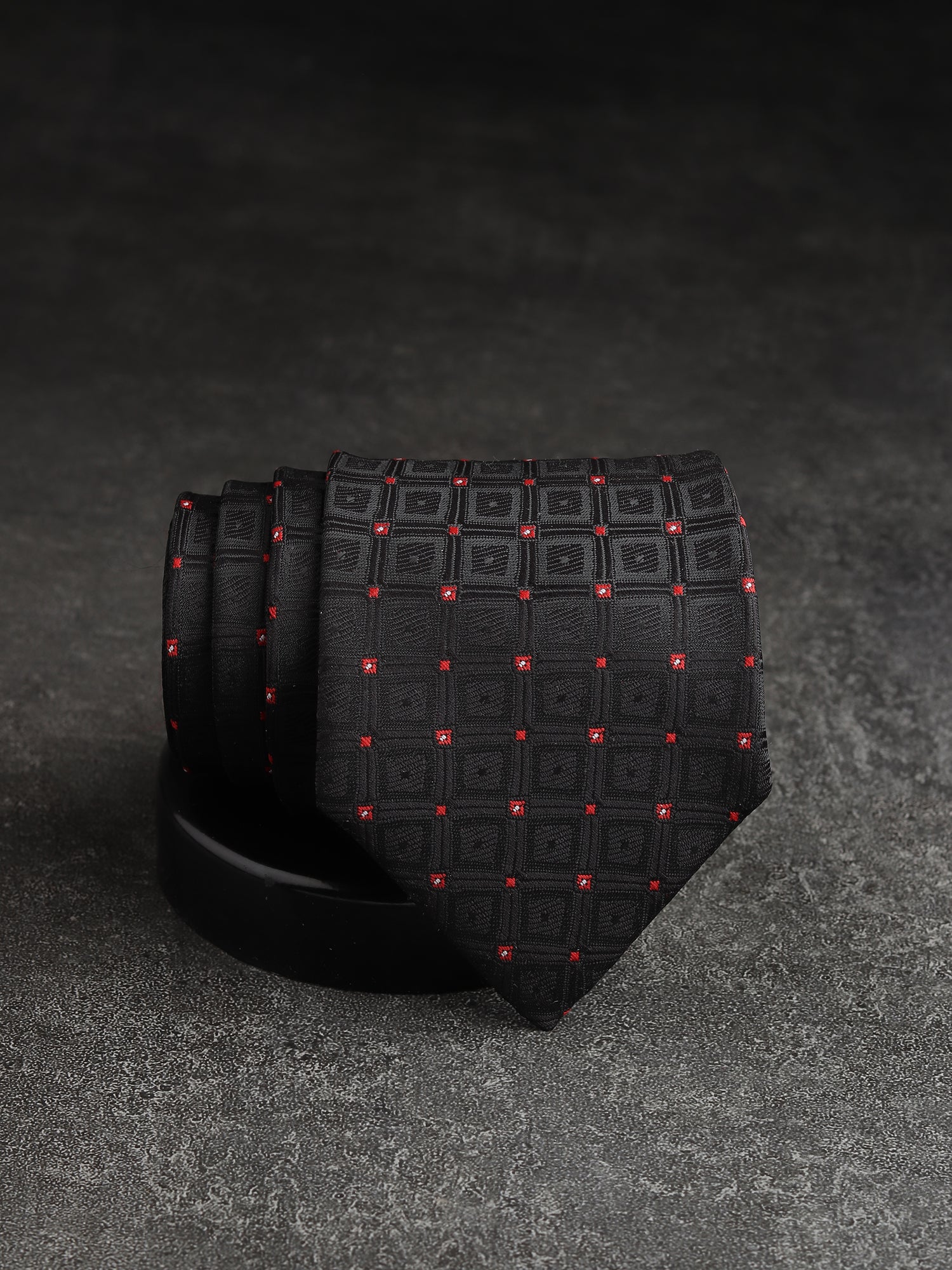 Redefine sophistication with the Kanthlangot Black Grid Pattern Necktie, a perfect blend of timeless elegance and contemporary design. Featuring a classic black base with a meticulously crafted grid pattern and vibrant red and white accents, this tie is designed to make a lasting impression.