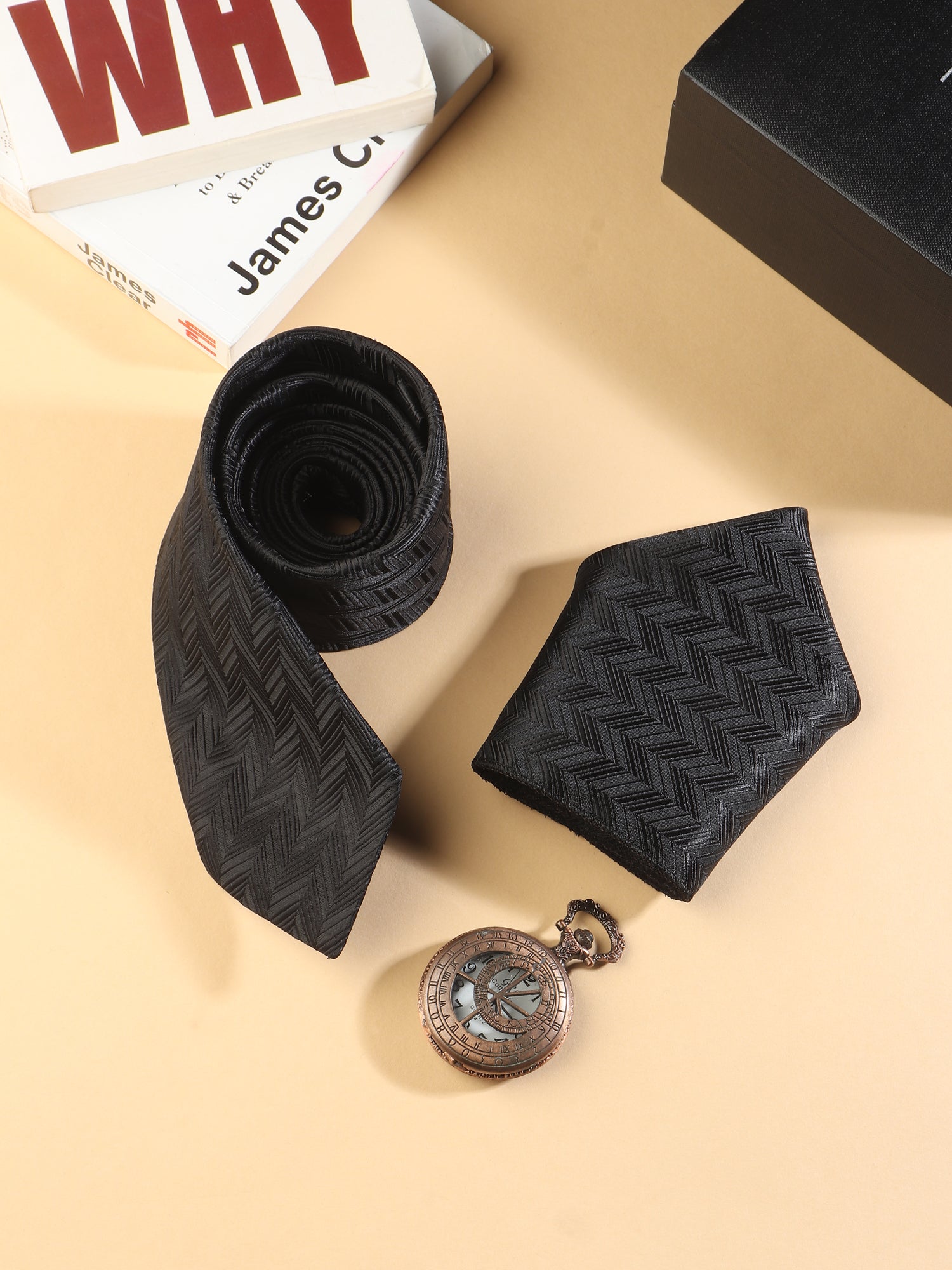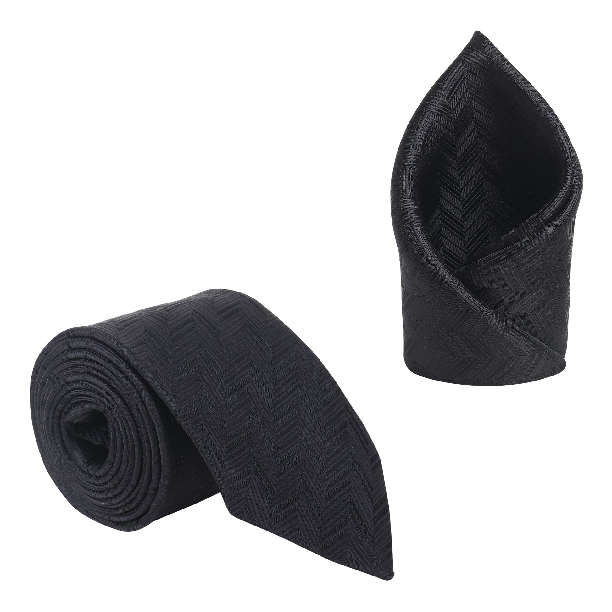Kanthlangot Black Herringbone Necktie & Pocket Square Set