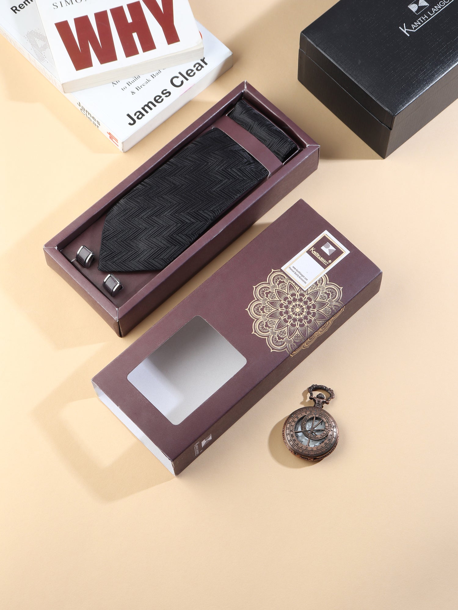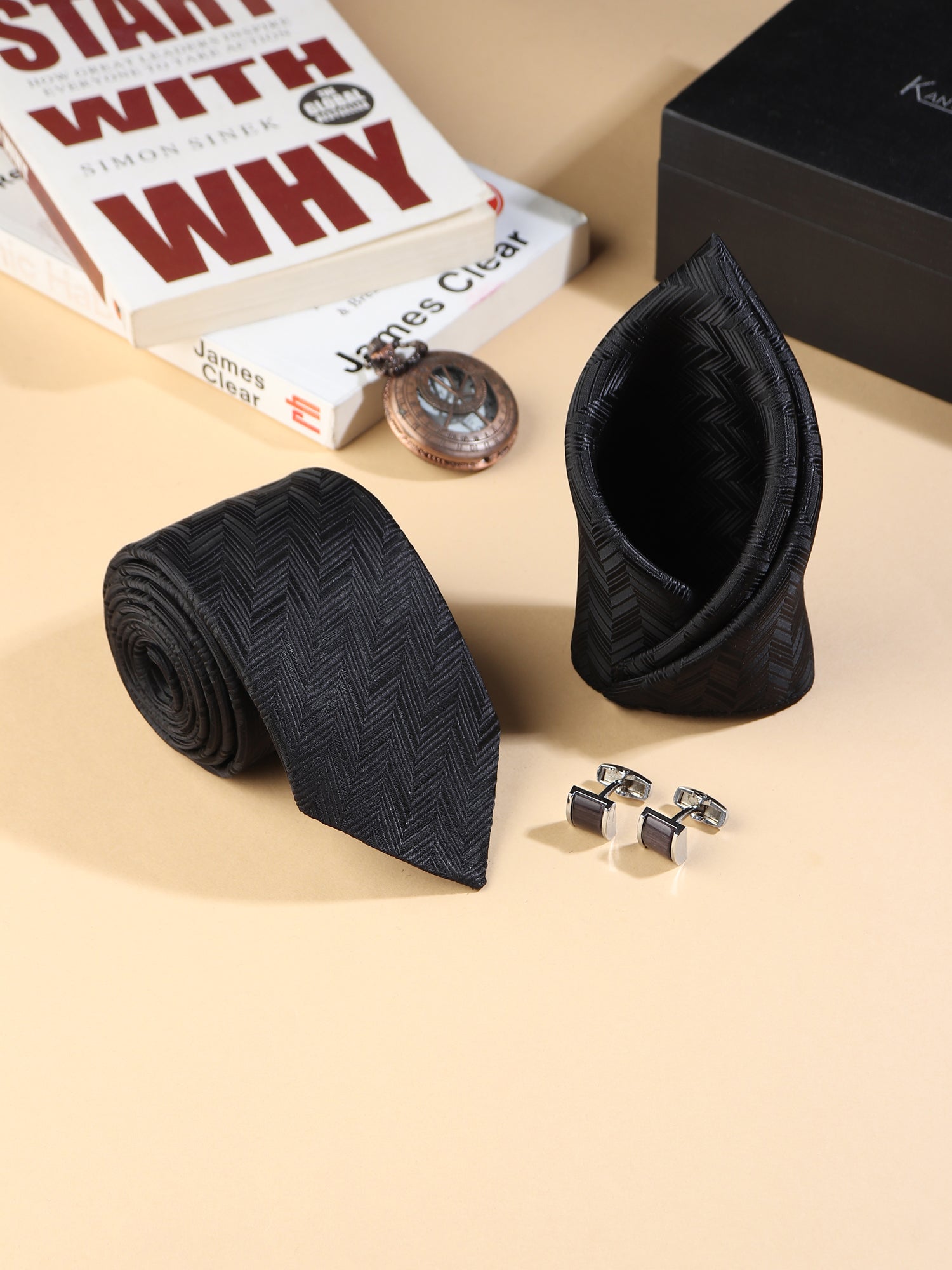Make a bold impression with classic texture and sleek detail. The Kanthlangot Men’s 3-Piece Formal Set features a rich black necktie in a sophisticated herringbone weave, a coordinated pocket square, and a pair of polished silver cufflinks with glossy black rectangular accents.