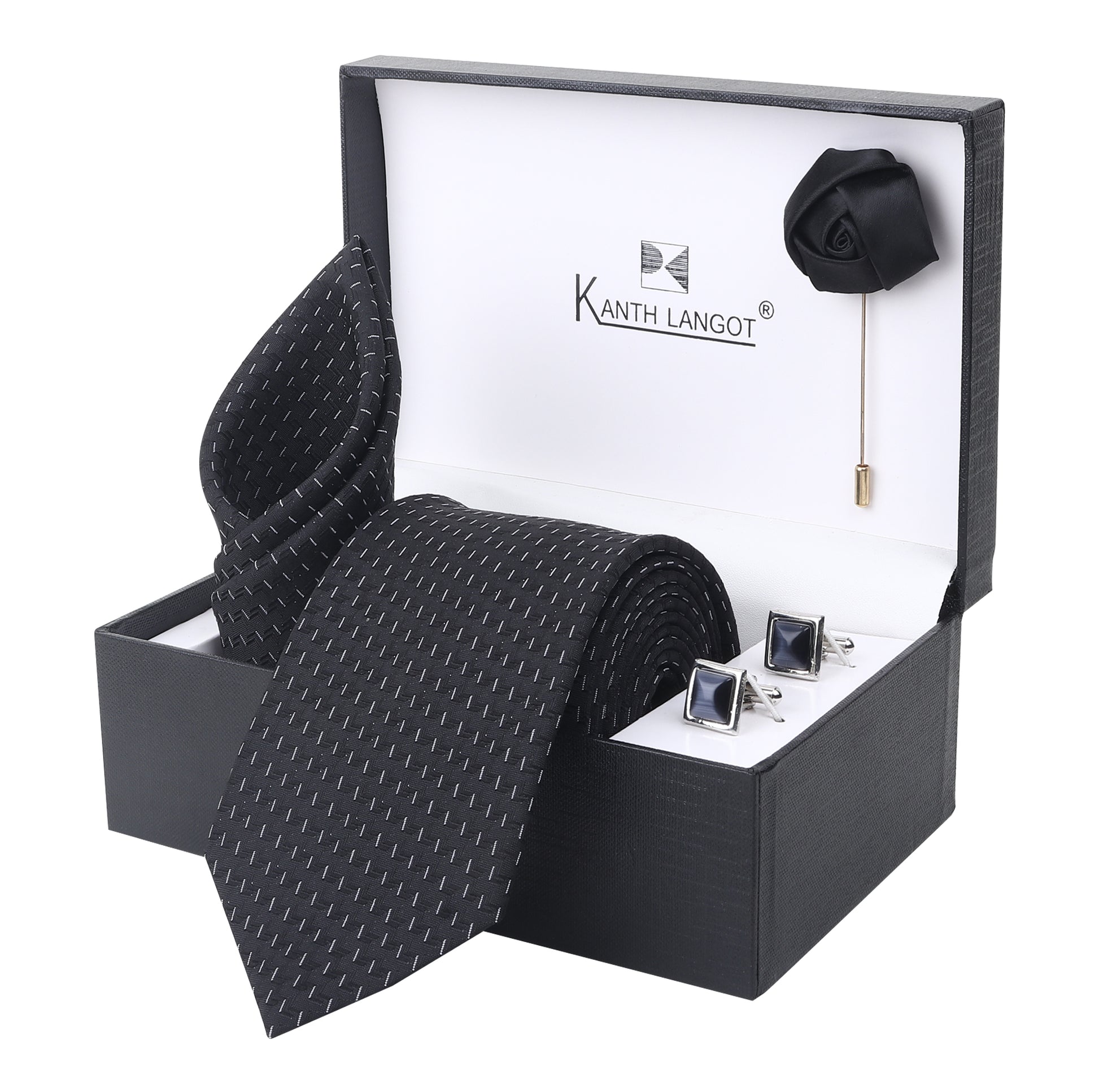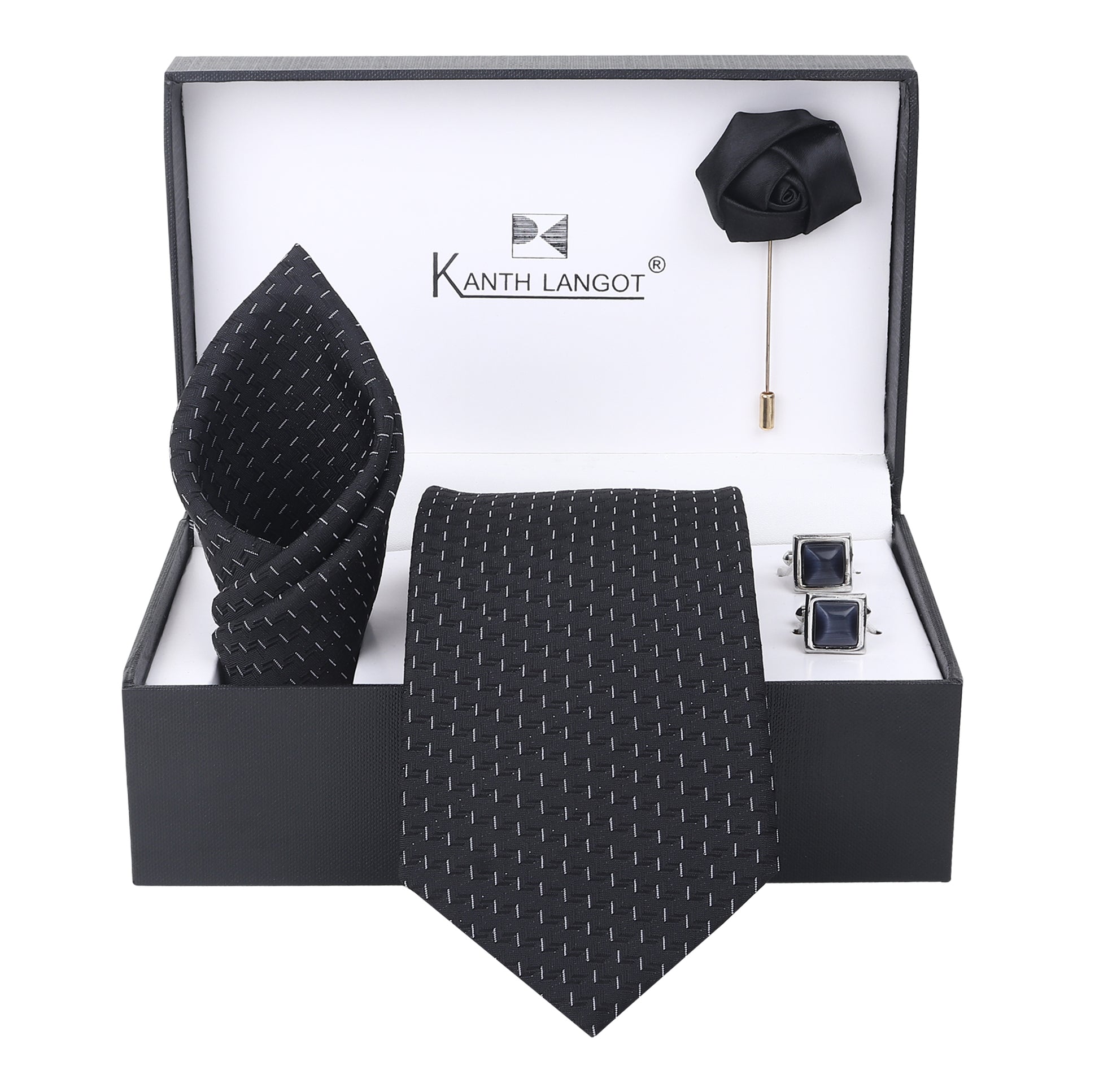 Kanthlangot Classic Black Necktie Set with Pocket Square, Cufflinks & Lapel Pin – Set of 4 for Men