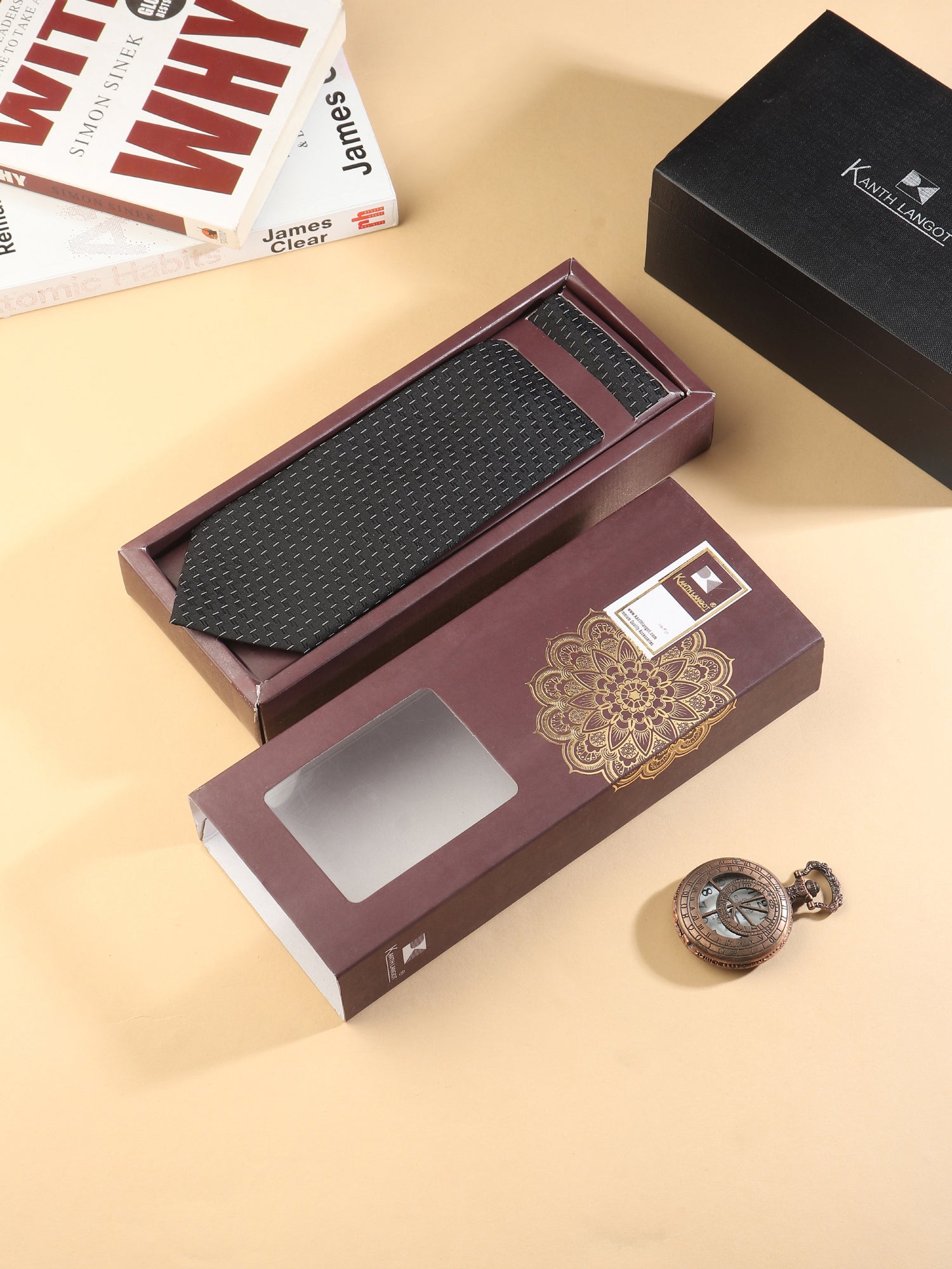 Refined and versatile, the Kanthlangot Black Micro Dash Necktie & Pocket Square Set brings a touch of understated luxury to any ensemble. With a classic black backdrop adorned with fine white dash detailing in a diagonal weave, this set offers both sophistication and subtle style. It’s the perfect pick for men who prefer elegance in the details—whether it’s for a formal event, corporate setting, or a special celebration.