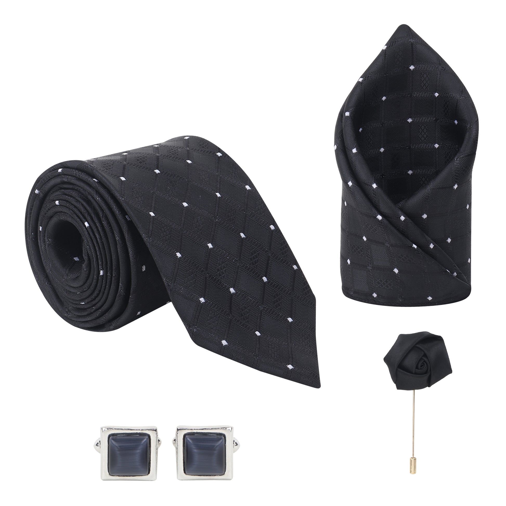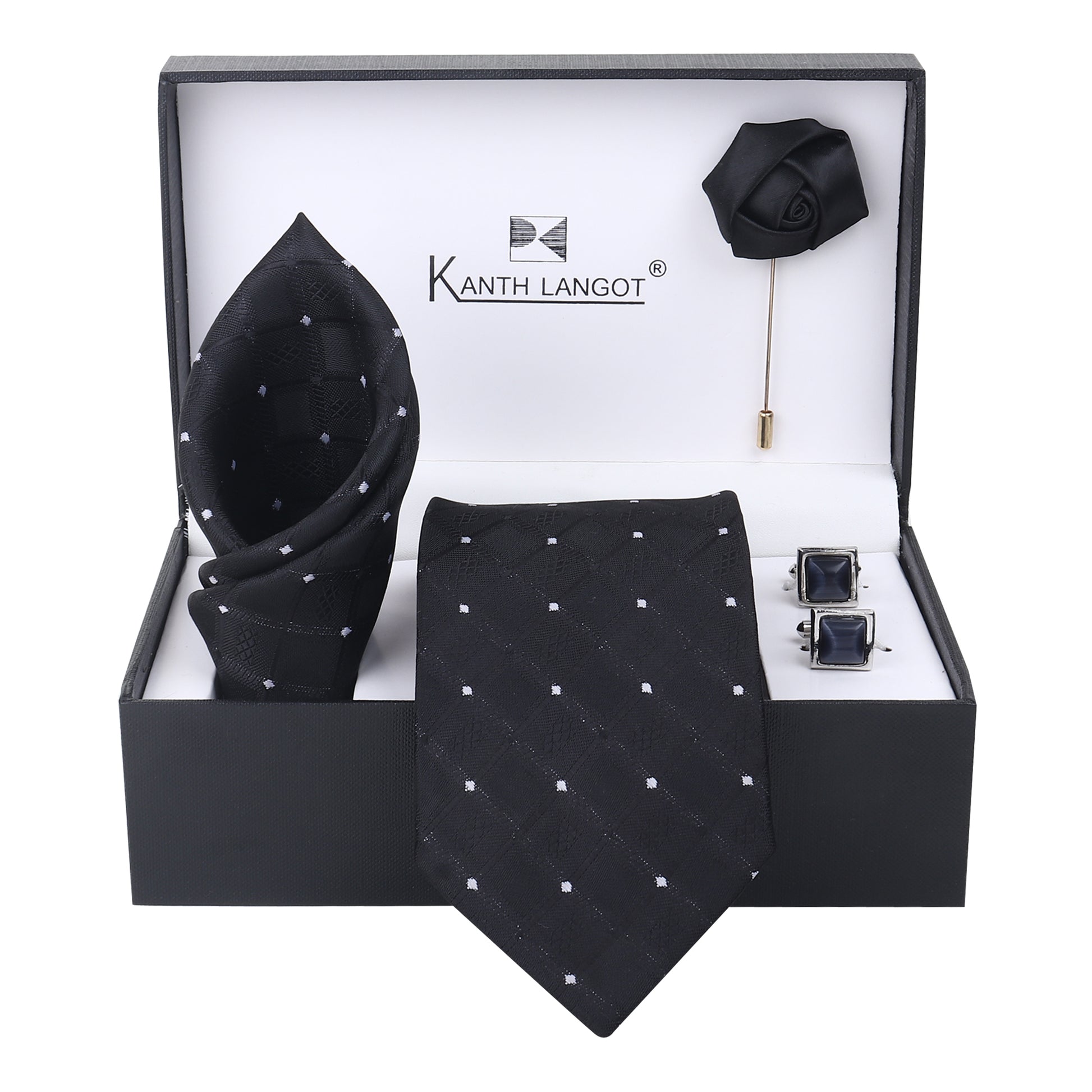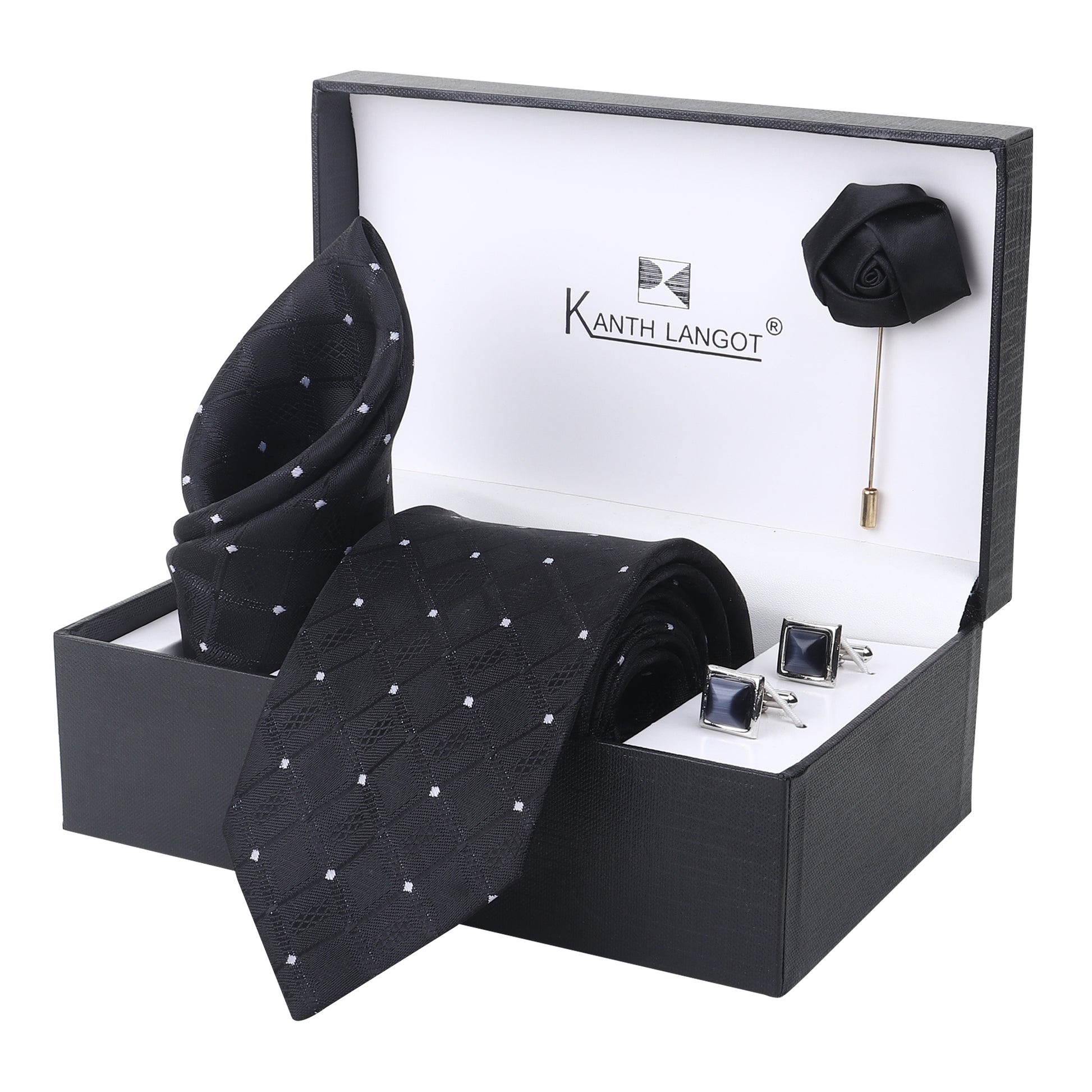 Kanthlangot Set of 4: Black Diamond-Pattern Necktie, Pocket Square, Blue Cufflinks & Lapel Pin in Premium Gift Box