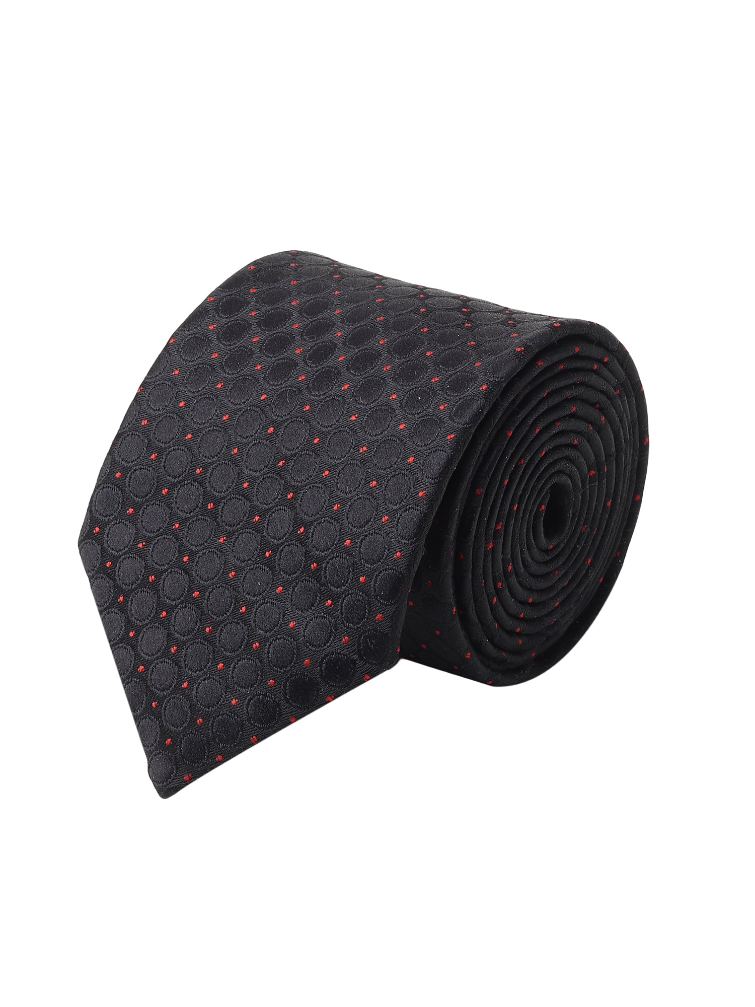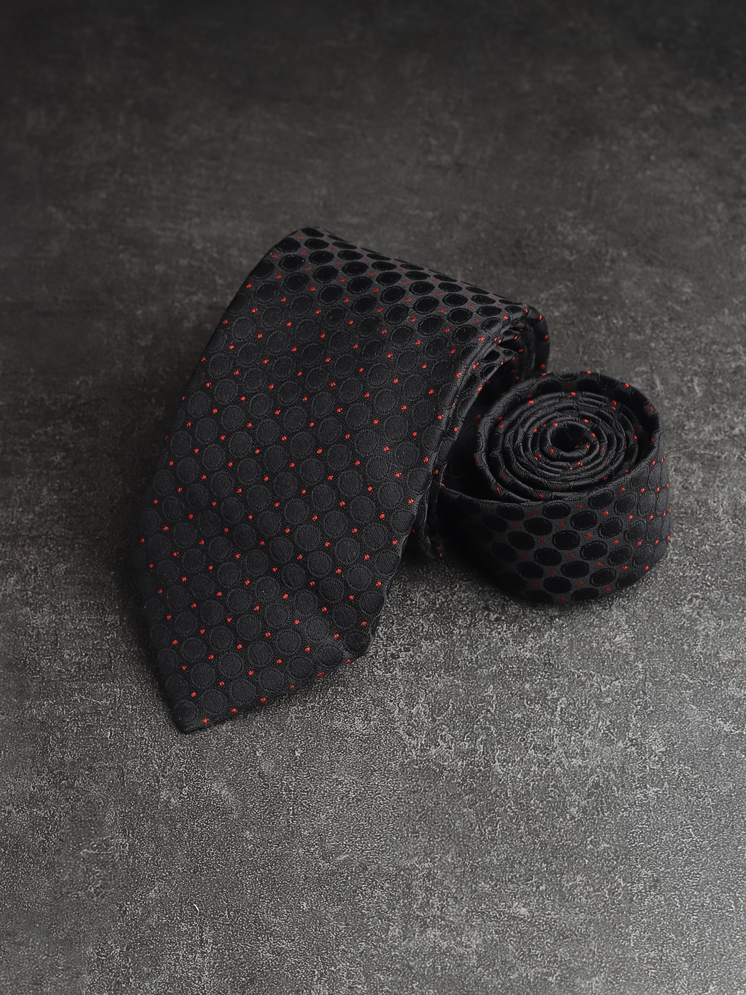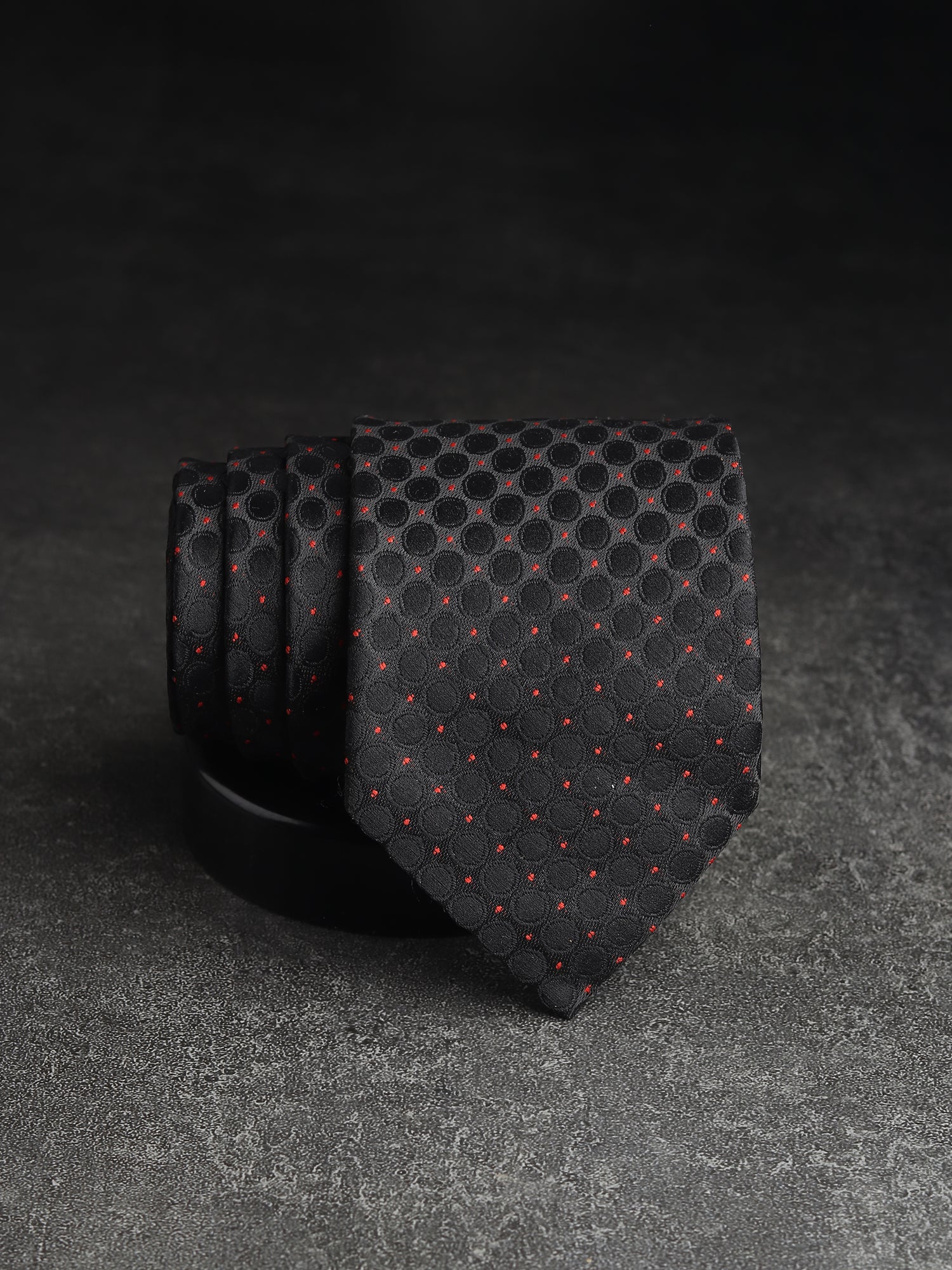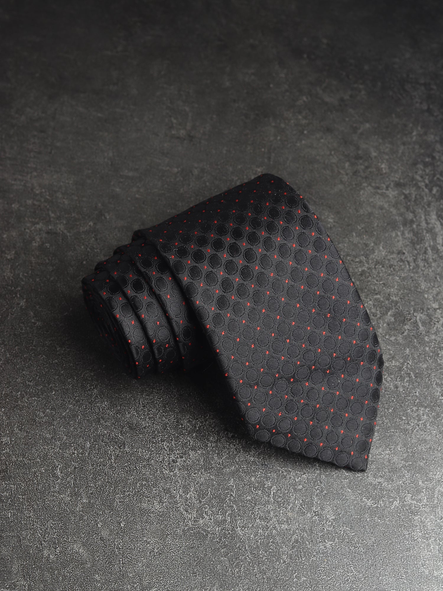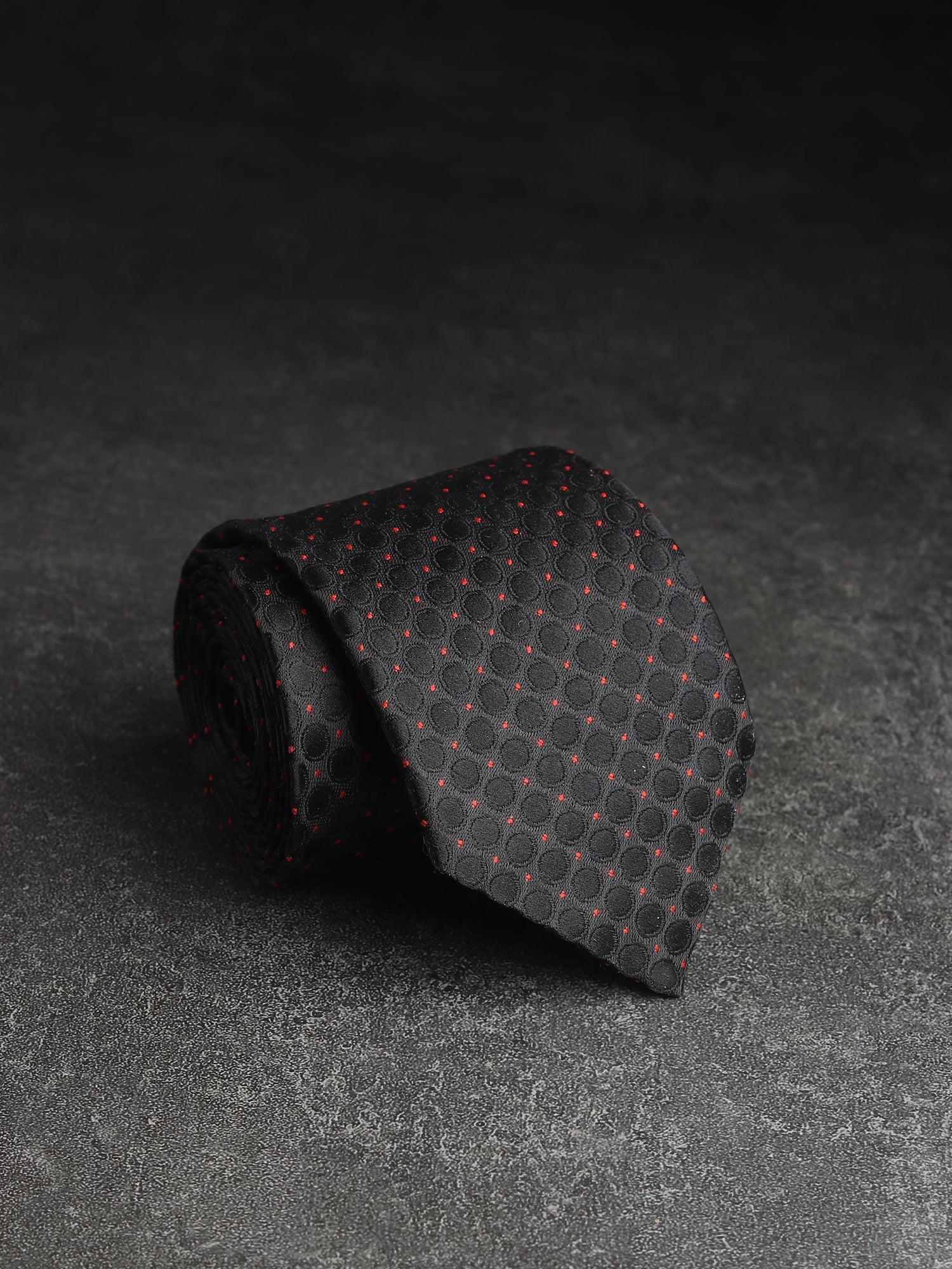 Elevate your formalwear with the Kanthlangot Black Textured Circle Pattern Necktie, designed for men who appreciate subtle details and refined elegance. The sophisticated black base is adorned with an intricate circular weave, accented by tiny red stitches, adding a touch of understated luxury.