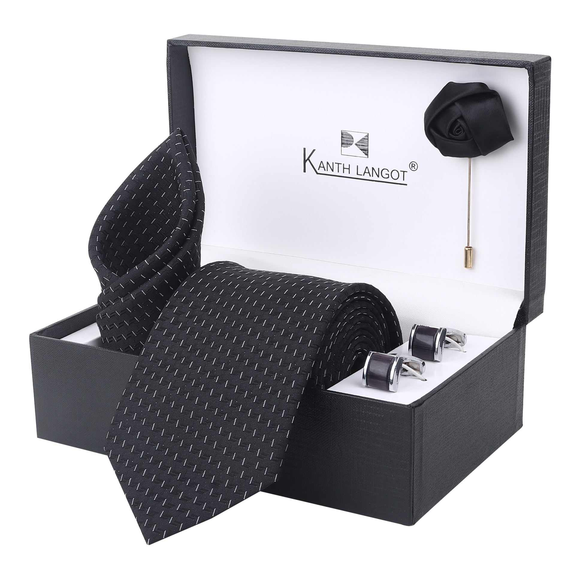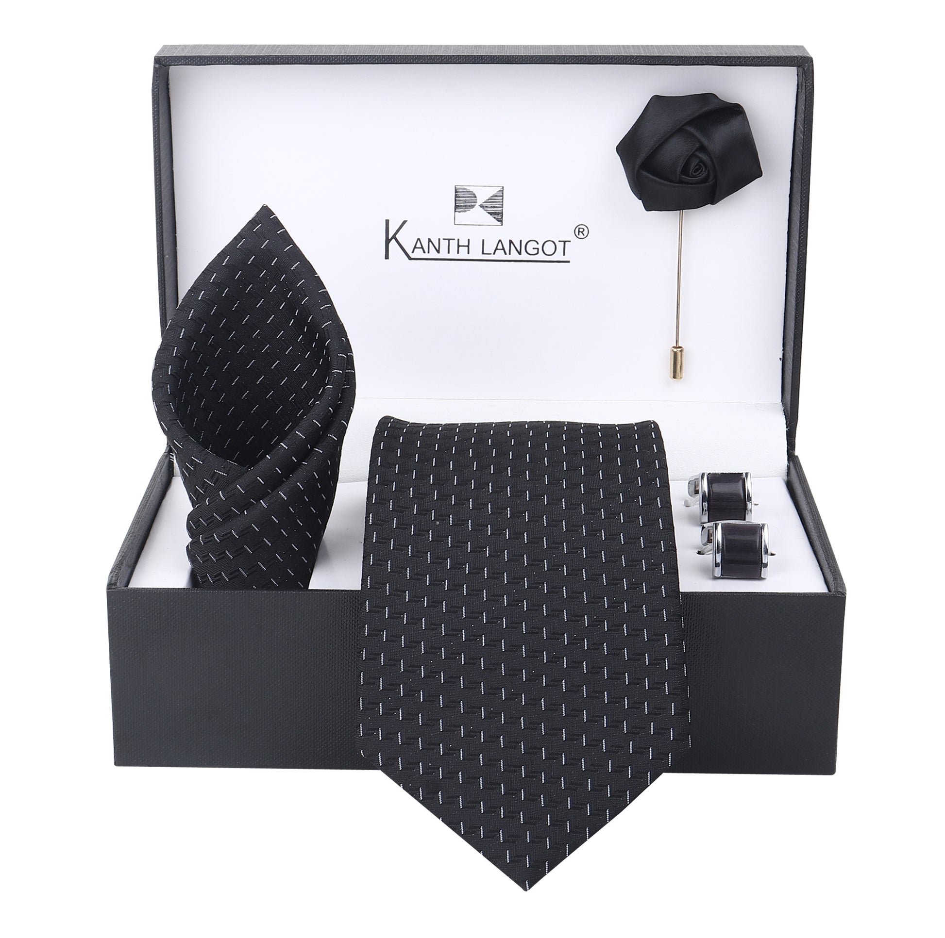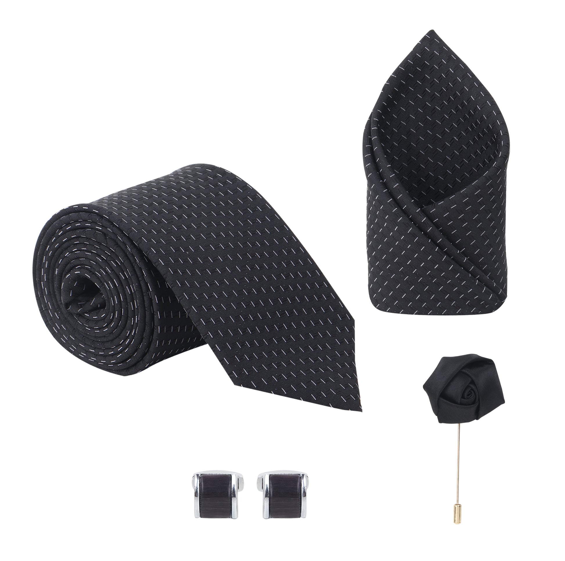 Kanthlangot Black Textured Necktie Set with Pocket Square, Cufflinks & Lapel Pin – Gift Set of 4