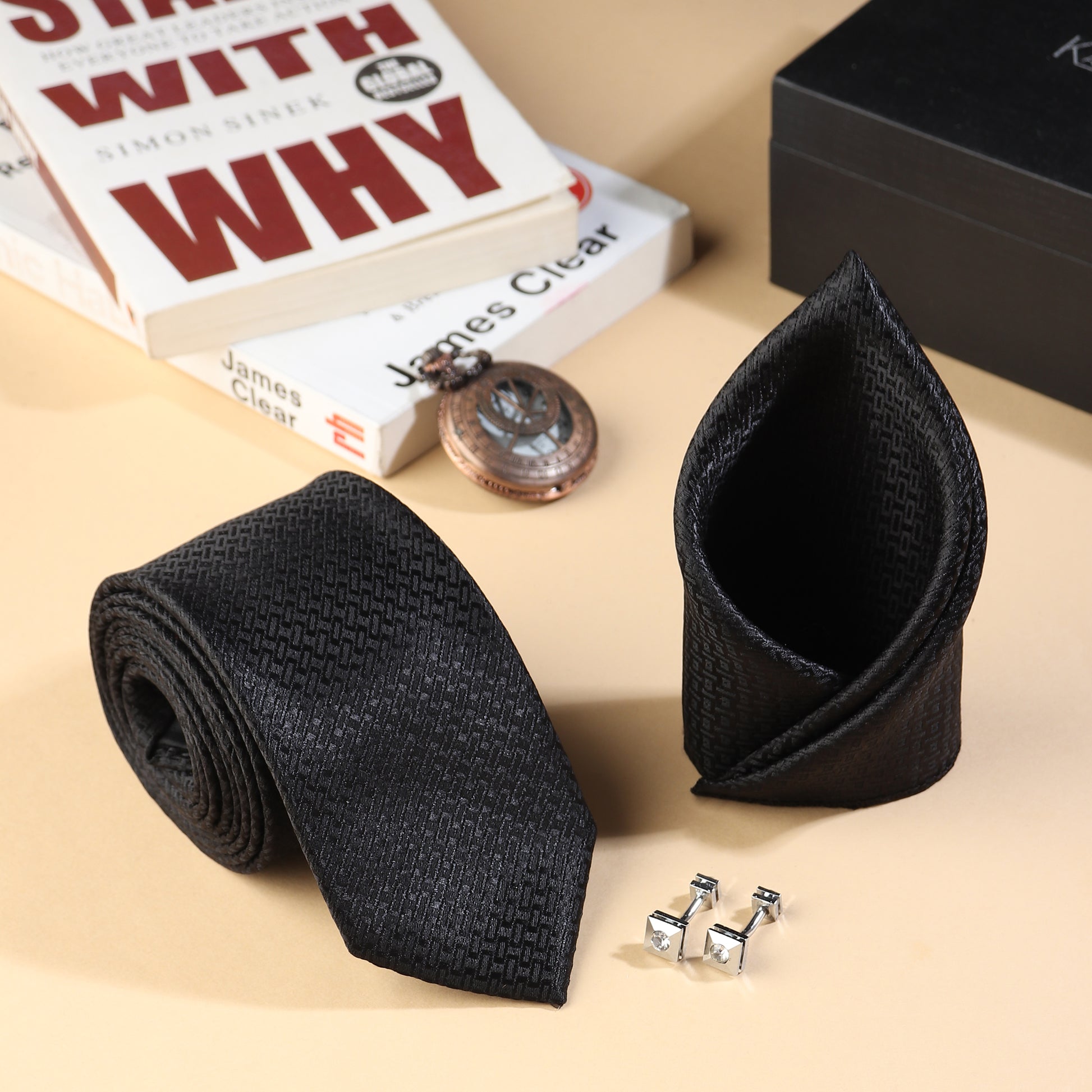Kanthlangot Men’s 3-Piece Formal Set – Black Geometric Tie, Pocket Square & Crystal Pyramid Cufflinks (3-Inch Necktie)