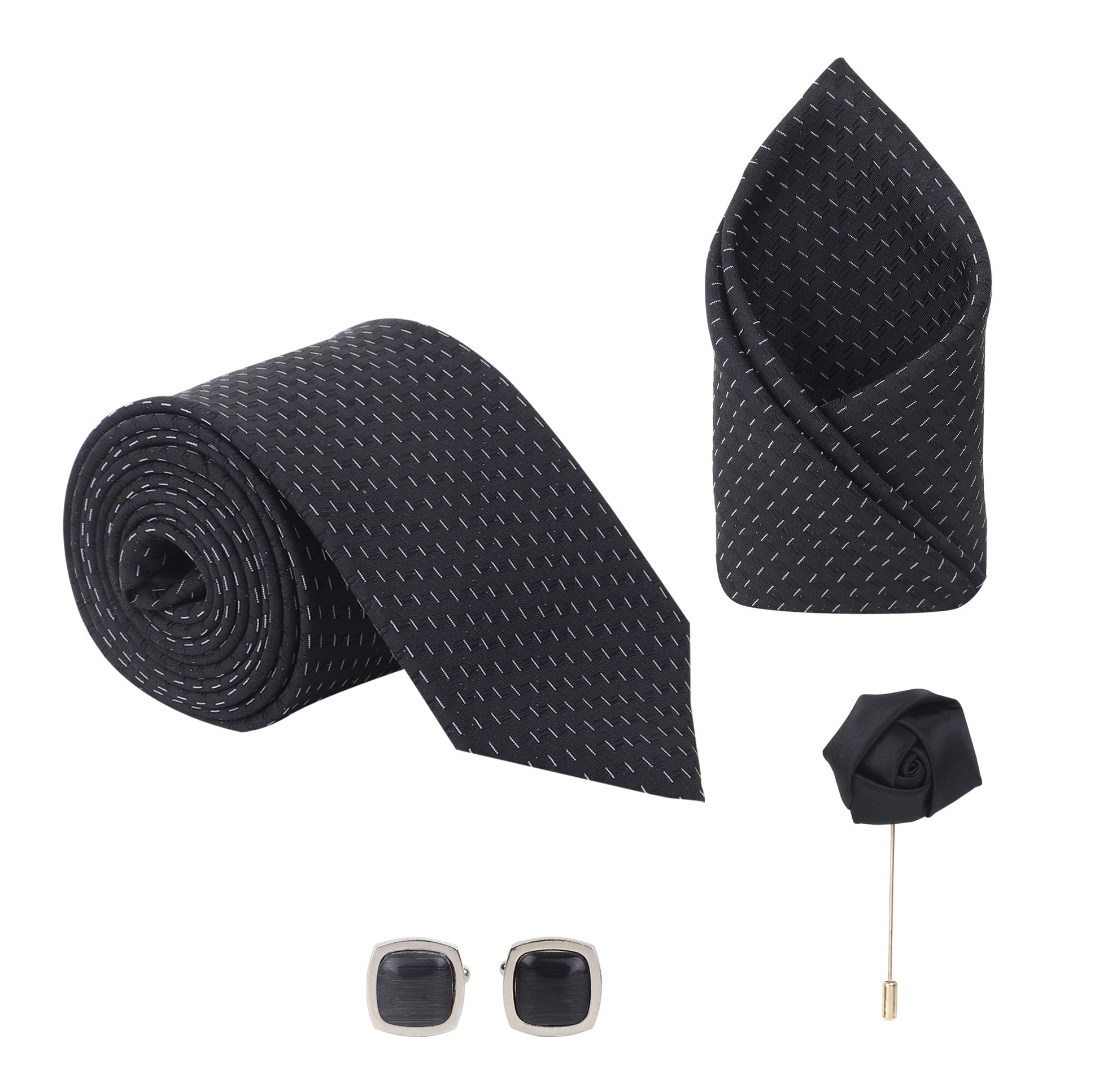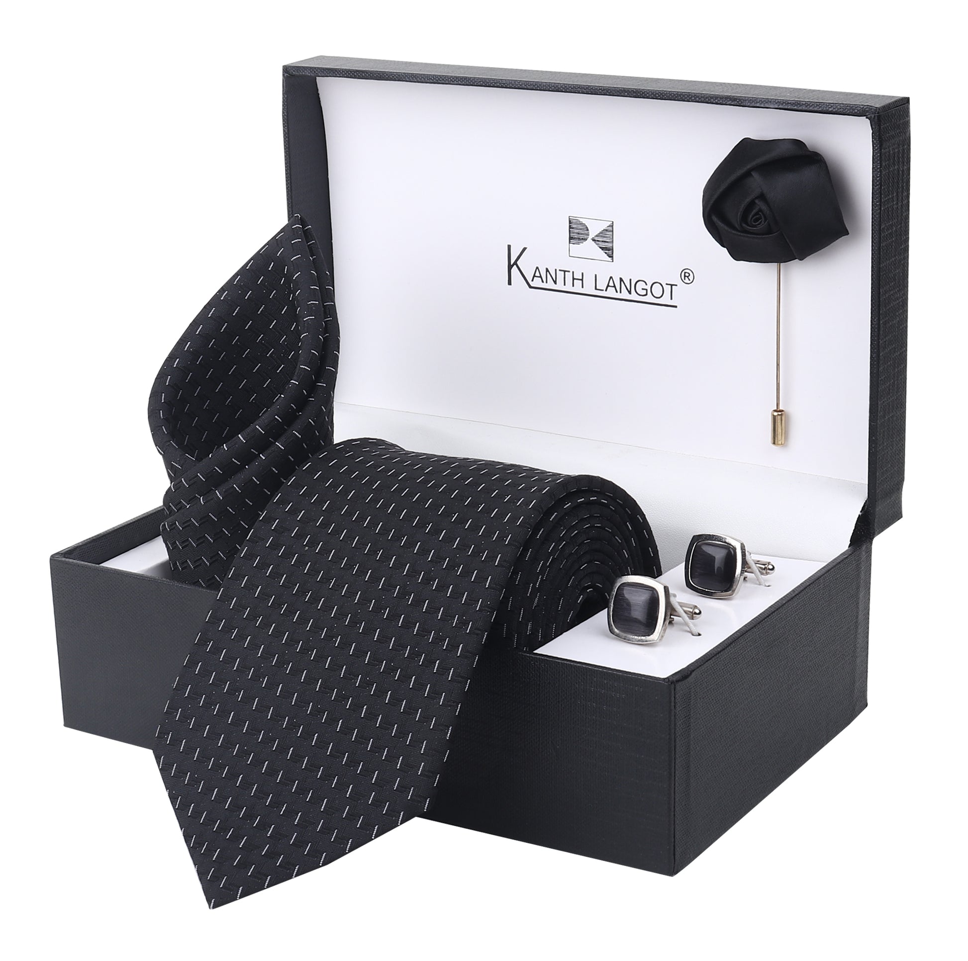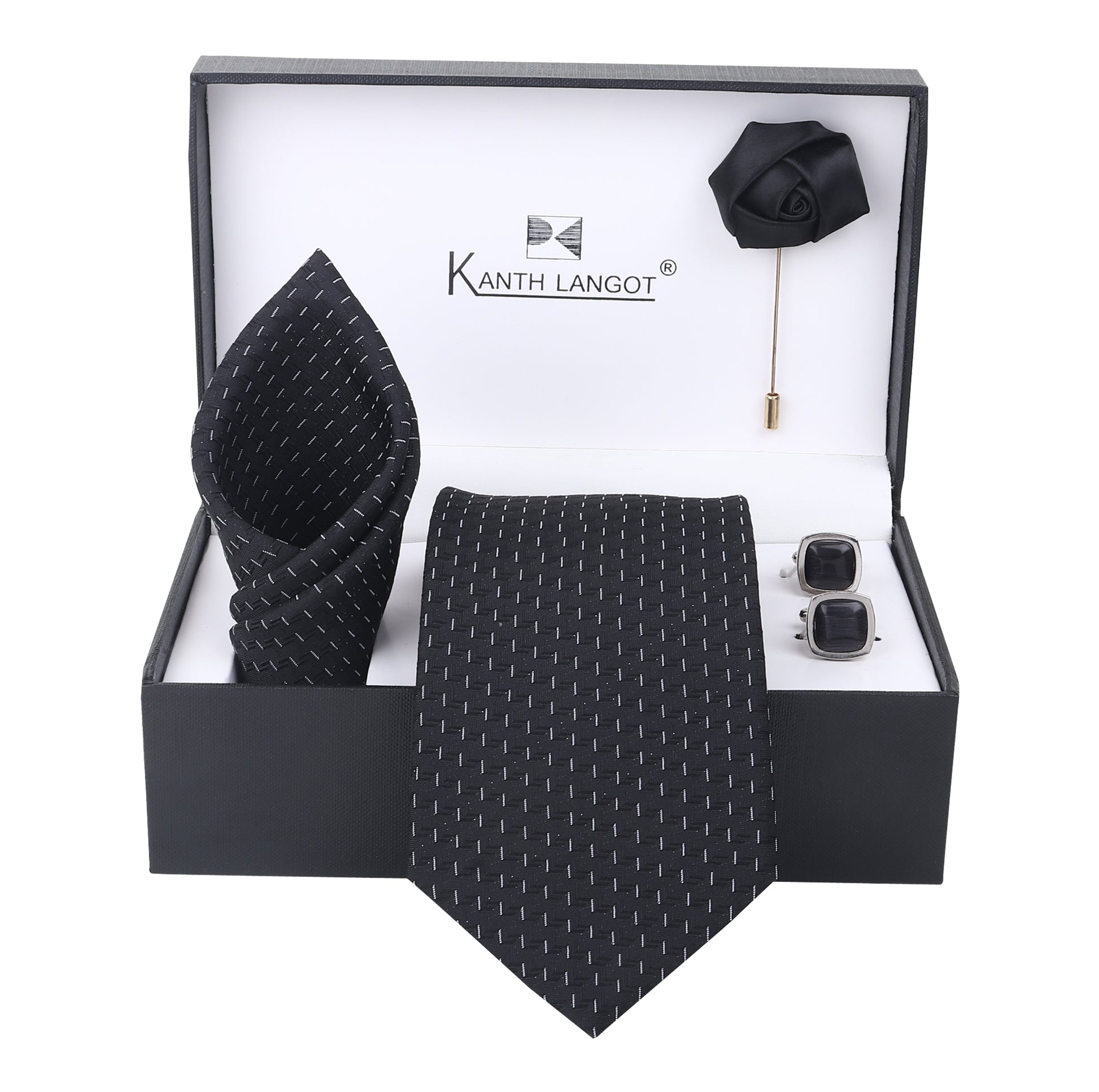 Kanthlangot Black Microdash Tie Set with Pocket Square, Cufflinks & Lapel Pin – Gift Set of 4 for Men