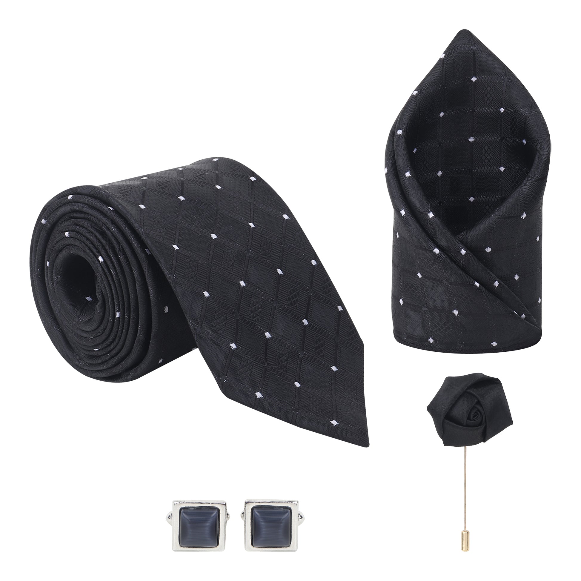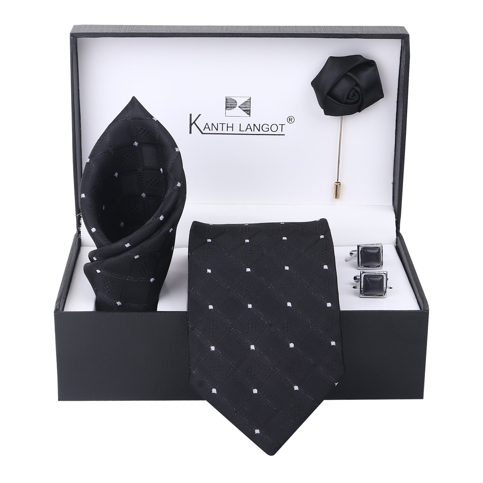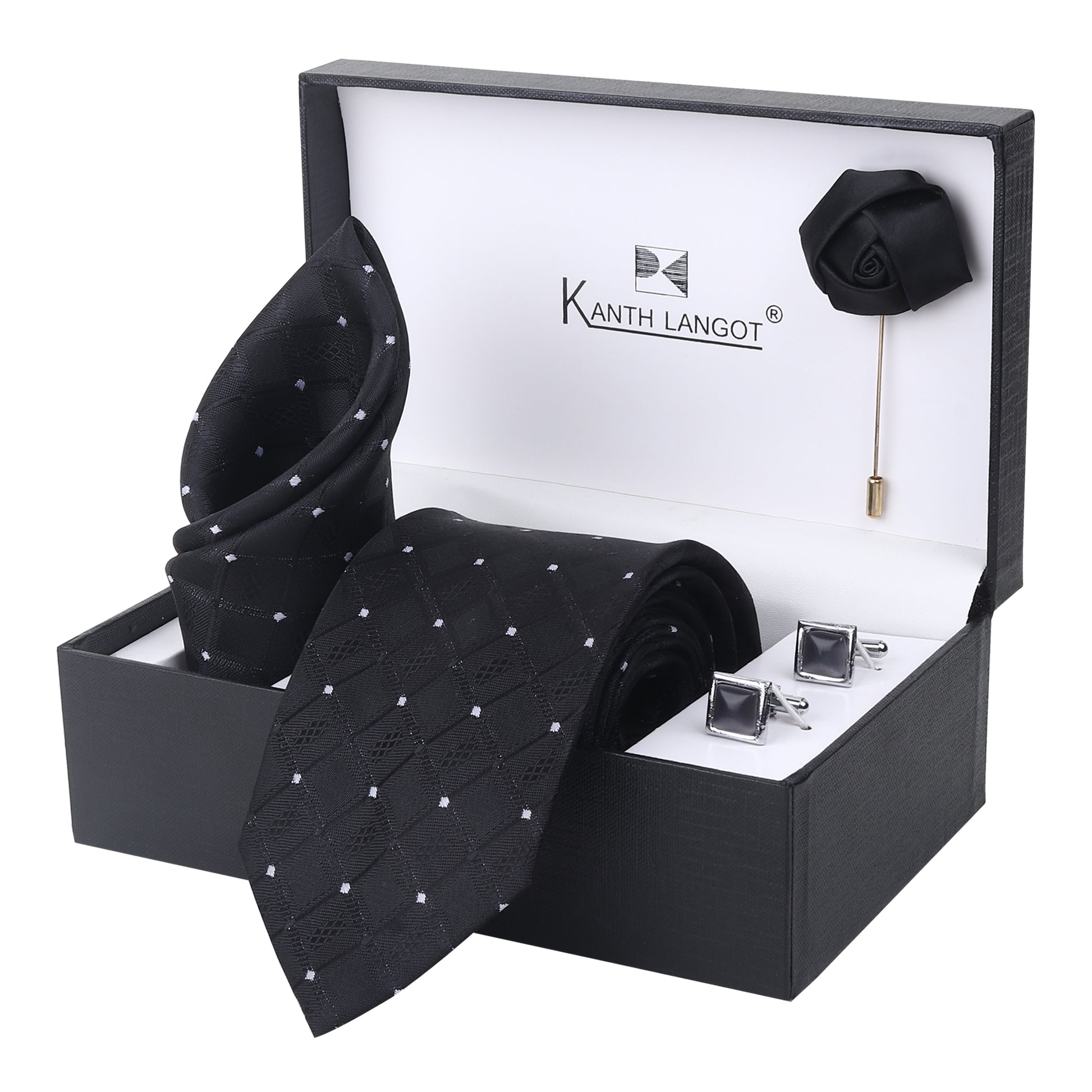 Command attention with this luxurious Kanthlangot Set of 4, featuring a black necktie with a subtle diamond-check pattern and delicate white dot detailing. The set includes a matching pocket square, a pair of smoky square cufflinks, and a black satin rose lapel pin, all housed in a stylish Kanthlangot premium gift box—a perfect blend of classic style and refined elegance.