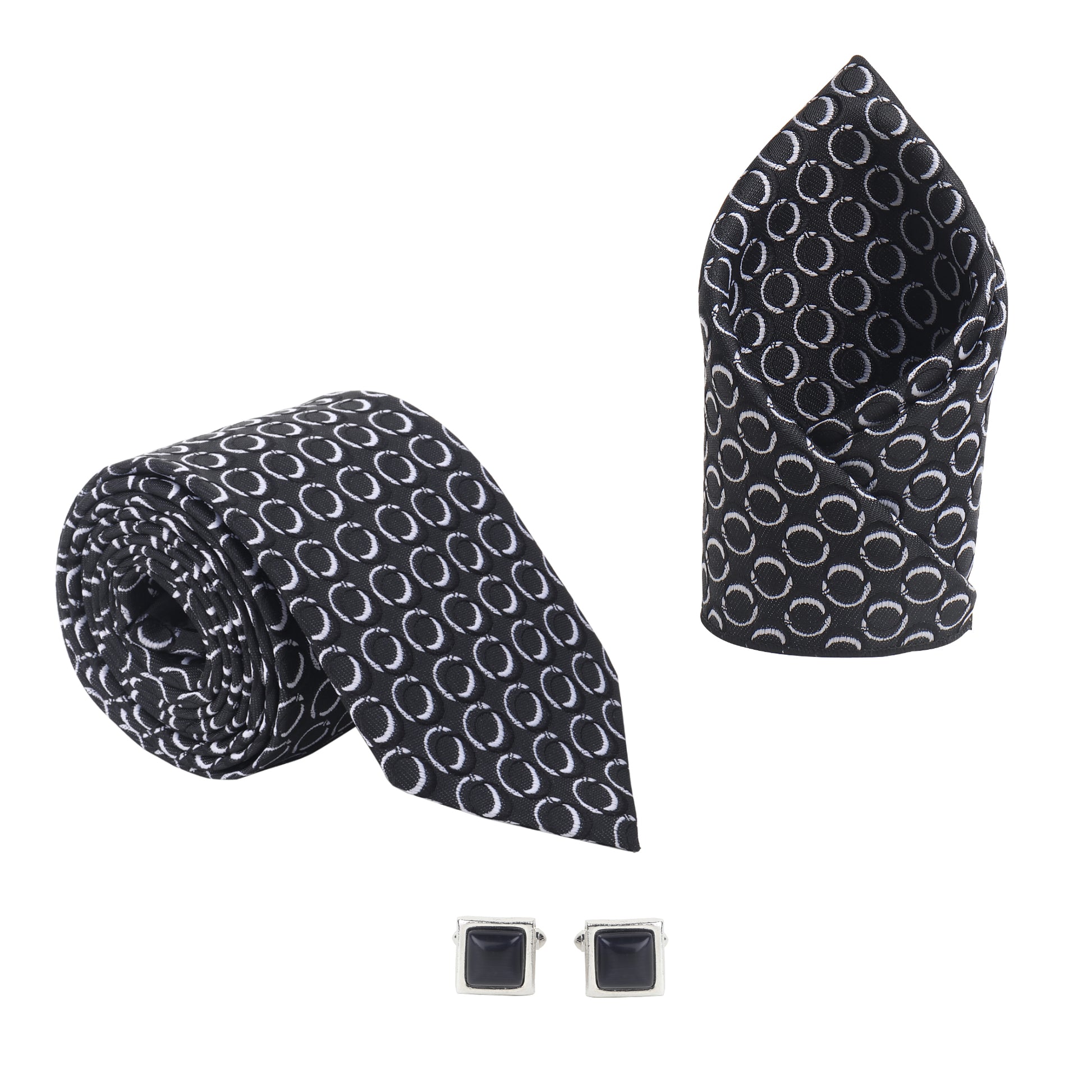 This set features a 3-inch wide necktie with a black base and clean white circular design, a matching pocket square, and square silver-tone cufflinks with bold black stones. Whether you’re heading to a celebration, business meeting, or planning a groom’s outfit, this coordinated set brings sharp sophistication to any ensemble.