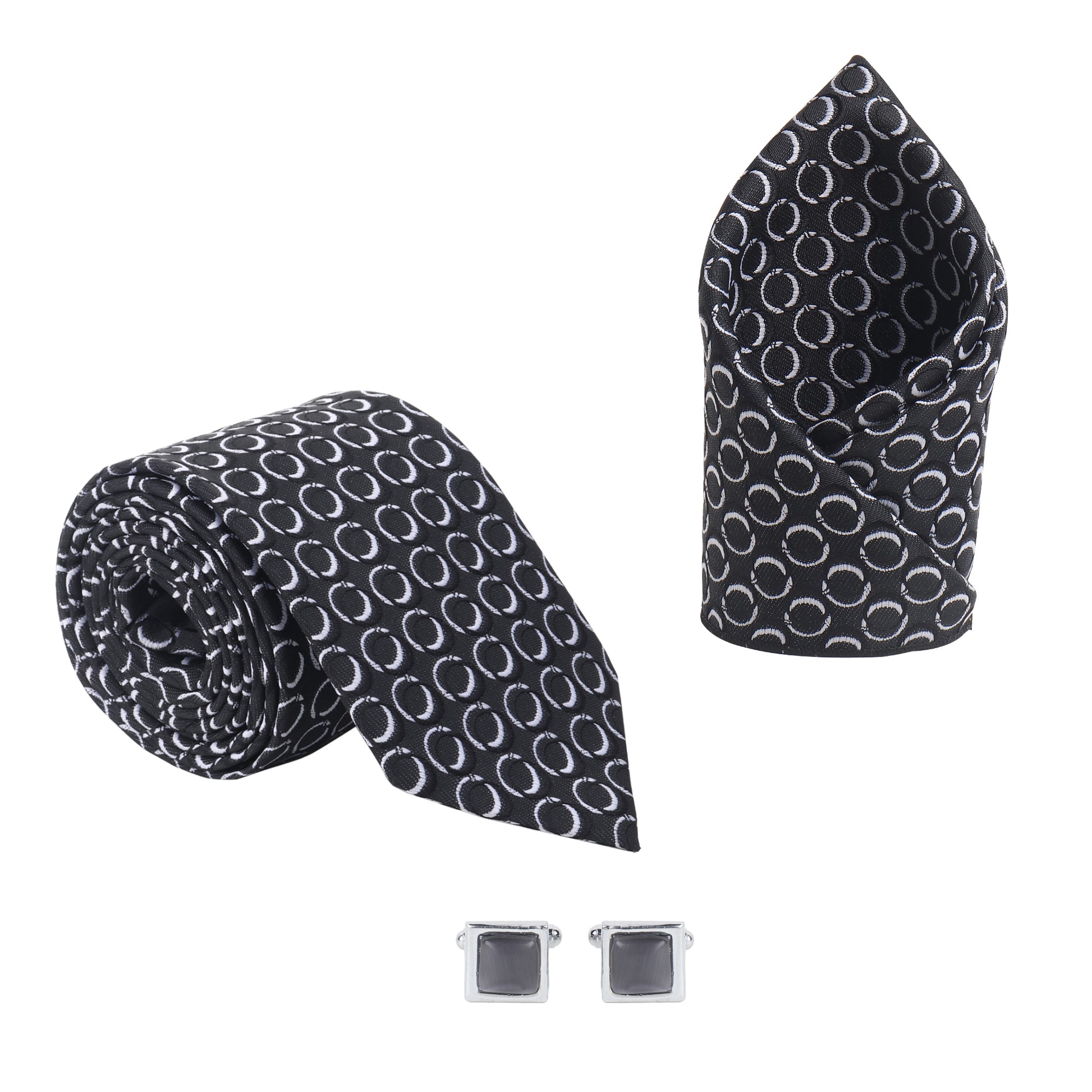 Kanthlangot Men’s 3-Piece Formal Set – Black Circle Tie, Pocket Square & Dark Grey Cufflinks (3-Inch Necktie)
