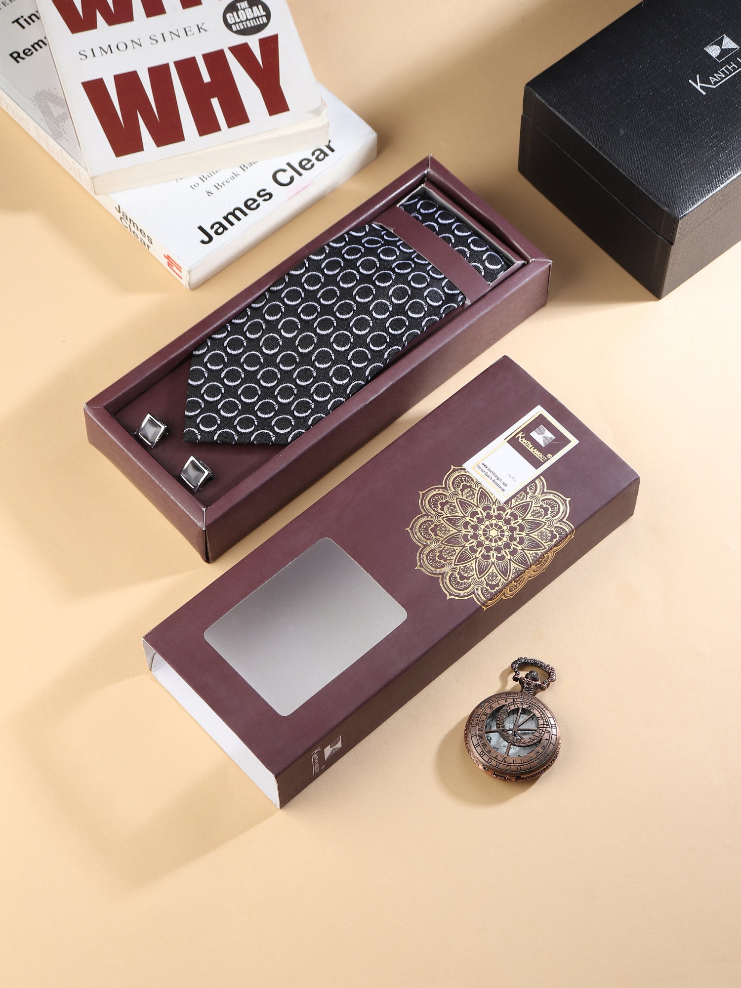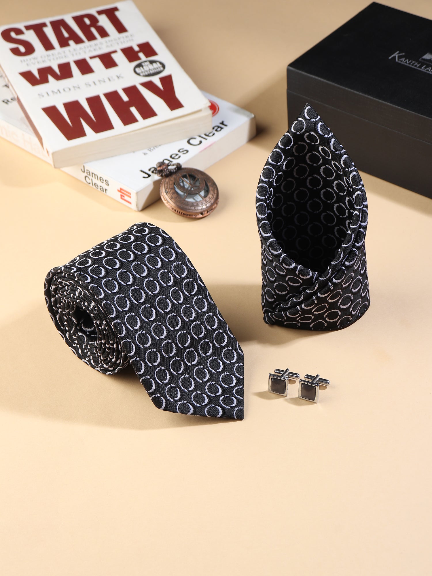 Elevate your style with the Kanthlangot Black Circle Pattern 3-Piece Men’s Accessory Set, a refined choice for any formal or festive event.