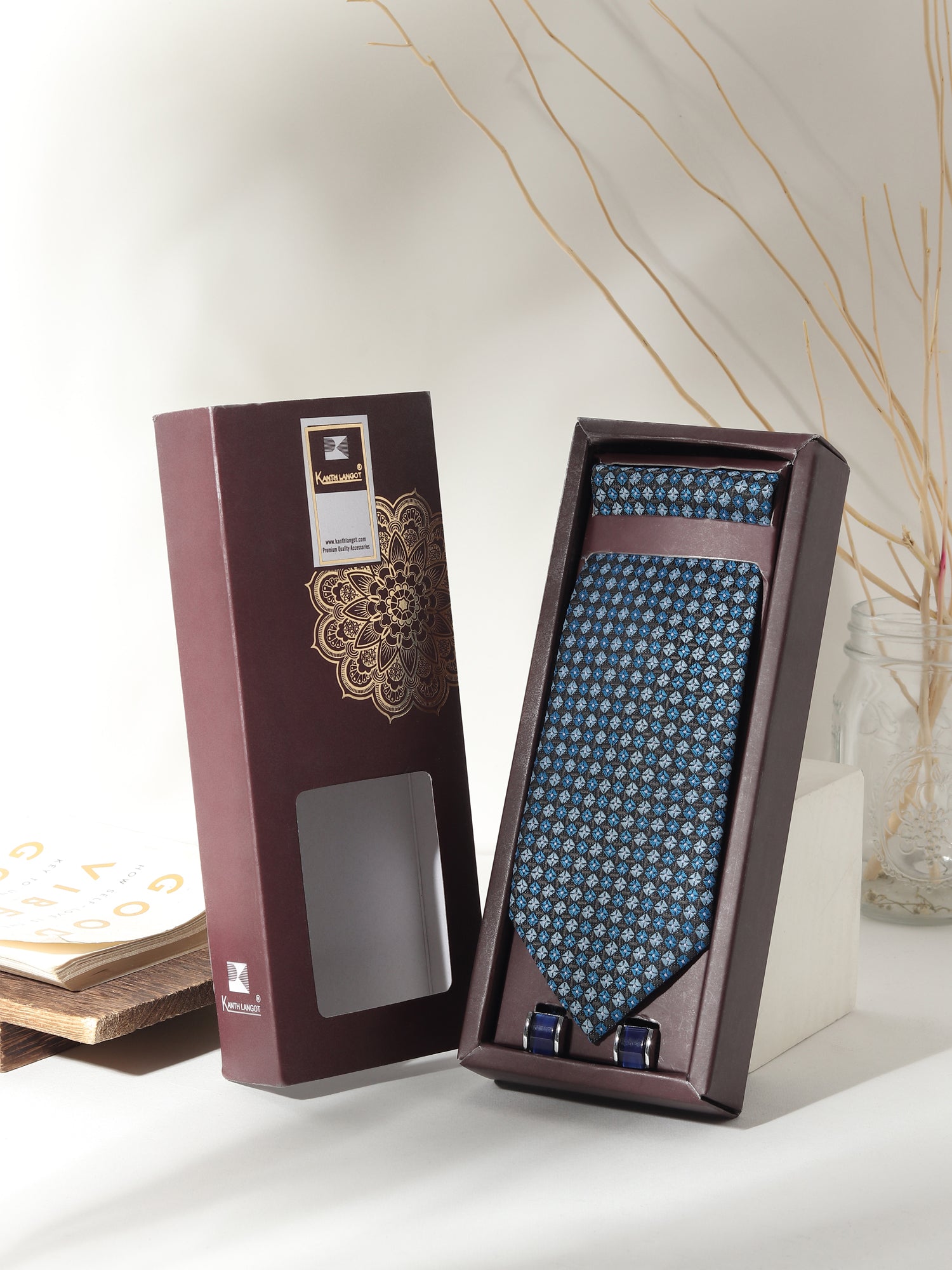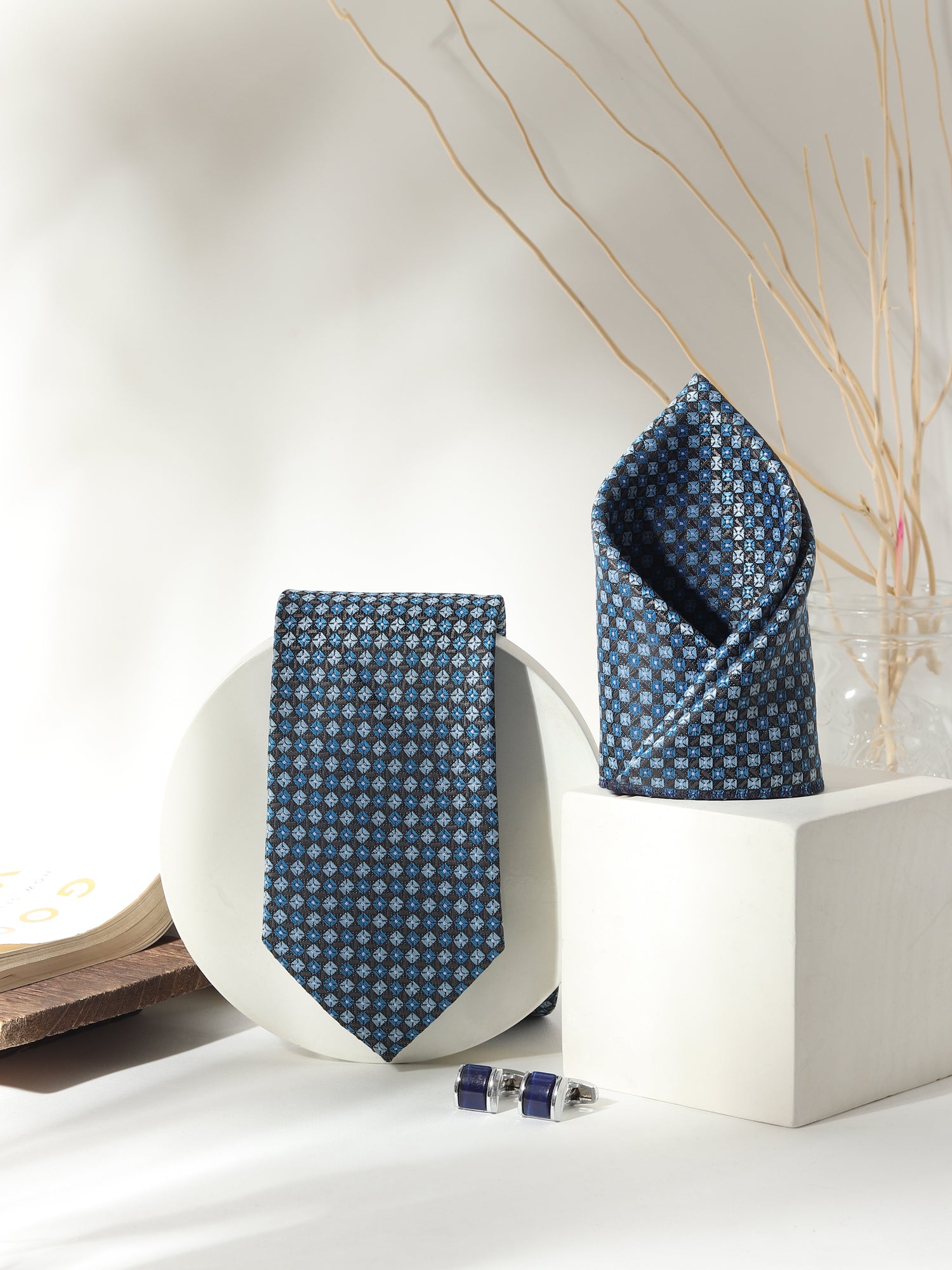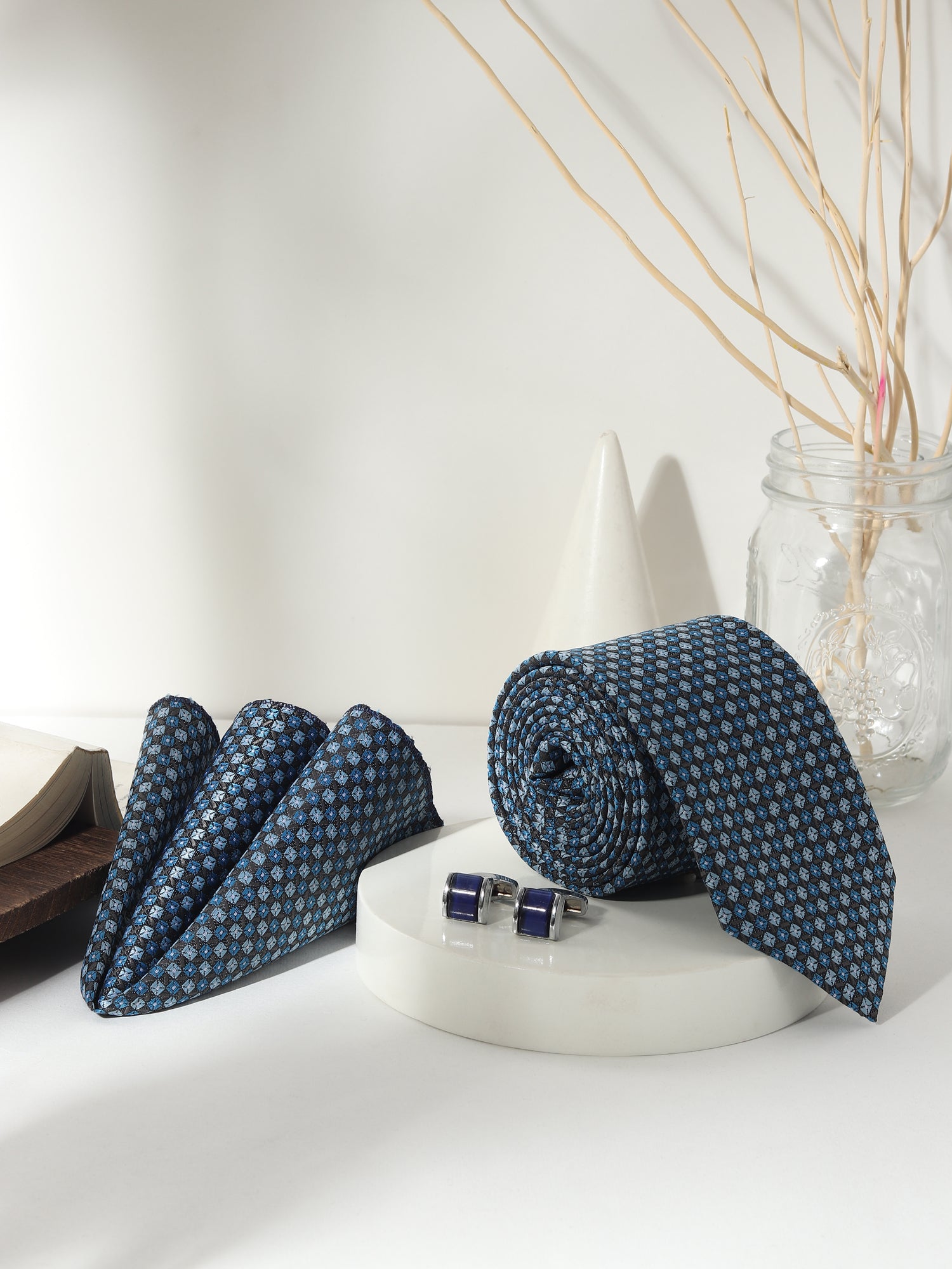 Polished, detailed, and confident—this Kanthlangot 3-piece men’s accessory set features a micro-check tie and pocket square paired with navy curved cufflinks, making it perfect for modern professionals and elegant occasions.