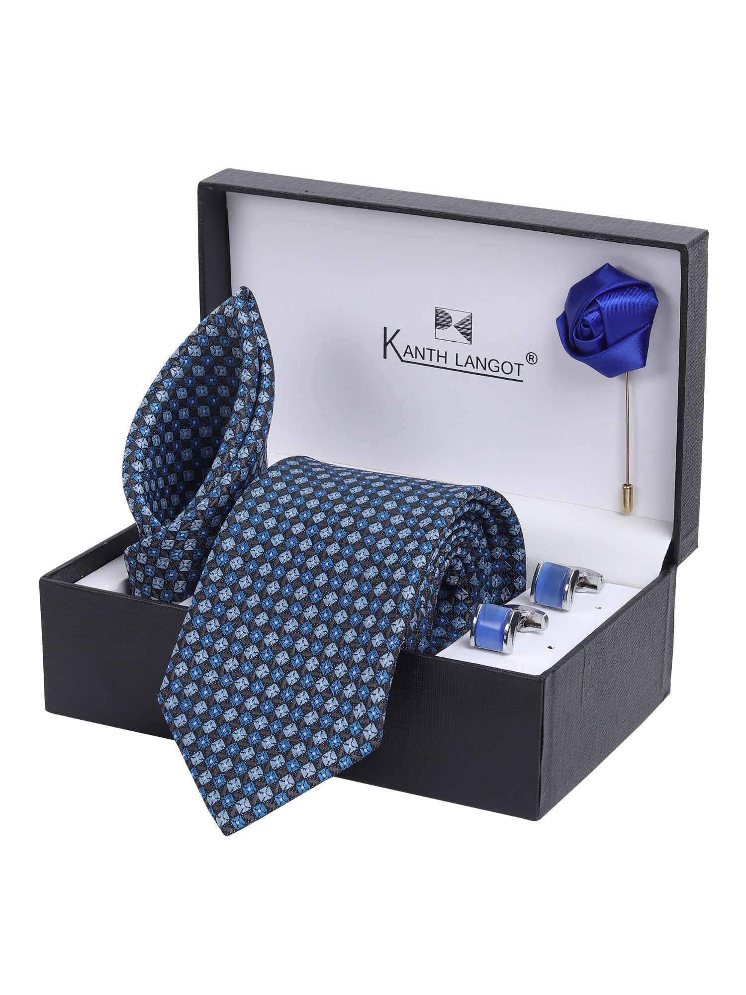 Kanthlangot Blue Checkered Necktie Gift Set with Pocket Square, Sky Blue Cufflinks & Rose Lapel Pin