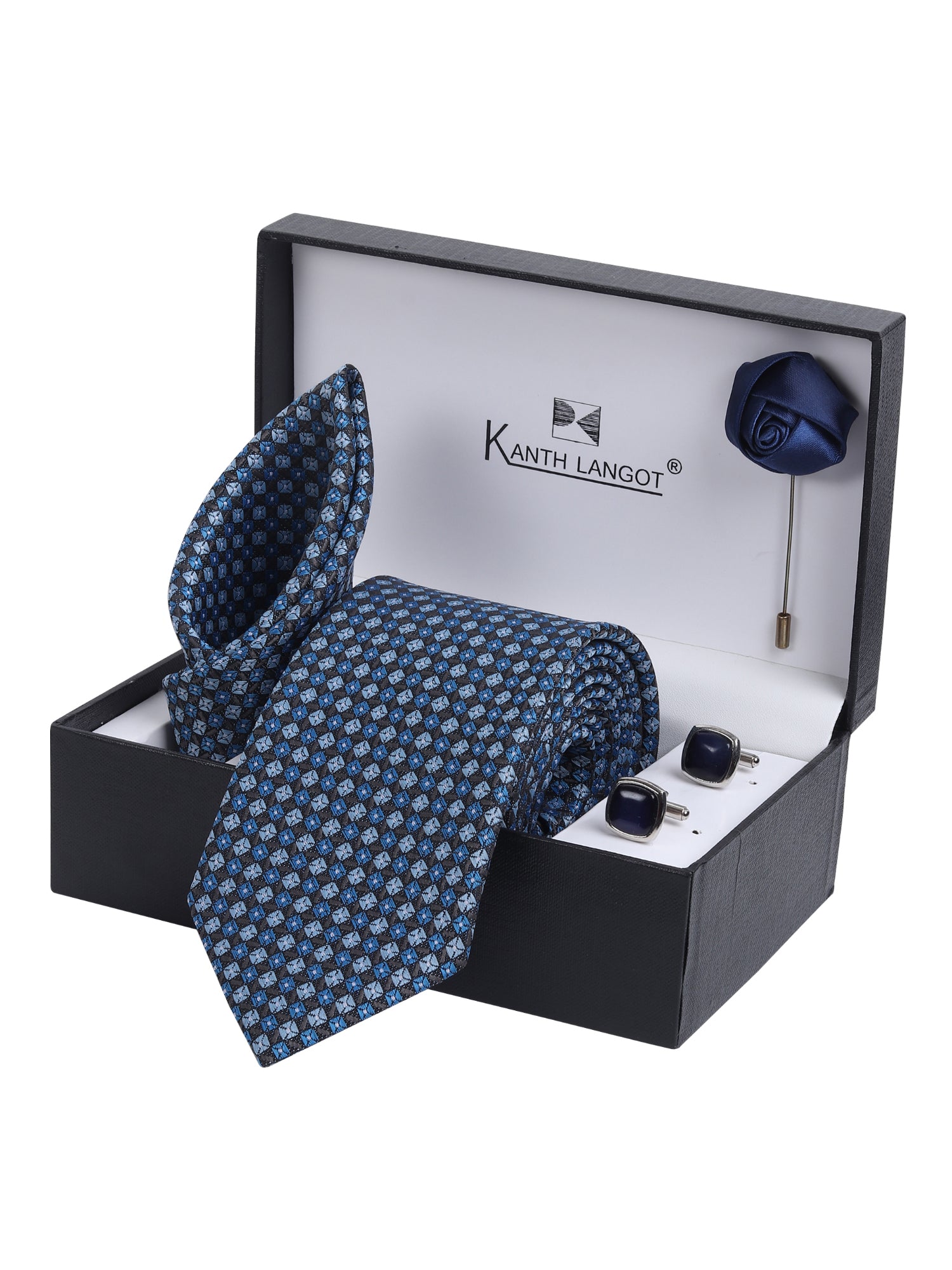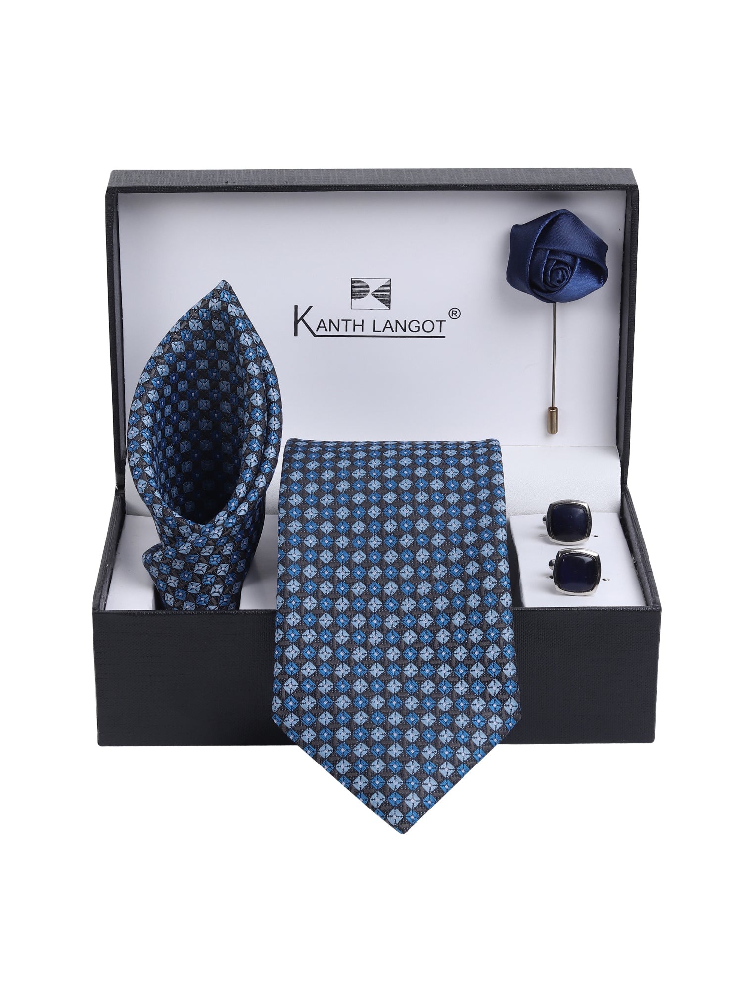 Kanthlangot Blue Checkered Necktie Gift Set with Pocket Square, Cufflinks & Lapel Pin