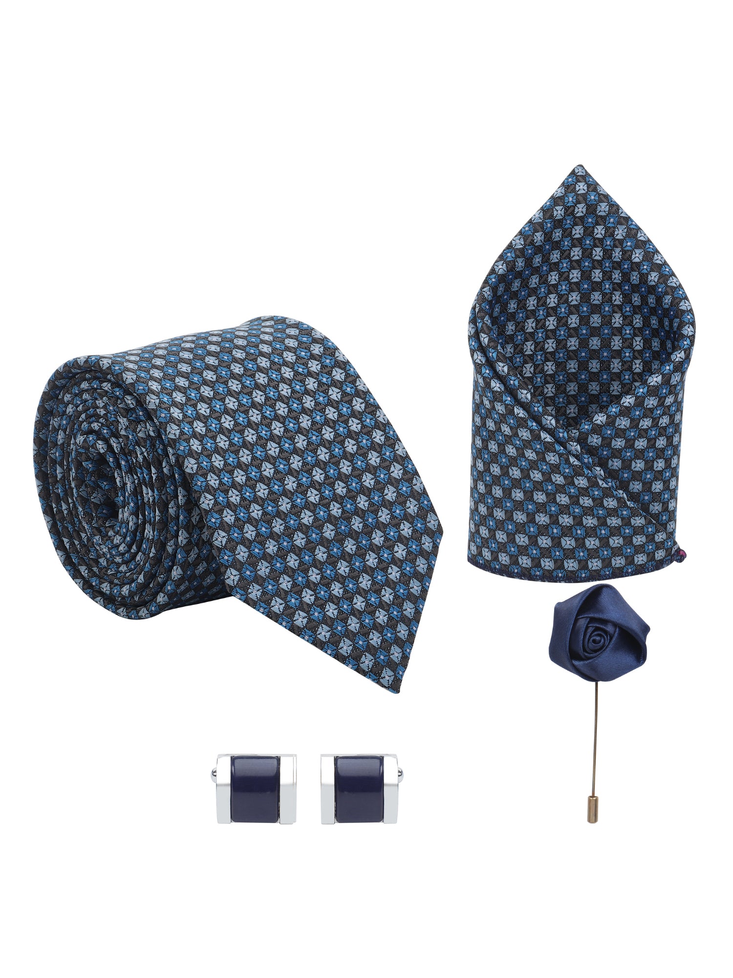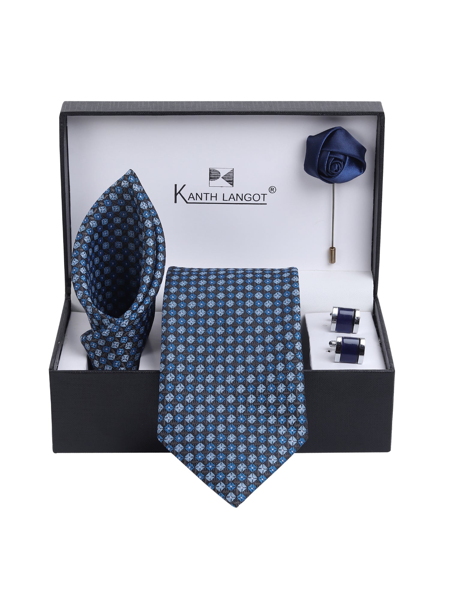 Kanthlangot Men’s Set of 4: Blue Geometric Tie, Pocket Square, Cufflinks & Lapel Pin (Premium Gift Box)