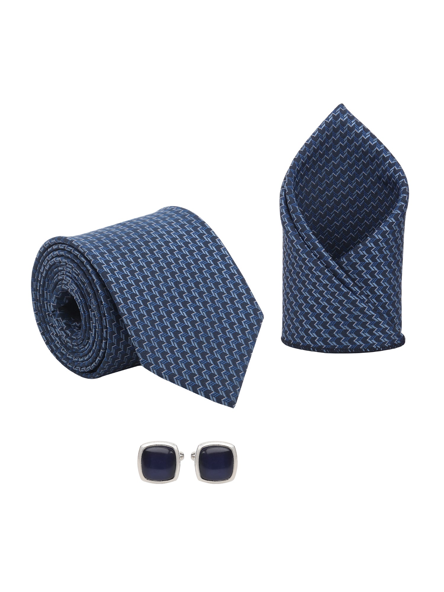 Kanthlangot Men’s 3-Piece Blue Zigzag Tie Set with Pocket Square & Navy Blue Square Cufflinks (3-Inch Necktie)