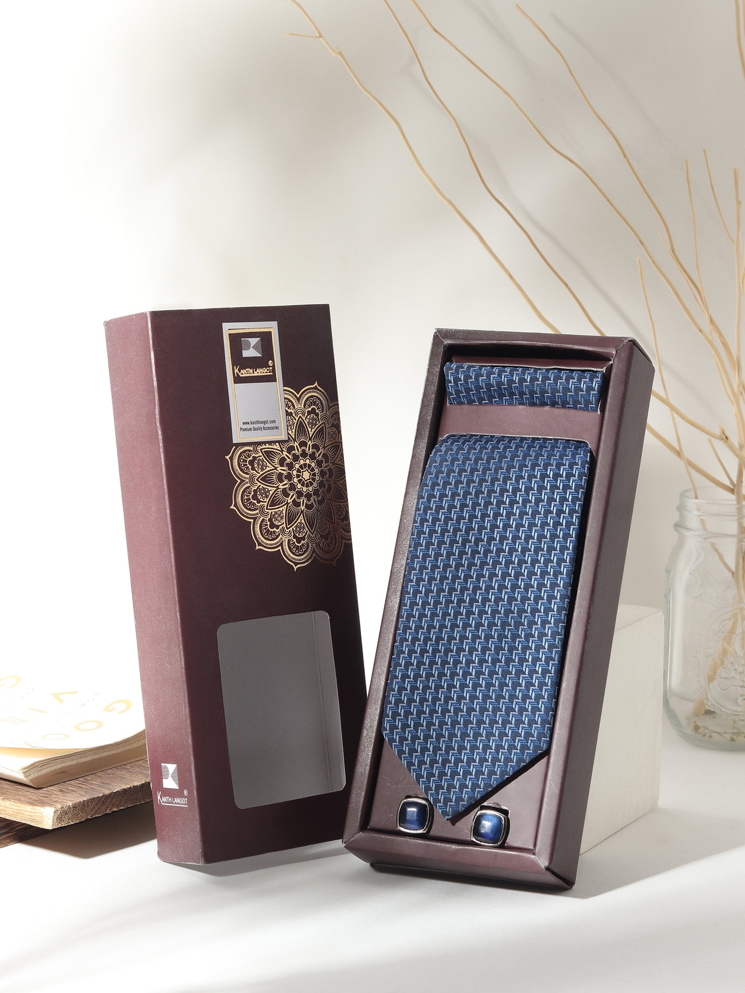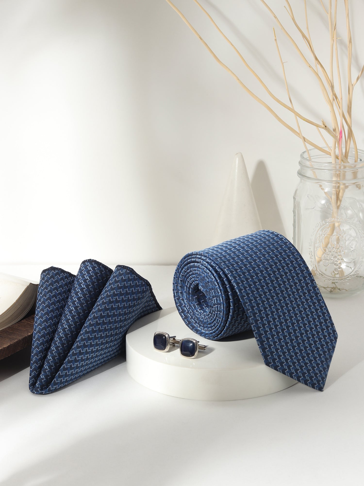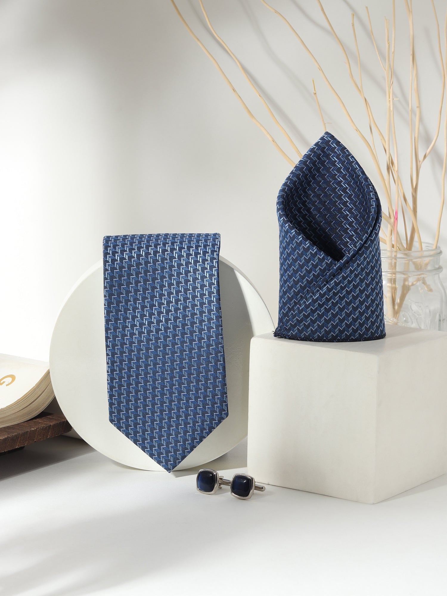 Elevate your formal wardrobe with a tie set that speaks of structured finesse. This blue zigzag-patterned necktie from Kanthlangot features a dynamic, woven texture that subtly reflects light. The square navy cufflinks in a deep gloss finish bring understated confidence to your attire.