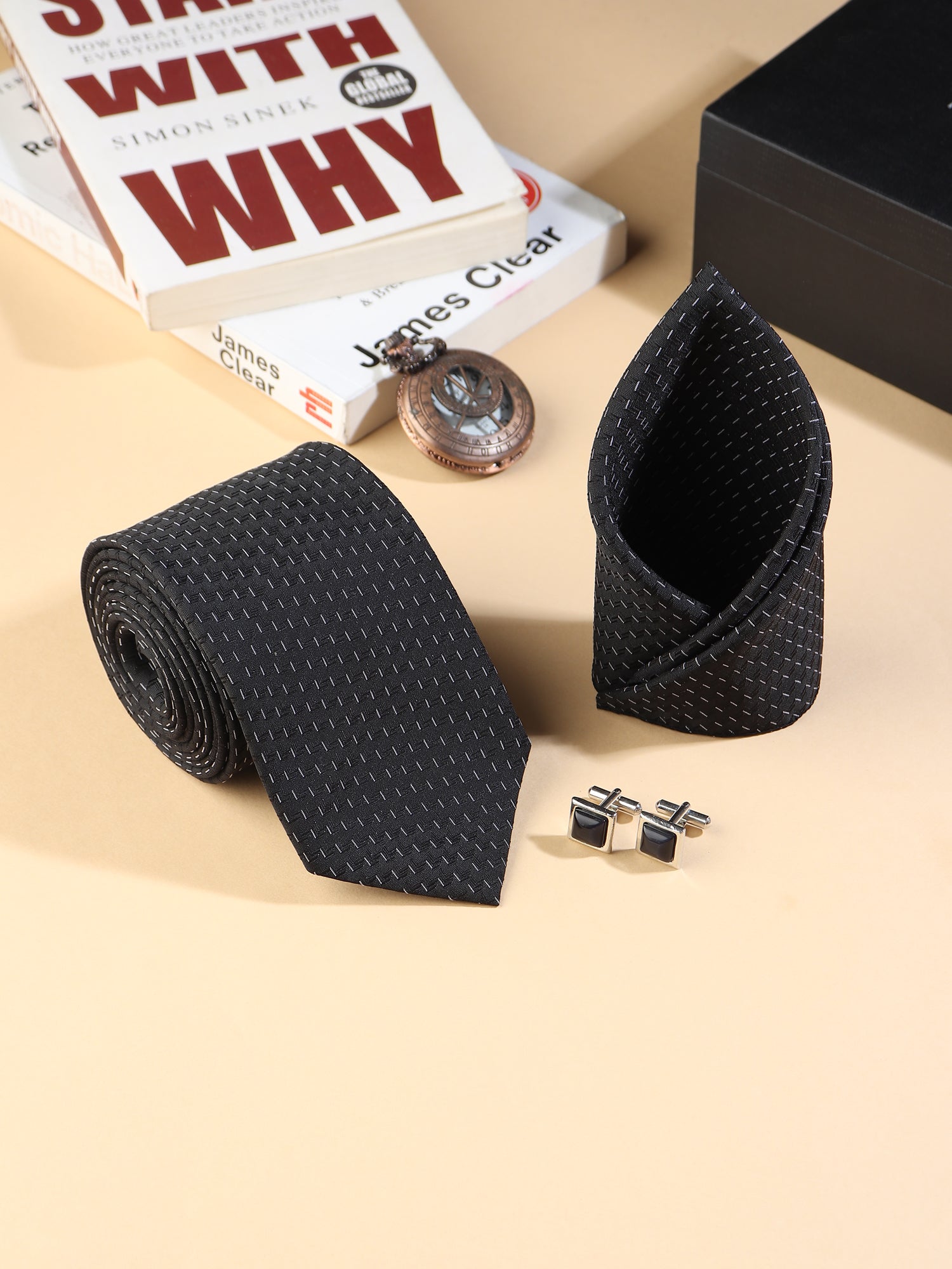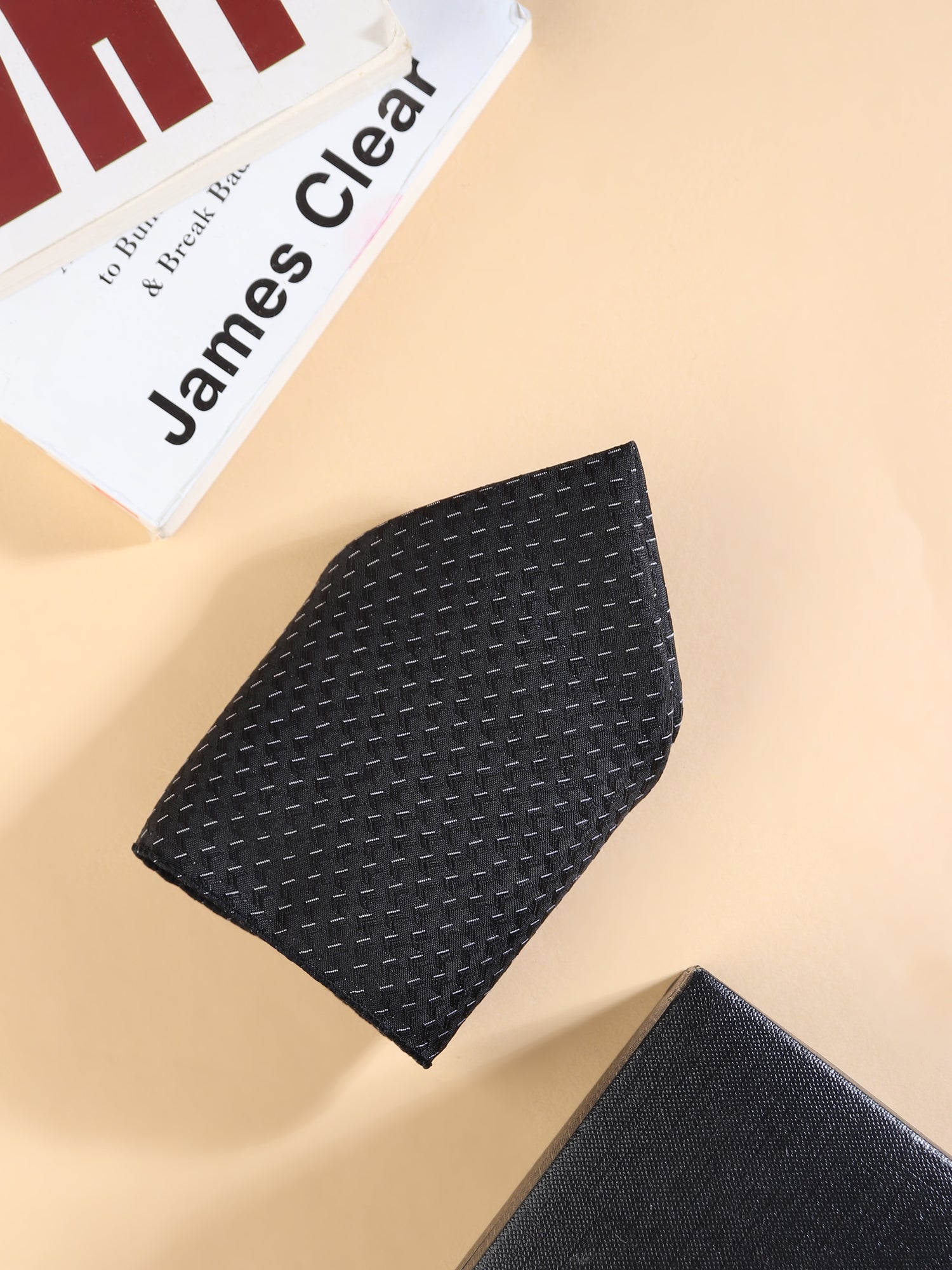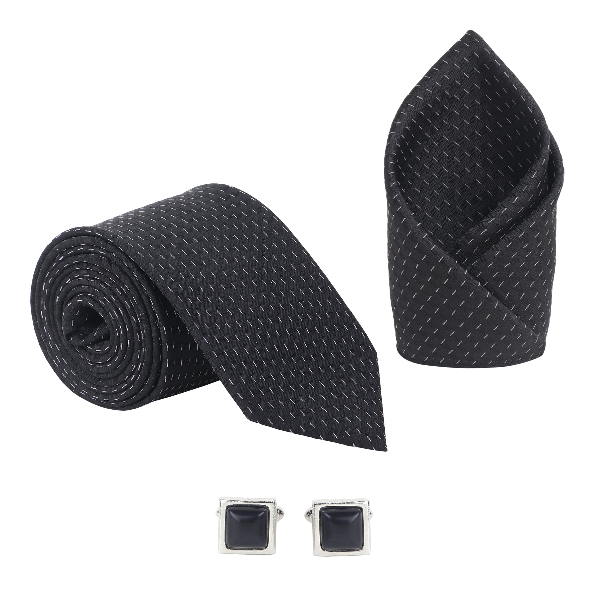 Kanthlangot Men’s 3-Piece Formal Set – Black Micro-Dash Tie, Pocket Square & Jet Black Stone Cufflinks (3-Inch Necktie)