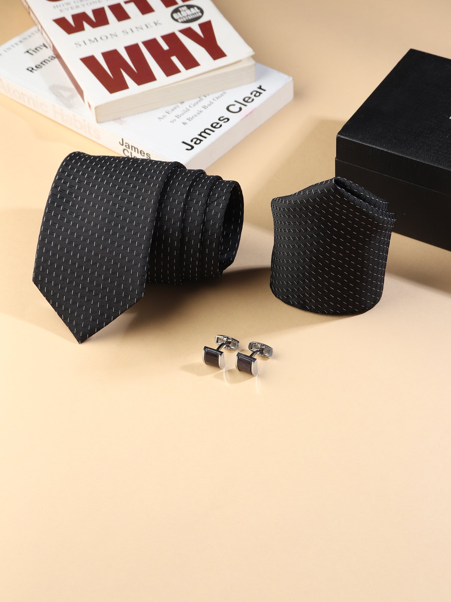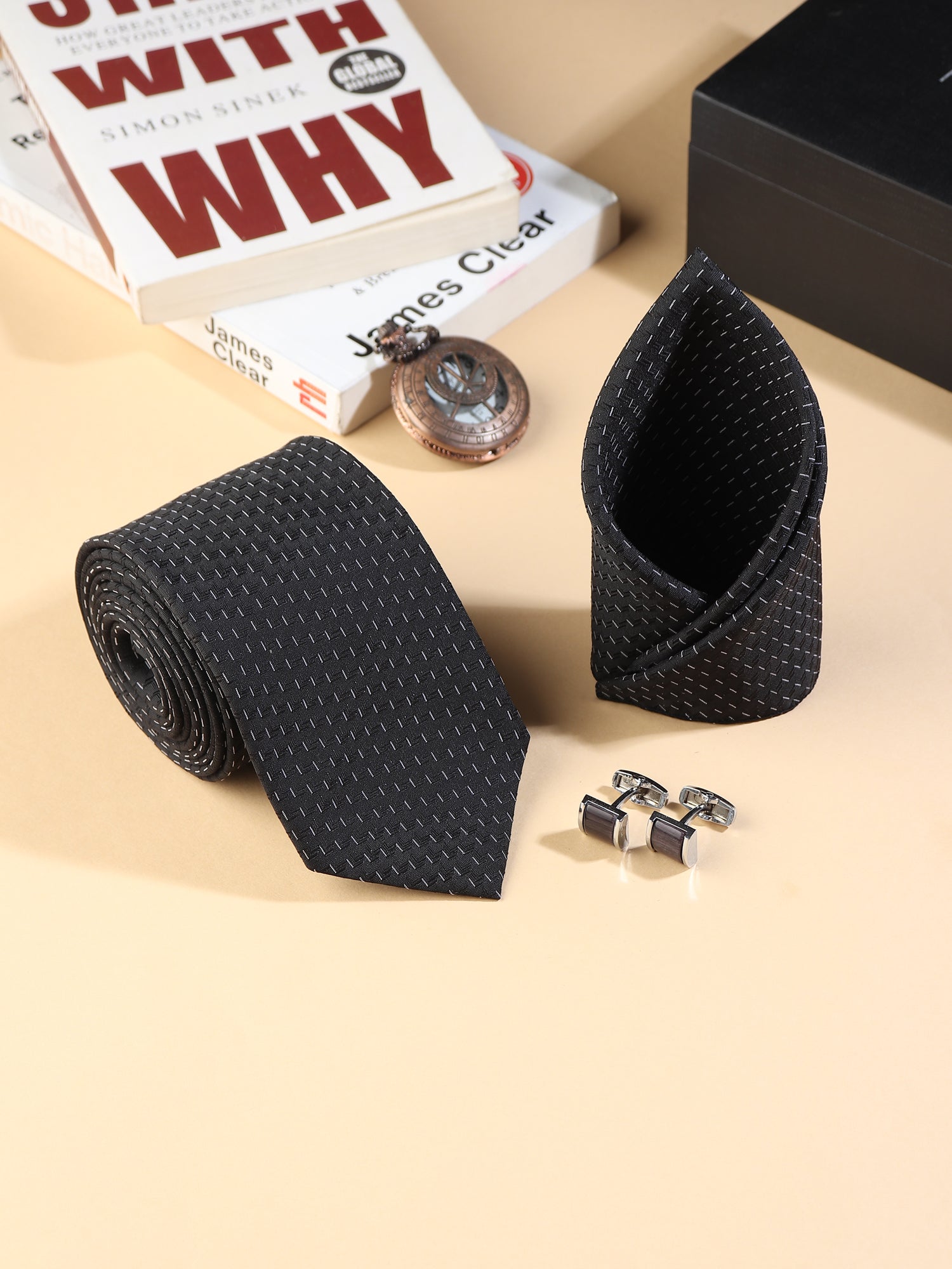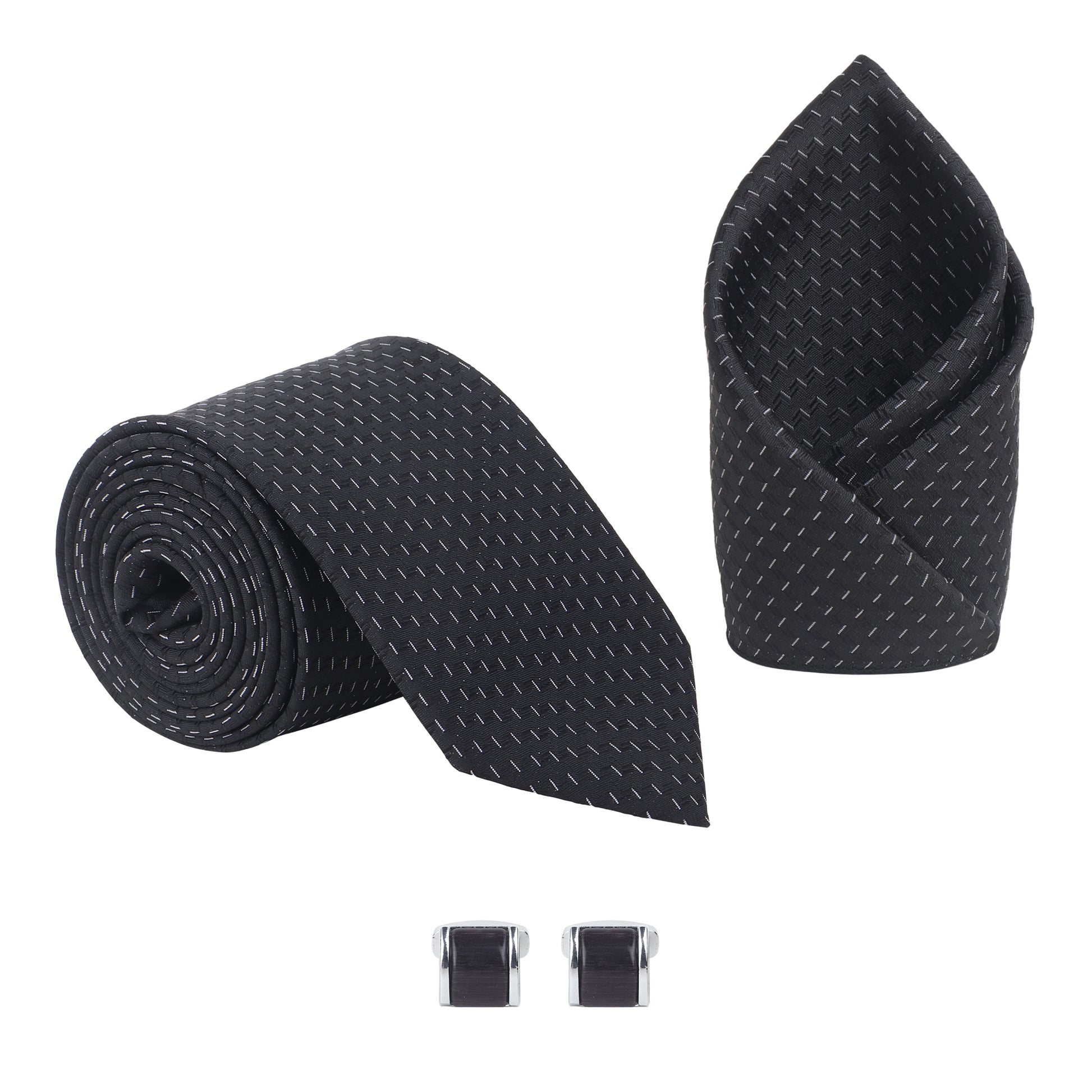 Kanthlangot Men’s 3-Piece Formal Set – Black Micro-Dash Tie, Pocket Square & Rectangular Dark Cufflinks (3-Inch Necktie)