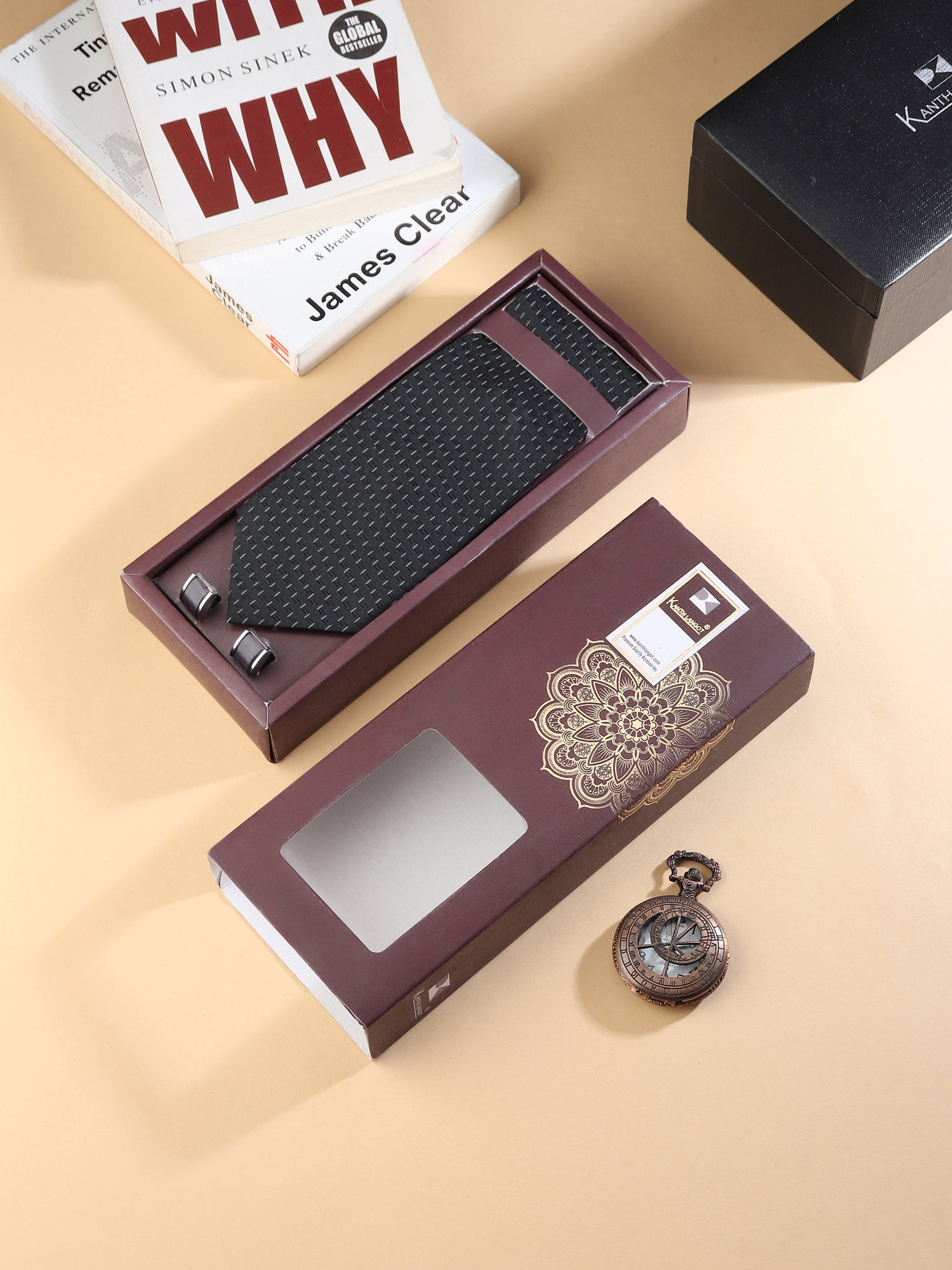 Clean, detailed, and designed for distinction, the Kanthlangot Men’s Formal Set features a black tie with a micro-dash woven pattern, a matching pocket square, and rectangular silver cufflinks with a dark stone centerpiece. The set delivers refined texture and quiet structure, perfect for modern professionals and elegant occasions.